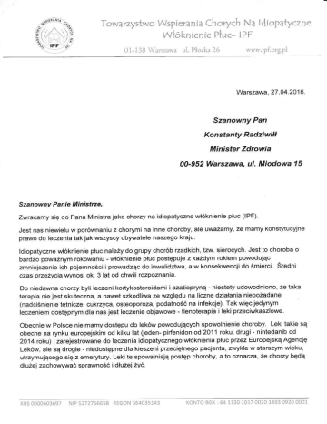 ZWracamy Się do Pana Ministra jako chorzy na idiopatyczne Włóknienie płuc (lPF),