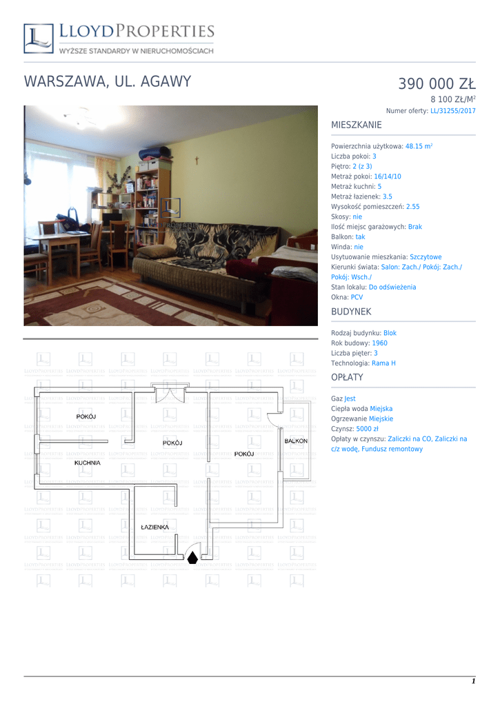 WARSZAWA, UL. AGAWY 390 000 ZŁ 8 100 ZŁ/M2 Numer oferty: LL/31255/2017 MIESZKANIE Powierzchnia użytkowa: 48.15 m2 Liczba pokoi: 3 Piętro: 2 (z 3) Metraż pokoi: 16/14/10 Metraż kuchni: 5 Metraż łazienek: 3.5 Wysokość pomieszczeń: 2.55 Skosy: nie Ilość miejsc garażowych: Brak Balkon: tak Winda: nie Usytuowanie mieszkania: Szczytowe Kierunki świata: Salon: Zach./ Pokój: Zach./ Pokój: Wsch./ Stan lokalu: Do odświeżenia Okna: PCV BUDYNEK Rodzaj budynku: Blok Rok budowy: 1960 Liczba pięter: 3 Technologia: Rama H OPŁATY Gaz Jest Ciepła woda Miejska Ogrzewanie Miejskie Czynsz: 5000 zł Opłaty w czynszu: Zaliczki na CO, Zaliczki na c/z wodę, Fundusz remontowy 1 Wojciech Zygmunt Property Expert + 48 533 300 906 [email protected] OPIS 3-pokoje do wprowadzenia!! Mieszkanie o metrażu 46,10 m2 co przekłada się na 2 oddzielne sypialnie, salon który jest przechodnim pokojem oraz oddzielną kuchnie z pełną zabudową. Z jednego z pokoi mamy dostęp do dużej loggi natomiast w salonie znajduję się balkon francuski. Mieszkanie po generalnym remoncie 9 lat temu. Obecnie odświeżone w dobrym stanie. Nowe okna, instalacja elektryczna. Na podłodze parkiet dębowy raz cyklinowany, w kuchni i łazience terakota. Cicha i spokojna okolica!! Mieszkanie zlokalizowane jest w bardzo atrakcyjnym punkcie Woli. Bliskość ulic Górczewskiej i Obozowej zapewni szybki dojazd do centrum (15 min), a zaplanowana stacja metra (będzie zlokalizowana w odległości ok 150 m), w przyszłości jeszcze bardziej usprawni komunikację z pozostałą częścią miasta. W najbliższym otoczeniu znajdziemy punkty usługowo-handlowe, restauracje, placówki banku, pocztę, apteki oraz placówki oświatowe. Liczne tereny zielone oraz hale sportowe, basen pozwolą na aktywny wypoczynek. Zapraszam do oglądania mieszkania, Wojciech Zygmunt 533 300 906 [email protected] Cicha i spokojna okolica!! Mieszkanie zlokalizowane jest w bardzo atrakcyjnym punkcie Woli. Bliskość ulic Górczewskiej i Obozowej zapewni szybki dojazd do centrum (15 min), a zaplanowana stacja metra (będzie zlokalizowana w odległości ok 150 m), w przyszłości jeszcze bardziej usprawni komunikację z pozostałą częścią miasta. W najbliższym otoczeniu znajdziemy punkty usługowo-handlowe, restauracje, placówki banku, pocztę, apteki oraz placówki oświatowe. Liczne tereny zielone oraz hale sportowe, basen pozwolą na aktywny wypoczynek. W najbliższej okolicy planowana stacja II-linii metra!! Budynek z lat 60 pobudowany w technologi Rama-H. Na przestrzeni ostatnich lat przeszedł gruntowny remont. Nowa elewacja. 2