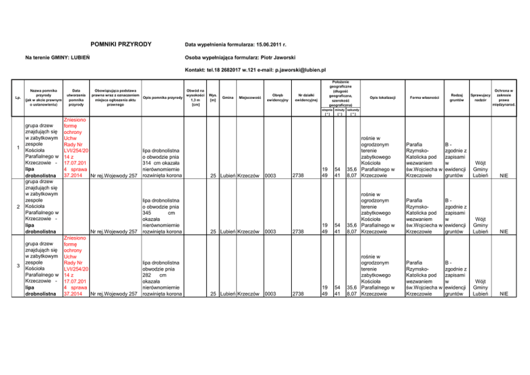 POMNIKI PRZYRODY Na terenie GMINY: LUBIEŃ Data wypełnienia formularza: 15.06.2011 r. Osoba wypełniająca formularz: Piotr Jaworski Kontakt: tel.18 2682017 w.121 e-mail: [email protected] Lp. Nazwa pomnika przyrody (jak w akcie prawnym o ustanowieniu) Data utworzenia pomnika przyrody Obowiązująca podstawa prawna wraz z oznaczeniem miejsca ogłoszenia aktu prawnego Opis pomnika przyrody Obwód na wysokości 1,3 m [cm] Wys. [m] Gmina Miejscowość Obręb ewidencyjny Położenie geograficzne (długość geograficzna, szerokość geograficzna) Nr działki ewidencyjnej Ochrona w zakresie prawa międzynarod. Forma własności Rodzaj gruntów Sprawujacy nadzór 54 41 rośnie w ogrodzonym terenie zabytkowego Kościoła 35,6 Parafialnego w 8,07 Krzeczowie Parafia RzymskoKatolicka pod wezwaniem św.Wojciecha w Krzeczowie Bzgodnie z zapisami w ewidencji gruntów Wójt Gminy Lubień NIE 54 41 rośnie w ogrodzonym terenie zabytkowego Kościoła 35,6 Parafialnego w 8,07 Krzeczowie Parafia RzymskoKatolicka pod wezwaniem św.Wojciecha w Krzeczowie Bzgodnie z zapisami w ewidencji gruntów Wójt Gminy Lubień NIE 54 41 rośnie w ogrodzonym terenie zabytkowego Kościoła 35,6 Parafialnego w 8,07 Krzeczowie Parafia RzymskoKatolicka pod wezwaniem św.Wojciecha w Krzeczowie Bzgodnie z zapisami w ewidencji gruntów Wójt Gminy Lubień NIE Opis lokalizacji stopnie minuty sekundy [°] ['] [ '' ] 1 2 3 grupa drzew znajdująch się w zabytkowym zespole Kościoła Parafialnego w Krzeczowie lipa drobnolistna grupa drzew znajdująch się w zabytkowym zespole Kościoła Parafialnego w Krzeczowie lipa drobnolistna grupa drzew znajdująch się w zabytkowym zespole Kościoła Parafialnego w Krzeczowie lipa drobnolistna Zniesiono formę ochrony Uchw Rady Nr LVI/254/20 14 z 17.07.201 4 sprawa 37.2014 Nr rej.Wojewody 257 Nr rej.Wojewody 257 Zniesiono formę ochrony Uchw Rady Nr LVI/254/20 14 z 17.07.201 4 sprawa 37.2014 Nr rej.Wojewody 257 lipa drobnolistna o obwodzie pnia 314 cm okazała nierównomiernie rozwinięta korona lipa drobnolistna o obwodzie pnia 345 cm okazała nierównomiernie rozwinięta korona lipa drobnolistna obwodzie pnia 282 cm okazała nierównomiernie rozwinięta korona 25 Lubień Krzeczów 25 Lubień Krzeczów 25 Lubień Krzeczów 0003 0003 0003 2738 2738 2738 19 49 19 49 19 49 4 grupa drzew znajdująch się w zabytkowym zespole Kościoła Parafialnego w Krzeczowie dąb szypułkowy brak danych Nr rej.Wojewody 257 5 lipa drobnolistna Nr rej.Wojewody 132 dąb szypułkowy o obwodzie pnia 439 cm okazały równomiernie rozwinięta korona lipa drobnolistna o obwodzie pnia 326 cm okazała równomiernie rozwinięta korona 25 Lubień Krzeczów 25 Lubień Krzeczów 0003 0004 2737 2105/3 19 49 19 49 54 41 rośnie przy ogrodzonym terenie zabytkowego 34,2 Kościoła 2 Parafialnego w 7,76 Krzeczowie 54 40 rośnie przy drodze krajowej nr 7 strona lewa i skrzyżowaniu z drogą gminną, obok stoi 46,2 zabytkowa 646. kapliczka św.Jana 87 Nepomucena osoba fizyczna ŁIV zgodnie z zapisami w ewidencji gruntów Wójt Gminy Lubień NIE 54 41 rośnie przy drodze gminnej strona prawa rola Pytlowa obok basenu przeciwpoż. w odległości około 300 m w kierunku północnozachodnim od zabytkowego 26,7 Kościoła 616. Parafialnego w 58 Krzeczowie osoba fizyczna RIVb zgodnie z zapisami w ewidencji gruntów Wójt Gminy Lubień NIE 54 41 rośnie przy drodze gminnej strona prawa rola Pytlowa obok basenu przeciwpoż. w odległości około 300 m w kierunku północnozachodnim od zabytkowego 26,7 Kościoła 616. Parafialnego w 58 Krzeczowie osoby fizyczne RIVb zgodnie z zapisami w ewidencji gruntów Wójt Gminy Lubień NIE 6 lipa drobnolistna Nr rej.Wojewody 133 lipa drobnolistna o obwodzie pnia 310 cm okazała równomiernie rozwinięta korona 310 25 Lubień Krzeczów 0003 2831/1 19 49 7 lipa drobnolistna brak danych Nr rej.Wojewody 134 lipa drobnolistna o obwodzie pnia 300 cm okazała równomiernie rozwinięta korona 300 25 Lubień Krzeczów 0004 2831/2 19 49 Parafia RzymskoKatolicka pod wezwaniem św.Wojciecha w Krzeczowie Bzgodnie z zapisami w ewidencji gruntów Wójt Gminy Lubień NIE 54 41 rośnie przy drodze osiedlowej na roli Marszałkowej w odległości około 200 m w kierunku północnozachodnim od zabytkowego 28,2 Kościoła 711, Parafialnego w 46. Krzeczowie osoba fizyczna S/PsIII zgodnie z zapisami w ewidencji gruntów Wójt Gminy Lubień NIE 59 43 rośnie przy drodze osiedlowej między zabudowaniami rola Dwór 21,9 Przysiółek Zarębki. 920, Ok 300 m od rzeki 41 Raby osoba fizyczna RIVa zgodnie z zapisami w ewidencji gruntów Wójt Gminy Lubień NIE 8 dąb szypułkowy Nr rej.Wojewody 135 dąb szypułkowy o obwodzie pnia 460. cm okazały równomiernie rozwinięta korona Nr rej.Wojewody 137 lipa szerokolistna o obwodzie pnia 260 cm okazała równomiernie rozwinięta korona,druga lipa usunięta na podst.zezw. z 03.10.203 r. 9 lipa szerokolistna 25 Lubień Krzeczów 260 25 Lubień lubień 0003 0001 2717 7776/16 19 49 19 49