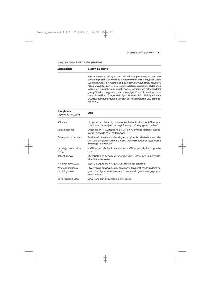 Zasady_segregacji1:1-6 2012-01-13 14:35 Page 71 Prezentacje diagramowe 71 Uwagi dotyczące bólu w klatce piersiowej Zobacz także Zapis w diagramie Jest to prezentacja diagramowa. Ból w klatce piersiowej jest częstym tematem prezentacji w oddziale ratunkowym, gdzie przypadki tego typu stanowią 2–5 % wszystkich pacjentów. Przyczyna bólu może być różna, wywołana zawałem serca lub zapaleniem mięśnia, dlatego tak ważne jest prawidłowe zakwalifikowanie pacjenta do odpowiedniej grupy. W takim przypadku należy uwzględnić szeroki katalog kryteriów, nie wykluczać zagrożenia życia i stopnia bólu. Należy mieć na uwadze specyficzne kryteria, takie jak ból serca i opłucnej oraz zaburzenia rytmu. Specyficzne kryteria różnicujące Opis Ból serca Klasycznie przejawia się bólem w środku klatki piersiowej. Może promieniować do lewej ręki lub szyi. Towarzyszyć mogą poty i nudności. Nagła duszność Duszność, która wystąpiła nagle lub jest nagłym pogorszeniem przewlekłej niewydolności oddechowej. Zaburzenia rytmu serca Bradykardia (<60 min u dorosłego), tachykardia (>100 min u dorosłego) lub niemiarowość tętna. U dzieci granice bradykardii i tachykardii zmieniają się z wiekiem. Saturacja bardzo niska (SaO2) <95% przy oddychaniu tlenem lub <90% przy oddychaniu powietrzem. Ból opłucnowy Ostry ból zlokalizowany w klatce piersiowej, nasilający się przy wdechu, kaszlu, kichaniu. Wymioty uporczywe Wymioty ciągłe lub występujące z krótkimi przerwami. Wywiad znamienny kardiologicznie Stwierdzana nawracająca niemiarowość serca jest bezpośrednim zagrożeniem życia, może prowadzić bowiem do gwałtownego pogorszenia stanu. Niska saturacja SaO2 SaO2<95% przy oddychaniu powietrzem.