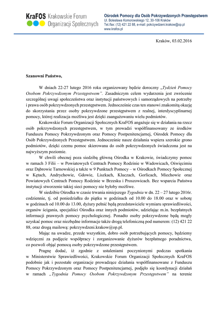 Ośrodek Pomocy dla Osób Pokrzywdzonych Przestępstwem Ul. Bolesława Komorowskiego 12, 30-106 Kraków Tel./fax: (12) 421 22 88, e-mail: [email protected] www.krafos.pl Kraków, 03.02.2016 Szanowni Państwo, W dniach 22-27 lutego 2016 roku organizowany będzie doroczny „Tydzień Pomocy Osobom Pokrzywdzonym Przestępstwem”. Zasadniczym celem wydarzenia jest zwrócenie szczególnej uwagi społeczeństwa oraz instytucji państwowych i samorządowych na potrzeby i prawa osób pokrzywdzonych przestępstwem. Jednocześnie czas ten stanowi znakomitą okazję do skorzystania przez osoby pokrzywdzone przestępstwem z realnej, interdyscyplinarnej pomocy, której realizacja możliwa jest dzięki zaangażowaniu wielu podmiotów. Krakowskie Forum Organizacji Społecznych KraFOS angażuje się w działania na rzecz osób pokrzywdzonych przestępstwem, w tym prowadzi współfinansowany ze środków Funduszu Pomocy Pokrzywdzonym oraz Pomocy Postpenitencjarnej, Ośrodek Pomocy dla Osób Pokrzywdzonych Przestępstwem. Jednocześnie nasze działania wspiera szerokie grono podmiotów, dzięki czemu pomoc skierowana do osób pokrzywdzonych świadczona jest na najwyższym poziomie. W chwili obecnej poza siedzibą główną Ośrodka w Krakowie, świadczymy pomoc w ramach 3 Filii – w Powiatowych Centrach Pomocy Rodzinie w Wadowicach, Oświęcimiu oraz Dąbrowie Tarnowskiej a także w 9 Punktach Pomocy – w Ośrodkach Pomocy Społecznej w Kętach, Andrychowie, Gdowie, Liszkach, Kluczach, Gorlicach, Miechowie oraz Powiatowych Centrach Pomocy Rodzinie w Brzesku i Proszowicach. Bez wsparcia Państwa instytucji stworzenie takiej sieci pomocy nie byłoby możliwe. W siedzibie Ośrodka w czasie trwania niniejszego Tygodnia w dn. 22 – 27 lutego 2016r. codziennie, tj. od poniedziałku do piątku w godzinach od 10.00 do 18.00 oraz w sobotę w godzinach od 10.00 do 13.00, dyżury pełnić będą przedstawiciele wymiaru sprawiedliwości, organów ścigania, specjaliści Ośrodka oraz innych podmiotów, udzielając m.in. bezpłatnych informacji prawnych pomocy psychologicznej. Ponadto osoby pokrzywdzone będą mogły uzyskać pomoc oraz niezbędne informacje także drogą telefoniczną pod numerem: (12) 421 22 88, oraz drogą mailową: [email protected]. Mając na uwadze, przede wszystkim, dobro osób potrzebujących pomocy, będziemy wdzięczni za podjęcie współpracy i zorganizowanie dyżurów bezpłatnego poradnictwa, co pozwoli objąć pomocą osoby pokrzywdzone przestępstwem. Pragnę dodać, iż zgodnie z ustaleniami poczynionymi podczas spotkania w Ministerstwie Sprawiedliwości, Krakowskie Forum Organizacji Społecznych KraFOS podobnie jak i pozostałe organizacje prowadzące działania współfinansowane z Funduszu Pomocy Pokrzywdzonym oraz Pomocy Postpenitencjarnej, podjęło się koordynacji działań w ramach „Tygodnia Pomocy Osobom Pokrzywdzonym Przestępstwem” na terenie Ośrodek Pomocy dla Osób Pokrzywdzonych Przestępstwem Ul. Bolesława Komorowskiego 12, 30-106 Kraków Tel./fax: (12) 421 22 88, e-mail: [email protected] www.krafos.pl Województwa Małopolskiego. Dlatego też, zwracam się z uprzejmą prośbą o włączenie się w obchody Tygodnia oraz wskazanie harmonogramu dyżurów realizowanych tym czasie. Wszystkie przekazane harmonogramy dyżurów zostaną scalone przez KraFOS w ramach wykazu wojewódzkiego oraz przekazane do Ministerstwa Sprawiedliwości. Informacje na temat wydarzenia zamieszczone zostaną na stronach Ministerstwa Sprawiedliwości, które zapewni również materiały promocyjne – plakaty oraz ulotki. Materiały te poprzez naszą organizację zostaną przekazane partnerom biorących udział w Tygodniu. Działania promocyjne prowadzone będą również poprzez stronę internetową KraFOS-u oraz lokalne media. W związku z koniecznością sporządzenia szczegółowego harmonogramu dyżurów specjalistów w czasie zbliżającego się Tygodnia, uprzejmie proszę o przekazanie, (w możliwie najkrótszym terminie, nie później niż do 10 lutego 2016r.), harmonogramu dyżurów. Harmonogram dyżurów będzie zamieszczony również na stronie internetowej Ministerstwa Sprawiedliwości oraz udostępniony w ramach pozostałych działań promujących wydarzenie. Wyrażając nadzieję na podjęcie współpracy w ramach Tygodnia, jednocześnie w razie pytań pozostaję do dyspozycji. Z wyrazami szacunku
