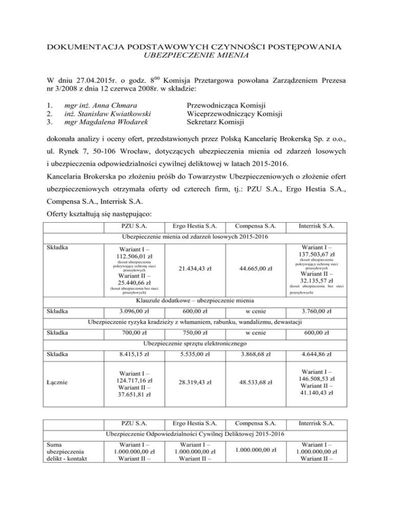 DOKUMENTACJA PODSTAWOWYCH CZYNNOŚCI POSTĘPOWANIA UBEZPIECZENIE MIENIA W dniu 27.04.2015r. o godz. 800 Komisja Przetargowa powołana Zarządzeniem Prezesa nr 3/2008 z dnia 12 czerwca 2008r. w składzie: 1. 2. 3. mgr inż. Anna Chmara inż. Stanisław Kwiatkowski mgr Magdalena Włodarek Przewodnicząca Komisji Wiceprzewodniczący Komisji Sekretarz Komisji dokonała analizy i oceny ofert, przedstawionych przez Polską Kancelarię Brokerską Sp. z o.o., ul. Rynek 7, 50-106 Wrocław, dotyczących ubezpieczenia mienia od zdarzeń losowych i ubezpieczenia odpowiedzialności cywilnej deliktowej w latach 2015-2016. Kancelaria Brokerska po złożeniu próśb do Towarzystw Ubezpieczeniowych o złożenie ofert ubezpieczeniowych otrzymała oferty od czterech firm, tj.: PZU S.A., Ergo Hestia S.A., Compensa S.A., Interrisk S.A. Oferty kształtują się następująco: PZU S.A. Ergo Hestia S.A. Compensa S.A. Interrisk S.A. Ubezpieczenie mienia od zdarzeń losowych 2015-2016 Składka Wariant I – 137.503,67 zł Wariant I – 112.506,01 zł (koszt ubezpieczenia pokrywający ochronę sieci przesyłowych 21.434,43 zł 44.665,00 zł Wariant II – 25.440,66 zł (koszt ubezpieczenia pokrywający ochronę sieci przesyłowych Wariant II – 32.135,57 zł (koszt ubezpieczenia bez sieci (koszt ubezpieczenia bez sieci przesyłowych) przesyłowych) Klauzule dodatkowe – ubezpieczenie mienia Składka 3.096,00 zł 600,00 zł w cenie 3.760,00 zł Ubezpieczenie ryzyka kradzieży z włamaniem, rabunku, wandalizmu, dewastacji Składka 700,00 zł 750,00 zł w cenie 600,00 zł Ubezpieczenie sprzętu elektronicznego Składka 8.415,15 zł Łącznie Wariant I – 124.717,16 zł Wariant II – 37.651,81 zł PZU S.A. 5.535,00 zł 3.868,68 zł 4.644,86 zł 28.319,43 zł 48.533,68 zł Wariant I – 146.508,53 zł Wariant II – 41.140,43 zł Ergo Hestia S.A. Compensa S.A. Interrisk S.A. Ubezpieczenie Odpowiedzialności Cywilnej Deliktowej 2015-2016 Suma ubezpieczenia delikt - kontakt Wariant I – 1.000.000,00 zł Wariant II – Wariant I – 1.000.000,00 zł Wariant II – 1.000.000,00 zł Wariant I – 1.000.000,00 zł Wariant II – 5.000.000,00 zł Koszt klauzul dodatkowych 5.000.000,00 zł 5.000.000,00 zł w cenie 5.700,00 zł w cenie Składka Wariant I – 46.150,00 zł Wariant II – 58.500,00 zł Wariant I – 20.320,00 zł Wariant II – 35.500,00 zł 39.200,00 zł Łączny koszt ubezpieczenia Wariant I – 46.150,00 zł Wariant II – 58.500,00 zł Wariant I – 26.020,00 zł Wariant II – 41.200,00 zł Wariant I – 6.410,00 zł Wariant II – 12.710,00 zł Wariant I – 45.800,00 zł Wariant II – 59.120,00 zł Wariant I – 52.210,00 zł Wariant II – 71.830,00 zł 39.200,00 zł Szczegółowe porównanie ofert zawiera załącznik do dokumentacji. Oferta Ergo Hestia S.A. w najpełniejszym zakresie gwarantuje ochronę ubezpieczeniową mienia, spełniając postulaty realności i pełności ochrony ubezpieczeniowej. W wyniku przeprowadzonych czynności Komisja Przetargowa naszego przedsiębiorstwa wybrała ofertę firmy Ergo Hestia S.A. Składka: Ubezpieczenie mienia od zdarzeń losowych - 28.319,43 zł Ubezpieczenie Odpowiedzialności Cywilnej Deliktowej - Wariant II - 35.500,00 zł Łączny koszt ubezpieczenia OC Deliktowej - Wariant II - 41.200,00 zł Na tym prace Komisji zakończono. Kalisz, dn. 2015-04-27 (miejscowość, data)