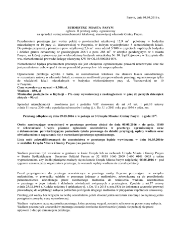 Pasym, dnia 04.04.2016 r. BURMISTRZ MIASTA PASYM ogłasza II przetarg ustny ograniczony na sprzedaż wolnej nieruchomości lokalowej, stanowiącej własność Gminy Pasym. Przedmiotem przetargu jest wolny pokój o powierzchni użytkowej 12,9 m2 położony w budynku mieszkalnym nr 10 przy ul. Warszawskiej w Pasymiu, w którym wyodrębniono 5 samodzielnych lokali. Do pokoju przynależy piwnica o pow. użytkowej 2,6 m2 oraz udział 5/100 w częściach wspólnych budynku i działce gruntu oznaczonej nr geodezyjnym 265/1 o pow. 288 m2 w obrębie geodezyjnym nr 4 miasta Pasym, na której usytuowany jest wielorodzinny budynek mieszkalny Nr 10. Sąd Rejonowy w Szczytnie dla ww. nieruchomości prowadzi księgę wieczystą KW Nr OL1S/00028145/6. Nieruchomość będąca przedmiotem przetargu nie jest obciążona ograniczonymi prawami rzeczowymi oraz nie jest przedmiotem zobowiązań i nie ma przeszkód prawnych w ich rozporządzaniu. Ograniczenie przetargu wynika z faktu, że nieruchomość lokalowa nie stanowi lokalu samodzielnego w rozumieniu ustawy o własności lokali, co oznacza możliwość przeprowadzenia przetargu ograniczonego tylko do właścicieli lokali mieszkalnych w budynku wielorodzinnym przy ul. Warszawskiej nr 10 w Pasymiu. Cena wywoławcza wynosi – 8.500,-zł, Wadium – 850,-zł Minimalne postąpienie w licytacji – 1% ceny wywoławczej z zaokrągleniem w górę do pełnych dziesiątek złotych – 90,-zł. Sprzedaż nieruchomości zwolniona jest z podatku VAT stosownie do art .43 ust. 1 pkt.10 ustawy z dnia 11 marca 2004 roku o podatku od towarów i usług (j. t. Dz. U. z 2011 roku poz.1054 z późn. zm. Przetarg odbędzie się dnia 09.05.2016 r. w pokoju nr 3 Urzędu Miasta i Gminy Pasym o godz.10 00. Osoby zamierzające uczestniczyć w przetargu powinny złożyć do dnia 05.05.2016 r. do godz. 15.00 w sekretariacie Urzędu pisemne zgłoszenie uczestnictwa w przetargu ograniczonym wraz z dokumentem potwierdzającym posiadanie tytułu prawnego do działki przyległej, wpłaty wadium oraz oświadczeniem o zapoznaniu się z warunkami przetargu ograniczonego. Lista osób zakwalifikowanych do uczestnictwa w przetargu będzie wywieszona w dniu 06.05.2016r w siedzibie Urzędu Miasta i Gminy Pasym ( na parterze). Wadium powinno być wniesione w gotówce w kasie Urzędu lub na rachunek Urzędu Miasta i Gminy Pasym w Banku Spółdzielczym Szczytno Oddział Pasym nr 32 8838 1060 2009 0 600 0101 0003 z takim wyprzedzeniem, aby środki pieniężne znalazły się na koncie Urzędu Miasta Pasym najpóźniej 05.05.2016 r - pod rygorem uznania przez organizatora przetargu, że warunek wpłaty wadium nie został spełniony. Przed przystąpieniem do przetargu uczestniczące w przetargu osoby fizyczne pozostające w związku małżeńskim, w przypadku udziału w przetargu jednego z małżonków, zobowiązane są do przedłożenia pełnomocnictwa udzielonego przez nieobecnego małżonka do wniesienia wadium, uczestnictwa w przetargu w jego imieniu i składania oświadczeń związanych z przetargiem. Zgodnie z art.37 ustawy z dnia 25.02.1964 r, Kodeks rodzinny i opiekuńczy (j. t. Dz. U z 2015 r. poz.583) do dokonania czynności prawnej prowadzącej do odpłatnego nabycia potrzebna jest zgoda drugiego małżonka w przypadku wspólności ustawowej. Przetarg jest ważny bez względu na liczbę uczestników, jeżeli chociaż jeden uczestnik zaoferuje co najmniej jedno postąpienie powyżej ceny wywoławczej. Wadium wpłacone przez uczestnika przetargu, który przetarg wygrał, zostanie zaliczone na poczet ceny nabycia. Wadium pozostałych uczestników przetargu zostanie zwrócone niezwłocznie (jednak nie później niż przed upływem 3 dni) po zamknięciu przetargu. Nabywca nieruchomości zostanie zawiadomiony o terminie i miejscu zawarcia umowy sprzedaży w ciągu 21 dni od dnia rozstrzygnięcia przetargu. Opłatę notarialną i sądową związaną z zawarciem umowy w formie aktu notarialnego w całości ponosi nabywca nieruchomości. Uchylenie się ustalonego w przetargu nabywcy od zawarcia umowy notarialnej, spowoduje odstąpienie sprzedającego i utratę wpłaconego wadium. Burmistrz Miasta Pasym może odwołać ogłoszony przetarg jedynie z ważnych powodów, przy czym informacja o odwołaniu przetargu musi być niezwłocznie podana do publicznej wiadomości. Ogłoszenie o przetargu podlega publikacji na stronach internetowych Urzędu Miasta i Gminy Pasym pod adresem www.pasym.pl i Biuletynie Informacji Publicznej www.bip.pasym.pl oraz wywieszone na tablicy ogłoszeń Urzędu Miasta i Gminy Pasym ( na parterze). Ogłoszenie zostanie doręczone dla właścicieli lokali mieszkalnych budynku nr 10 przy ul. Warszawskiej w Pasymiu. Dodatkowe informacje można uzyskać w Referacie Rozwoju Gminy Urzędu Miasta Pasym pokój nr 14, tel. (0-89) 621-28-64 wew. 34. Burmistrz Miasta Pasym