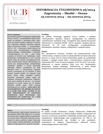 INFORMACJA TYGODNIOWA 26/2014 Zagrożenia – Skutki – Ocena 23 czerwca 2014 – 29 czerwca 2014 30 czerwca 2014 WYDZIAŁ ANALIZ SYTUACJA HYDROLOGICZNO-METEOROLOGICZNA Ocena i prognoza: Na początku tygodnia występować będą opady deszczu i burze – w poniedziałek opady intensywne na południu i wschodzie kraju, natomiast we wtorek opady przelotne na wschodzie, stopniowo słabnące. Aktualnie obowiązujące ostrzeżenia IMGW - 5 meteorologicznych st. 1/3 – intensywne opady deszczu na terenie woj.: mazowieckiego, podlaskiego, świętokrzyskiego, małopolskiego i śląskiego, 2 meteorologiczne st. 2/2 - silne burze z gradem na terenie woj. lubelskiego i podkarpackiego, 3 hydrologiczne st. 2/3 – wzrosty stanów wody do stanów ostrzegawczych (lokalnie przekroczenie stanów alarmowych) na terenie woj. świętokrzyskiego, małopolskiego i śląskiego. Zgodnie z oceną dyżurnego hydrologa IMGW, przekazaną do RCB, aktualnie burze z intensywnymi opadami deszczu przesuwają się na wschód, a front burzowy powoli będzie się odsuwał znad Polski. Burze mają charakter lokalny, punktowe intensywne opady mogą powodować miejscowe podtopienia. Prognozowana suma opadów do 50 mm - to wartości rozłożone w czasie nawet do 12 godzin. Aktualnie (30.06, godz. 8.00) sytuacja hydrologiczna jest stabilna - stany wód w dorzeczach głównych rzek układają się przeważnie w strefie wody niskiej i średniej, na stacjach wodowskazowych nie zanotowano przekroczenia stanu alarmowego, stan ostrzegawczy jest przekroczony na 1 stacji wodowskazowej w dorzeczu Odry. Przebieg: Od połowy minionego tygodnia burze, lokalnie z gradem i intensywnymi opadami deszczu występowały na południu i południowym zachodzie kraju. Szczególnie dużo zjawisk burzowych odnotowano w niedzielę (29.06) - burze z gradem i opadem deszczu (miejscami do 30 mm) występowały w województwach: dolnośląskim, opolskim, śląskim, małopolskim i świętokrzyskim. Skutki: Nie odnotowano istotnych skutków dla bezpieczeństwa ludzi i infrastruktury. Jedynie w Łodzi w sobotę (28.06) na skutek uderzenia pioruna w stację 110 kV (stacja Brzezińska) spaliły się przekładniki prądowe i nastąpił wyciek oleju z transformatora. Konieczna była interwencja PSP. Przez 10 minut (od godz. 14:27 do 14:37 ) ok 25 tys. odbiorców w rejonie dzielnicy Stoki oraz ulic: Strykowskiej, Brzezińskiej, Wojska Polskiego, Telefonicznej, a także Ronda Solidarności pozbawionych było zasilania w energię elektryczną. PIWet-PIB POTWIERDZA KOLEJNE 2 PRZYPADKI ASF U PADŁYCH DZIKÓW W WOJ. PODLASKIM Ocena: Jeśli laboratorium referencyjne potwierdzi wyniki badania PIWet-PIB, będą to 4 i 5 przypadek wirusa ASF u padłych dzików znalezionych na terenie Polski. Wszystkie zwierzęta (wcześniejsze to dwa w połowie lutego i dwa pod koniec maja), zostały znalezione na terenach objętych strefą ograniczeń, zgodnie z decyzją Przebieg: W piątek (27.06) Państwowy Instytut Weterynarii (PIWet-PIB) w Puławach potwierdził, że u dwóch padłych dzików, znalezionych 24 czerwca na terenach powiatów: sokólskiego (miejscowość Słoja, gm. Szudziałowo) i białostockiego (pas przygraniczny, ok. 700 m. od miejscowości Bobrowniki, gm. Gródek) w woj. podlaskim, stwierdzono w badaniu laboratoryjnym obecność wirusa afrykańskiego pomoru świń (ASF). INFORMACJA TYGODNIOWA 23.06. 2014 – 29.06. 2014 Ocena: Komisji Europejskiej, obowiązującą od 31 marca br. Identyfikacja i zgłoszenie do Powiatowych Lekarzy Weterynarii nastąpiły dzięki trwającemu intensywnemu monitoringowi, którego celem jest ochrona terytorium RP przed przenikaniem wirusa ASF zza wschodniej granicy. Państwowa Inspekcja Weterynaryjna nadzoruje sytuację, wypełniane są wszystkie procedury przewidziane w prawie krajowym i unijnym. Do tej pory w żadnej hodowli trzody chlewnej na terenie kraju nie stwierdzono przypadku ASF. Skutki: Wyniki badań laboratoryjnych przeprowadzonych przez PIWet-PIB w Puławach są obecnie weryfikowane przez laboratorium referencyjne Unii Europejskiej do spraw afrykańskiego pomoru świń (CISA - INIA, Madryt, Hiszpania) celem potwierdzenia lub wykluczenia ASF. ROZMOWY PREMIERA Z GÓRNICZYMI ZWIĄZKAMI ZAWODOWYMI Ocena i prognoza: Było to już piąte spotkanie premiera ze związkowcami w sprawie złej sytuacji ekonomicznej branży górniczej. Do najważniejszych kwestii należą: przyszłość Kompanii Węglowej (w pierwszym kwartale tego roku odnotowała 78,4 mln zł straty), problem sprzedaży surowca zalegającego na hałdach, w tym do elektrowni węglowych w kraju, przy jednoczesnym zmniejszeniu importu, a także utworzenie państwowych składów węgla (co pozwoli na unikanie pośredników handlowych). Obydwie strony wyraziły wolę prowadzenia dalszych rozmów w celu opracowania spójnego planu naprawczego dla górnictwa węgla kamiennego. Następne spotkanie zaplanowano na ostatni tydzień lipca w Katowicach. Przebieg: W środę (25.06) odbyło się kolejne spotkanie Prezesa Rady Ministrów z przedstawicielami górniczych central związkowych w sprawie poprawy sytuacji w branży węglowej. Pomimo wcześniejszych zapowiedzi nie przyniosło ono kluczowych rozstrzygnięć. Skutki: Dotychczasowe rozmowy ze stroną rządową doprowadziły do zawieszenia przez górnicze związki zawodowe akcji protestacyjnych planowanych w Warszawie. PROTEST NSZZ PRACOWNIKÓW WOJSKA W WARSZAWIE Ocena i prognoza: NSZZ Pracowników Wojska zrzesza cywilnych pracowników Sił Zbrojnych. Wskazują oni, że restrukturyzacja w resorcie obrony narodowej skutkuje znaczącym zmniejszeniem liczby pracowników a uzawodowienie armii spowodowało obciążenie zatrudnionych cywilów dodatkowymi obowiązkami, w tym z zakresu logistyki, finansów czy mobilizacji i łączności. Za zwiększonymi zadaniami nie poszły jednak, zdaniem związkowców, zwiększone nakłady na wynagrodzenia. Przebieg: W środę (25.06) przed siedzibą Kancelarii Prezesa Rady Ministrów i Ministerstwa
