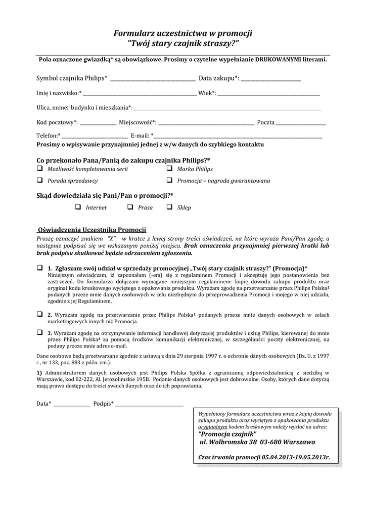 Formularz uczestnictwa w promocji "Twój stary czajnik straszy?” Pola oznaczone gwiazdką* są obowiązkowe. Prosimy o czytelne wypełnianie DRUKOWANYMI literami. Symbol czajnika Philips* __________________________________ Data zakupu*: ________________________ Imię i nazwisko:* __________________________________________________ Wiek*: _____________________________________________ Ulica, numer budynku i mieszkania*: __________________________________________________________________________________ Kod pocztowy*: ________________ Miejscowość*: __________________________________________ Poczta ______________________ Telefon:* _____________________________ E-mail: *__________________________________________________________________________ Prosimy o wpisywanie przynajmniej jednej z w/w danych do szybkiego kontaktu Co przekonało Pana/Panią do zakupu czajnika Philips?* Możliwość kompletowania serii Marka Philips Porada sprzedawcy Promocja – nagroda gwarantowana Skąd dowiedziała się Pani/Pan o promocji?* Internet Prasa Sklep Oświadczenia Uczestnika Promocji Proszę oznaczyć znakiem "X" w kratce z lewej strony treści oświadczeń, na które wyraża Pani/Pan zgodę, a następnie podpisać się we wskazanym poniżej miejscu. Brak oznaczenia przynajmniej pierwszej kratki lub brak podpisu skutkować będzie odrzuceniem zgłoszenia. 1. Zgłaszam swój udział w sprzedaży promocyjnej „Twój stary czajnik straszy?” (Promocja)* Niniejszym oświadczam, iż zapoznałam (-em) się z regulaminem Promocji i akceptuję jego postanowienia bez zastrzeżeń. Do formularza dołączam wymagane niniejszym regulaminem: kopię dowodu zakupu produktu oraz oryginał kodu kreskowego wyciętego z opakowania produktu. Wyrażam zgodę na przetwarzanie przez Philips Polska1 podanych przeze mnie danych osobowych w celu niezbędnym do przeprowadzenia Promocji i mojego w niej udziału, zgodnie z jej Regulaminem. 2. Wyrażam zgodę na przetwarzanie przez Philips Polska1 podanych przeze mnie danych osobowych w celach marketingowych innych niż Promocja. 3. Wyrażam zgodę na otrzymywanie informacji handlowej dotyczącej produktów i usług Philips, kierowanej do mnie przez Philips Polska1 za pomocą środków komunikacji elektronicznej, w szczególności poczty elektronicznej, na podany przeze mnie adres e-mail. Dane osobowe będą przetwarzane zgodnie z ustawą z dnia 29 sierpnia 1997 r. o ochronie danych osobowych (Dz. U. z 1997 r., nr 133, poz. 883 z późn. zm.). 1) Administratorem danych osobowych jest Philips Polska Spółka z ograniczoną odpowiedzialnością z siedzibą w Warszawie, kod 02-222, Al. Jerozolimskie 195B. Podanie danych osobowych jest dobrowolne. Osoby, których dane dotyczą mają prawo dostępu do treści swoich danych oraz do ich poprawiania. Data* ________________ Podpis* ______________________________ Wypełniony formularz uczestnictwa wraz z kopią dowodu zakupu produktu oraz wyciętym z opakowania produktu oryginalnym kodem kreskowym należy wysłać na adres: "Promocja czajnik" ul. Wolbromska 38 03-680 Warszawa Czas trwania promocji 05.04.2013-19.05.2013r.