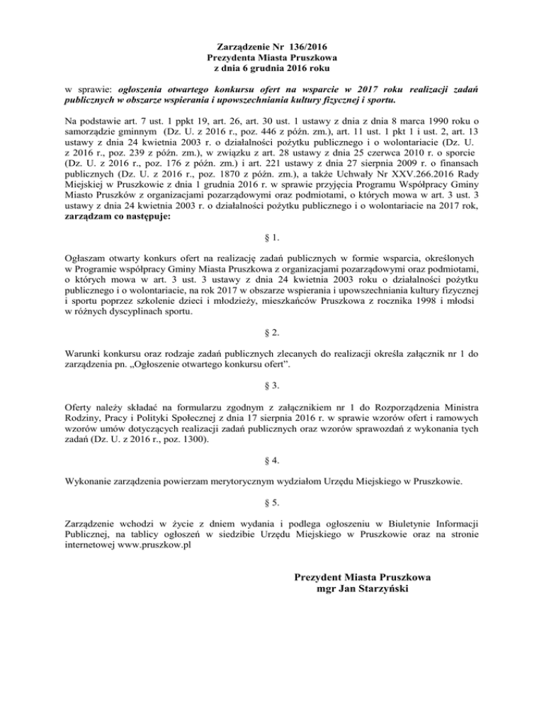 Zarządzenie Nr 136/2016 Prezydenta Miasta Pruszkowa z dnia 6 grudnia 2016 roku w sprawie: ogłoszenia otwartego konkursu ofert na wsparcie w 2017 roku realizacji zadań publicznych w obszarze wspierania i upowszechniania kultury fizycznej i sportu. Na podstawie art. 7 ust. 1 ppkt 19, art. 26, art. 30 ust. 1 ustawy z dnia z dnia 8 marca 1990 roku o samorządzie gminnym (Dz. U. z 2016 r., poz. 446 z późn. zm.), art. 11 ust. 1 pkt 1 i ust. 2, art. 13 ustawy z dnia 24 kwietnia 2003 r. o działalności pożytku publicznego i o wolontariacie (Dz. U. z 2016 r., poz. 239 z późn. zm.), w związku z art. 28 ustawy z dnia 25 czerwca 2010 r. o sporcie (Dz. U. z 2016 r., poz. 176 z późn. zm.) i art. 221 ustawy z dnia 27 sierpnia 2009 r. o finansach publicznych (Dz. U. z 2016 r., poz. 1870 z późn. zm.), a także Uchwały Nr XXV.266.2016 Rady Miejskiej w Pruszkowie z dnia 1 grudnia 2016 r. w sprawie przyjęcia Programu Współpracy Gminy Miasto Pruszków z organizacjami pozarządowymi oraz podmiotami, o których mowa w art. 3 ust. 3 ustawy z dnia 24 kwietnia 2003 r. o działalności pożytku publicznego i o wolontariacie na 2017 rok, zarządzam co następuje: § 1. Ogłaszam otwarty konkurs ofert na realizację zadań publicznych w formie wsparcia, określonych w Programie współpracy Gminy Miasta Pruszkowa z organizacjami pozarządowymi oraz podmiotami, o których mowa w art. 3 ust. 3 ustawy z dnia 24 kwietnia 2003 roku o działalności pożytku publicznego i o wolontariacie, na rok 2017 w obszarze wspierania i upowszechniania kultury fizycznej i sportu poprzez szkolenie dzieci i młodzieży, mieszkańców Pruszkowa z rocznika 1998 i młodsi w różnych dyscyplinach sportu. § 2. Warunki konkursu oraz rodzaje zadań publicznych zlecanych do realizacji określa załącznik nr 1 do zarządzenia pn. „Ogłoszenie otwartego konkursu ofert”. § 3. Oferty należy składać na formularzu zgodnym z załącznikiem nr 1 do Rozporządzenia Ministra Rodziny, Pracy i Polityki Społecznej z dnia 17 sierpnia 2016 r. w sprawie wzorów ofert i ramowych wzorów umów dotyczących realizacji zadań publicznych oraz wzorów sprawozdań z wykonania tych zadań (Dz. U. z 2016 r., poz. 1300). § 4. Wykonanie zarządzenia powierzam merytorycznym wydziałom Urzędu Miejskiego w Pruszkowie. § 5. Zarządzenie wchodzi w życie z dniem wydania i podlega ogłoszeniu w Biuletynie Informacji Publicznej, na tablicy ogłoszeń w siedzibie Urzędu Miejskiego w Pruszkowie oraz na stronie internetowej www.pruszkow.pl Prezydent Miasta Pruszkowa mgr Jan Starzyński Załącznik nr 1 do Zarządzenia Nr 136/2016 Prezydenta Miasta Pruszkowa z dnia 6 grudnia 2016 r. OGŁOSZENIE OTWARTEGO KONKURSU OFERT Prezydent Miasta Pruszkowa działając na podstawie art. 7 ust. 1 ppkt 19, art. 26, art. 30 ust. 1 ustawy z dnia z dnia 8 marca 1990 roku o samorządzie gminnym (Dz. U. z 2016 r., poz. 446 z późn. zm.), art. 11 ust. 1 pkt 1 i ust. 2, art. 13 ustawy z dnia 24 kwietnia 2003 r. o działalności pożytku publicznego i o wolontariacie (Dz. U. z 2016 r., poz. 239 z późn. zm.), w związku z art. 28 ustawy z dnia 25 czerwca 2010 r. o sporcie (Dz. U. z 2016 r., poz. 176 z późn. zm.) i art. 221 ustawy z dnia 27 sierpnia 2009 r. o finansach publicznych (Dz. U. z 2016 r., poz. 1870 z późn. zm.), a także Uchwały Nr XXV.266.2016 Rady Miejskiej w Pruszkowie z dnia 1 grudnia 2016 r. w sprawie przyjęcia Programu Współpracy Gminy Miasto Pruszków z organizacjami pozarządowymi oraz podmiotami, o których mowa w art. 3 ust. 3 ustawy z dnia 24 kwietnia 2003 r. o działalności pożytku publicznego i o wolontariacie na 2017 rok, o g ł a s z a otwarty konkurs ofert na wspieranie wykonania przez organizacje pozarządowe i inne uprawnione podmioty prowadzące działalność pożytku publicznego (podmioty wymienione w art. 3 ust. 3 ustawy z dnia 24 kwietnia 2003 roku o działalności pożytku publicznego i o wolontariacie) następujących zadań publicznych w 2017 roku: A. Rodzaj zadań i wysokość środków publicznych przeznaczonych na ich realizację: Obszar Wspieranie i upowszechnianie kultury fizycznej i sportu L.p . 1 Rodzaj zadania Szkolenie dzieci i młodzieży, mieszkańców Pruszkowa z rocznika 1998 i młodsi w różnych dyscyplinach sportu Łącznie zadanie: Wydatki poniesione w roku 2016 Planowane wydatki w roku 2017 964.000,00zł 964.000,00zł 964.000,00zł 964.000,00zł B. Warunki konkursu: I. Wysokość środków przeznaczonych na realizację zadania: 1. Łączna kwota środków finansowych zaplanowanych w 2017 roku na wsparcie realizacji zadań publicznych w zakresie szkolenia dzieci i młodzieży, mieszkańców Pruszkowa z rocznika 1998 i młodsi w różnych dyscyplinach sportu wynosi 964.000,00 zł. 2. Łączna kwota środków finansowych zaplanowanych w 2017 roku na wsparcie realizacji zadań publicznych w obszarze wspierania i upowszechniania kultury fizycznej i sportu została określona na podstawie projektu budżetu Miasta Pruszkowa na 2017 rok i może się zmienić. 3. Kwota przeznaczona na realizację zadania może ulec zmniejszeniu w przypadku stwierdzenia, że zadanie to można zrealizować mniejszym kosztem, złożone oferty nie uzyskają akceptacji lub zaistnieje konieczność zmniejszenia budżetu Miasta Pruszkowa w części przeznaczonej na realizację zadania z ważnych przyczyn, niemożliwych do przewidzenia w dniu ogłoszenia konkursu. 4. Wsparcie udzielone podmiotom ubiegającym się o dotacje w ramach otwartego konkursu ofert zostanie udzielone w wysokości do 90% całkowitych kosztów związanych z konkursem i faktycznie poniesionych przez podmioty, którym przyznano dofinansowanie. II. Zasady przyznawania dotacji i wymagania wobec oferentów: 1. W otwartym konkursie mogą uczestniczyć organizacje pozarządowe oraz osoby prawne i jednostki organizacyjne, które: prowadzą działalność statutową w dziedzinie objętej konkursem i zamierzają realizować zadanie na rzecz mieszkańców Miasta Pruszkowa; pr