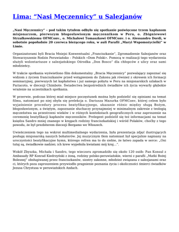 Lima: “Nasi Męczennicy” u Salezjanów „Nasi Męczennicy” – pod takim tytułem odbyło się spotkanie poświęcone trzem kapłanom misjonarzom, pierwszym błogosławionym męczennikom w Peru, o. Zbigniewowi Strzałkowskiemu OFMConv., o. Michałowi Tomaszkowi OFMConv. i o. Alessandro Dordi, w sobotnie popołudnie 20 czerwca bieżącego roku, w auli Parafii „Maryi Wspomożycielki” w Limie. Organizatorami byli Bracia Mniejsi Konwentualni „Franciszkanie”, Zgromadzenie Salezjanów oraz Stowarzyszenie Rodzin Peruwiańsko – Polskich «Dom Polski». Pomocą w realizacji tego wydarzenia służyli wolontariusze z salezjańskiego Ośrodka „Don Bosco” dla chłopców z ulicy oraz sami młodzieńcy. W trakcie spotkania wyświetlono film dokumentalny „Bracia Męczennicy” pozwalający zapoznać się widzom z życiem franciszkanów przed wstąpieniem do Zakonu jak również z okresem ich formacji seminaryjnej, pierwszych lat kapłaństwa i już samego pobytu w Peru na misjonarskich szlakach w Pariacoto, w diecezji Chimbote. Świadectwa bezpośrednich świadków ich życia wywarły głębokie wrażenie na uczestnikach spotkania. W przerwie, podczas której miał miejsce poczęstunek można było podzielić się opiniami na temat filmu, natomiast po niej obyła się prelekcja o. Dariusza Mazurka OFMConv, której celem było wyjaśnienie procedury procesu beatyfikacyjnego, ukazanie różnic między sługą Bożym, błogosławionym, a świętym, zapoznanie słuchaczy przynajmniej w minimalnym zakresie z teologią męczeństwa na przestrzeni wieków i w różnych kontekstach geograficznych oraz zaproszenie na ceremonię beatyfikacji kapłanów męczenników. Prelegent podzielił się też informacjami na temat księdza Sandro mniej znanego w kręgach rodziny franciszkańskiej i wśród Polaków, choćby z tego powodu, że był prezbiterem diecezji Bergamo we Włoszech. Uwieńczeniem tego na wskroś multimedialnego wydarzenia, była prezentacja zdjęć ilustrujących posługę misjonarską naszych bohaterów. Jej muzycznym tłem natomiast był specjalnie napisany na uroczystości beatyfikacyjne hymn, którego refren ma to do siebie, że łatwo zapada w serce: „Oni tutaj są, świadkowie nadziei; ich krew wypełniła kwiatami mój kraj…”. Wokół Zbyszka, Michała i Sandro, tego wieczoru zgromadziło się około 120 osób: Pan Konsul z Ambasady RP Konrad Kiedrzyński z żoną, rodziny polsko-peruwiańskie, wierni z parafii „Matki Bożej Bolesnej” obsługiwanej przez franciszkanów, siostry zakonne, młodzież związana z salezjanami oraz ci, których poza zaproszeniem przywiodło pragnienie poznania życia i okoliczności śmierci świadków Jezusa Chrystusa w peruwiańskich Andach. fr. Dariusz Mazurek OFM Conv/red. za: www.franciszkanie.pl