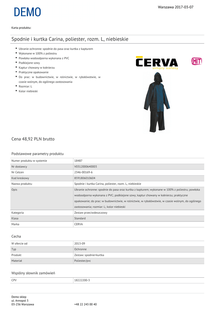 Warszawa 2017-03-07 Karta produktu: Spodnie i kurtka Carina, poliester, rozm. L, niebieskie Ubranie ochronne: spodnie do pasa oraz kurtka z kapturem Wykonane w 100% z poliestru Powłoka wodoodporna wykonana z PVC Podklejone szwy Kaptur chowany w kołnierzu Praktyczne opakowanie Do prac: w budownictwie, w rolnictwie, w rybołówstwie, w czasie wolnym, do ogólnego zastosowania Rozmiar: L Kolor niebieski Cena 48,92 PLN brutto Podstawowe parametry produktu Numer produktu w systemie 18487 Nr dostawcy V0312000640003 Nr Celcen 2346-00169-6 Kod kreskowy 8591806010604 Nazwa produktu Spodnie i kurtka Carina, poliester, rozm. L, niebieskie Opis Ubranie ochronne: spodnie do pasa oraz kurtka z kapturem; wykonane w 100% z poliestru; powłoka wodoodporna wykonana z PVC; podklejone szwy; kaptur chowany w kołnierzu; praktyczne opakowanie; do prac: w budownictwie, w rolnictwie, w rybołówstwie, w czasie wolnym, do ogólnego zastosowania; rozmiar: L; kolor niebieski Kategoria Zestaw przeciwdeszczowy Klasa Standard Marka CERVA Cecha W ofercie od 2013-09 Typ Ochronne Produkt Zestaw: spodnie+kurtka Materiał Poliester/pvc Wspólny słownik zamówień CPV 18222200-3 Demo sklep ul. Annopol 3 03-236 Warszawa +48 22 243 00 40 Warszawa 2017-03-07 Karta katalogowa produktu cd. Spodnie i kurtka Carina, poliester, rozm. L, niebieskie Wymiary Rozmiar L Certyfikaty Hit Hit Nowy produkt w ofercie Standard Kolor Kolor Niebieski Serdecznie zapraszamy do współpracy Demo sklep zespół. Demo sklep ul. Annopol 3 03-236 Warszawa +48 22 243 00 40