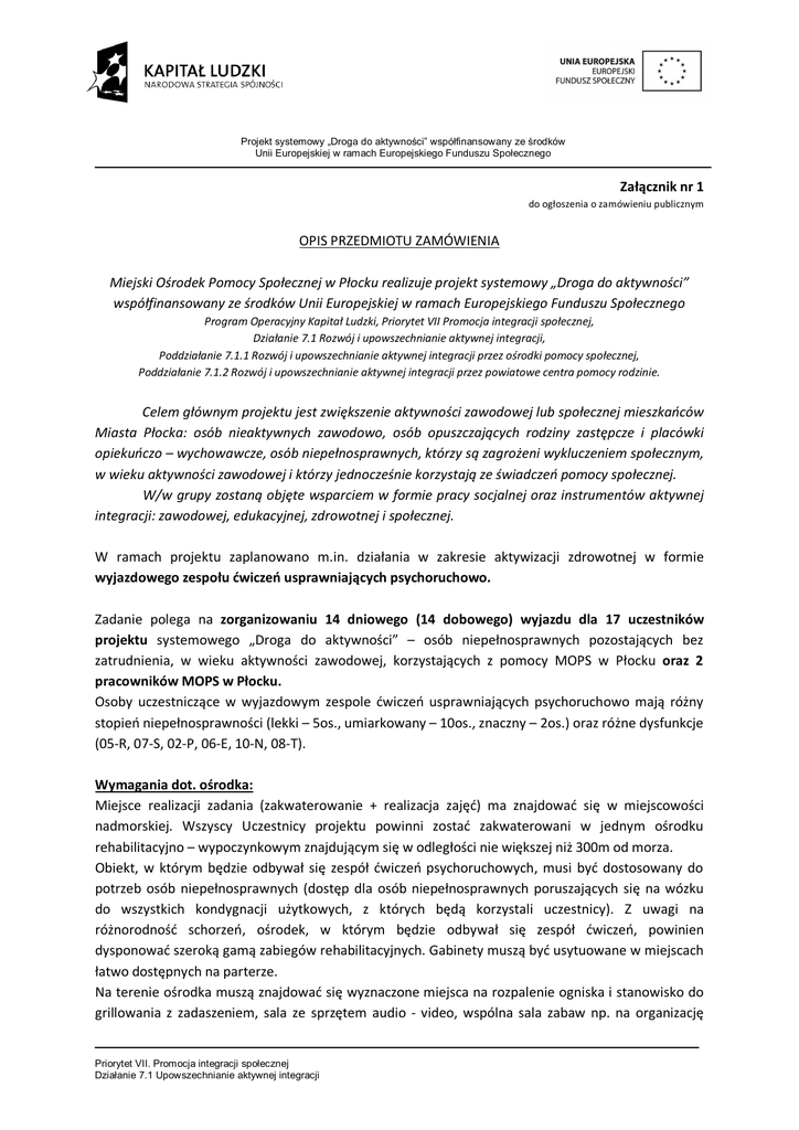 Projekt systemowy „Droga do aktywności” współfinansowany ze środków Unii Europejskiej w ramach Europejskiego Funduszu Społecznego Załącznik nr 1 do ogłoszenia o zamówieniu publicznym OPIS PRZEDMIOTU ZAMÓWIENIA Miejski Ośrodek Pomocy Społecznej w Płocku realizuje projekt systemowy „Droga do aktywności” współfinansowany ze środków Unii Europejskiej w ramach Europejskiego Funduszu Społecznego Program Operacyjny Kapitał Ludzki, Priorytet VII Promocja integracji społecznej, Działanie 7.1 Rozwój i upowszechnianie aktywnej integracji, Poddziałanie 7.1.1 Rozwój i upowszechnianie aktywnej integracji przez ośrodki pomocy społecznej, Poddziałanie 7.1.2 Rozwój i upowszechnianie aktywnej integracji przez powiatowe centra pomocy rodzinie. Celem głównym projektu jest zwiększenie aktywności zawodowej lub społecznej mieszkańców Miasta Płocka: osób nieaktywnych zawodowo, osób opuszczających rodziny zastępcze i placówki opiekuńczo – wychowawcze, osób niepełnosprawnych, którzy są zagrożeni wykluczeniem społecznym, w wieku aktywności zawodowej i którzy jednocześnie korzystają ze świadczeń pomocy społecznej. W/w grupy zostaną objęte wsparciem w formie pracy socjalnej oraz instrumentów aktywnej integracji: zawodowej, edukacyjnej, zdrowotnej i społecznej. W ramach projektu zaplanowano m.in. działania w zakresie aktywizacji zdrowotnej w formie wyjazdowego zespołu ćwiczeń usprawniających psychoruchowo. Zadanie polega na zorganizowaniu 14 dniowego (14 dobowego) wyjazdu dla 17 uczestników projektu systemowego „Droga do aktywności” – osób niepełnosprawnych pozostających bez zatrudnienia, w wieku aktywności zawodowej, korzystających z pomocy MOPS w Płocku oraz 2 pracowników MOPS w Płocku. Osoby uczestniczące w wyjazdowym zespole ćwiczeń usprawniających psychoruchowo mają różny stopień niepełnosprawności (lekki – 5os., umiarkowany – 10os., znaczny – 2os.) oraz różne dysfunkcje (05-R, 07-S, 02-P, 06-E, 10-N, 08-T). Wymagania dot. ośrodka: Miejsce realizacji zadania (zakwaterowanie + realizacja zajęć) ma znajdować się w miejscowości nadmorskiej. Wszyscy Uczestnicy projektu powinni zostać zakwaterowani w jednym ośrodku rehabilitacyjno – wypoczynkowym znajdującym się w odległości nie większej niż 300m od morza. Obiekt, w którym będzie odbywał się zespół ćwiczeń psychoruchowych, musi być dostosowany do potrzeb osób niepełnosprawnych (dostęp dla osób niepełnosprawnych poruszających się na wózku do wszystkich kondygnacji użytkowych, z których będą korzystali uczestnicy). Z uwagi na różnorodność schorzeń, ośrodek, w którym będzie odbywał się zespół ćwiczeń, powinien dysponować szeroką gamą zabiegów rehabilitacyjnych. Gabinety muszą być usytuowane w miejscach łatwo dostępnych na parterze. Na terenie ośrodka muszą znajdować się wyznaczone miejsca na rozpalenie ogniska i stanowisko do grillowania z zadaszeniem, sala ze sprzętem audio - video, wspólna sala zabaw np. na organizację Priorytet VII. Promocja integracji społecznej Działanie 7.1 Upowszechnianie aktywnej integracji Projekt systemowy „Droga do aktywności” współfinansowany ze środków Unii Europejskiej w ramach Europejskiego Funduszu Społecznego wieczorków tanecznych. Dodatkowym atutem będzie bliskość lub posiadanie atrakcji typu: boisko do gier zespołowych, stoły do tenisa stołowego, bilard, wypożyczalnia rowerów, ścianka wspinaczkowa. Stołówka oraz miejsca przeznaczone do działań integracyjnych muszą posiadać powierzchnię przystosowaną kubaturą dla wszystkich uczestników wyjazdu. Zamawiający nie dopuszcza podziału uczestników na mniejsze grupy w celu spożywania posiłków, udziału w zajęciach integracyjnych ze względu na nie wystarczającą liczbę miejsc. Stołówka musi mieć przystosowaną liczbę miejsc na pomieszczenie jednorazowo wszystkich uczestników. Wyposażenie każdego pokoju uczestnika: oddzielne łóżka, TV, lodówka, radio, czajnik bezprzewodowy, szklanki, łyżeczki. Dodatkowo 2 pokoje 1-osobowe o takim samym standardzie dla 2 opiekunów grupy – pracowników MOPS w Płocku. Zaoferowany ośrodek nie może być pensjonatem, kwaterą prywatną, schroniskiem i musi być komfortowy (musi spełniać wyżej opisane wymagania Zamawiającego). Wymagania dot. programu: Wykonawca zobowiązany będzie do opracowania i przedłożenia Zamawiającemu programu zespołu ćwiczeń usprawniających psychoruchowo obejmującego: − ćwiczenia usprawniające psychoruchowo oraz zabiegi rehabilitacyjne, − grupowe zajęcia z psychologiem, − zajęcia rekreacyjno – integracyjne oraz zawierającego: nazwę i zakres zespołu, miejsce, gdzie będzie się odbywał, czas trwania (data, godzina), plan zespołu określający rodzaje i tematykę działań, cel zespołu (przewidywane efekty). Program ćwiczeń usprawniających psychoruchowo oraz zabiegów rehabilitacyjnych powinien być dostosowany do potrzeb osób niepełnosprawnych i realizować przede wszystkim cel w postaci usprawnienia psychoruchowego. Program zajęć powinien zapewnić poprawę kondycji psychofizycznej uczestników, poprawę samopoczucia, poprawę kondycji, wzmocnienie siły mięśni i kręgosłupa oraz zawierać takie elementy jak: trening relaksacyjny, masaż, zajęcia rytmiczne, marsz z kijkami Nordic Walking, gimnastykę na przyrządach fitness i w siłowni, gimnastykę ogólnorozwojową, aerobik w basenie pod opieką instruktora oraz zabiegi w gabinetach fizjoterapeutycznych wg indywidualnych zaleceń lekarza na podstawie oceny stanu zdrowia stwierdzonej przez lekarza na miejscu oraz w oparciu o dokumentację medyczną uczestnika, w tym: kinezyterapia, masaże, hydroterapia, inhalacje, zabiegi lecznicze, fizykoterapia, ciepłolecznictwo, światłolecznictwo, krioterapia. Zajęcia będą prowadzone w godzinach rannych, przez osoby posiadające odpowiednie kwalifikacje. Program grupowych zaję
