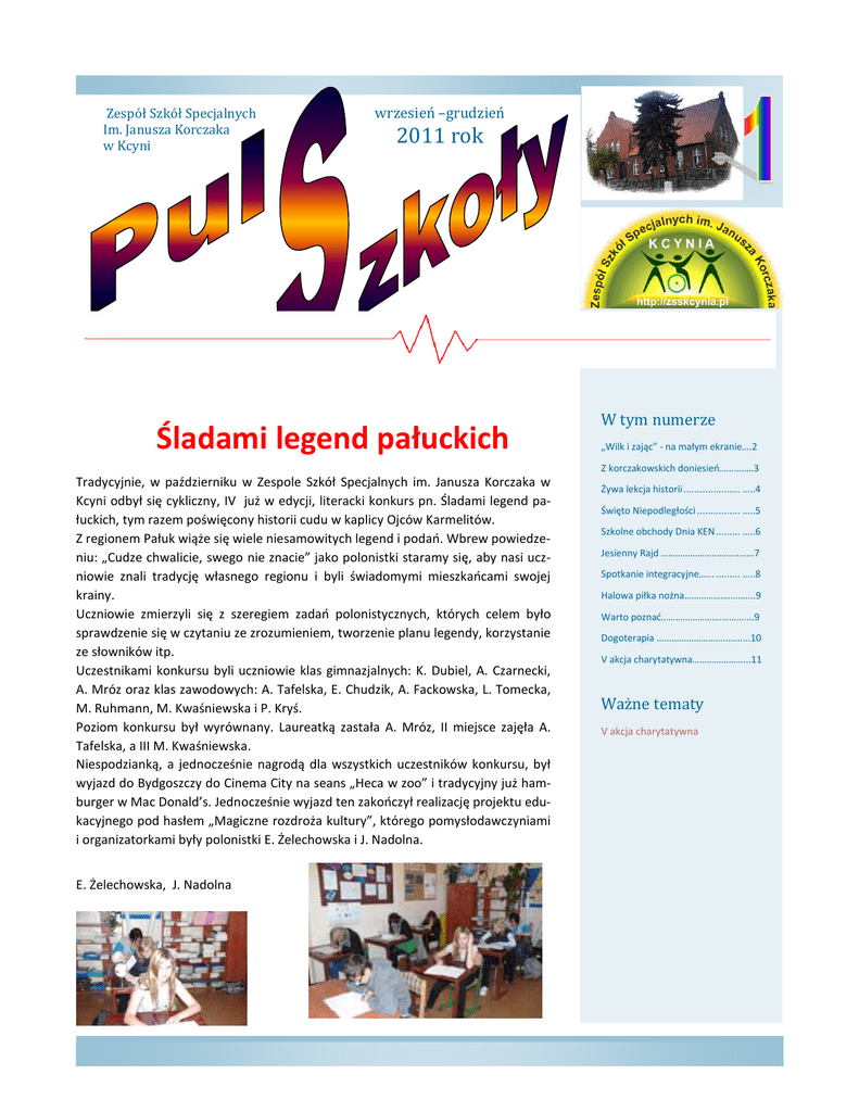 Zespó ł Szkó ł Specjalnych Im. Janusza Korczaka w Kcyni wrzesień –grudzień 2011 rok Śladami legend pałuckich W tym numerze „Wilk i zając” - na małym ekranie….2 Z korczakowskich doniesień……….….3 Tradycyjnie, w październiku w Zespole Szkół Specjalnych im. Janusza Korczaka w Kcyni odbył się cykliczny, IV już w edycji, literacki konkurs pn. Śladami legend pałuckich, tym razem poświęcony historii cudu w kaplicy Ojców Karmelitów. Z regionem Pałuk wiąże się wiele niesamowitych legend i podań. Wbrew powiedzeniu: „Cudze chwalicie, swego nie znacie” jako polonistki staramy się, aby nasi uczniowie znali tradycję własnego regionu i byli świadomymi mieszkańcami swojej krainy. Uczniowie zmierzyli się z szeregiem zadań polonistycznych, których celem było sprawdzenie się w czytaniu ze zrozumieniem, tworzenie planu legendy, korzystanie ze słowników itp. Uczestnikami konkursu byli uczniowie klas gimnazjalnych: K. Dubiel, A. Czarnecki, A. Mróz oraz klas zawodowych: A. Tafelska, E. Chudzik, A. Fackowska, L. Tomecka, M. Ruhmann, M. Kwaśniewska i P. Kryś. Poziom konkursu był wyrównany. Laureatką zastała A. Mróz, II miejsce zajęła A. Tafelska, a III M. Kwaśniewska. Niespodzianką, a jednocześnie nagrodą dla wszystkich uczestników konkursu, był wyjazd do Bydgoszczy do Cinema City na seans „Heca w zoo” i tradycyjny już hamburger w Mac Donald’s. Jednocześnie wyjazd ten zakończył realizację projektu edukacyjnego pod hasłem „Magiczne rozdroża kultury”, którego pomysłodawczyniami i organizatorkami były polonistki E. Żelechowska i J. Nadolna. E. Żelechowska, J. Nadolna Żywa lekcja historii ..................... …..4 Święto Niepodległości ................ …..5 Szkolne obchody Dnia KEN ......... …..6 Jesienny Rajd …………………………...…..7 Spotkanie integracyjne…... ......... …..8 Halowa piłka nożna…………………..…...9 Warto poznać…………………….………....9 Dogoterapia …...…………………..……...10 V akcja charytatywna…………………...11 Waż ne tematy V akcja charytatywna na małym ekranie „Wilk i zając” Po raz kolejny koordynatorki projektu edukacyjnego pt.” Magiczne rozdroża kultury” - p. Agnieszka Bembnista i p. Agnieszka Pawlak, zorganizowały dla uczniów ciekawe połączenie zajęć plastyczno- językowych. W Zespole Szkół Specjalnych im. Janusza Korczaka w Kcyni, odbyła się projekcja i plastyczna oprawa hitu rosyjskiej bajki „Wilk i zając”. Uczniowie biorący udział w projekcie mieli za zadanie przedstawienie za pomocą dowolnych technik plastycznych jednej wybranej przez siebie sceny przygód głównych bohaterów bajki. Zajęcia odbyły się w dwóch etapach: Pierwszym etapem była ekranizacja bajki, która pozwoliła naszym uczniom dokonać wyboru scen. Uczniowie z wielkim zaciekawieniem i uśmiechem na ustach oglądali przygody głównych bohaterów. Drugi etap to szkic wcześniej wybranej jednej sceny z przygód wilka i zająca. Po zaprojektowaniu pracy uczniowie mieli do dyspozycji różnego rodzaju materiały plastyczne, za pomocą których wcześniej dokonane szkice nabrały wielu kolorystycznych barw. Uczestnikami projektu byli: A. Tafelska, M. Ruhmann, K. Woźniak, K. Świerzawski, M. Malerowicz, A. Fackowska, M. Lipiec, K. Wałkiewicz. Na zakończenie zajęć na uczniów czekała słodka niespodzianka. A. Bembnista, A Pawlak 2 Z KORCZAKOWSKICH DONIESIEŃ… Słów „cięcie gięcie”, czyli młodzież z Korczaka w siedzibie Gazety Wyborczej Pasje czynią nasze życie bogatszym, a najlepiej, kiedy rozbudza się je za młodu, wtedy ciekawość świata pobudza nas do aktywności i ciągłych poszukiwań. Nauczyciel, świadomy swojej misji wie, że świat trzeba dzieciom i młodzieży nieustannie pokazywać. Uczyć mądrych wyborów. Dzięki owym założeniom otrzymujemy od uczniów informację zwrotną: „Świat jest pełen ciekawych miejsc i niezwykłych zawodów”. Realizując projekt Magiczne rozdroża kultury odwiedziliśmy już bydgoskie siedziby Radia PIK, drukarni ORTIS, oddział telewizji regionalnej TVP BYDGOSZCZ, Teatr Polski i jego kulisy. Jednym z ostatnich punktów na mapie naszych „lekcji poza ławką” znalazła się redakcja gazety. Za cel obraliśmy siedzibę Gazety Wyborczej, która, jak się okazało mieści się w pięknej, secesyjnej, bydgoskiej kamienicy przy ulicy Gdańskiej. Spotkanie z zastępcą redaktora naczelnego, p. Andrzejem Pycyno, okazało się rozmową na temat roli dziennikarzy w kształtowaniu opinii publicznej, etapów powstawania gazety, sposobów pozyskiwania tematów itp. W obliczu błyskawicznego postępu techniki w pracy dziennikarza niezbędnymi narzędziami okazują się telefon, komputer, Internet. Obejrzeliśmy stare roczniki z lat 80-tych gazety jeszcze w druku czarno- białym. Podsłuchaliśmy gwar dziennikarskich rozmów i przyjrzeliśmy się krzątaninie reporterów, gdzie wszyscy za cel, każdego dnia mają wydanie najnowszego numeru gazety. Wycieczka odbyła się dnia 19 września 2011r. Organizatorkami były polonistki Zespołu Szkół Specjalnych im. Janusza Korczaka w Kcyni: Joanna Nadolna i Ewa Żelechowska- koordynatorki projektu Magiczne rozdroża kultury. Uczestnikami byli uczniowie: K. Hausz, K. Woźniak, A. Tafelska, L. Tomecka, A. Mróz, M. Malerowicz, A. Baranek, A. Szewczuk, A. Piekarski oraz K. Kujawa i jego opiekun J. Napierała. Każdej naszej wyprawie towarzyszy spacer ulicami Bydgoszczy i „kultowy” już hamburger w McDonald’s… cóż, idea ideą, ale coś dla ducha i coś obowiązkowo dla ciała. W następnej, już październikowej odsłonie, ruszamy do kina na spotkanie z „wielkim ekranem”. Joanna Nadolna Fot. Jerzy Napierała 3 ,,Żywa lekcja historii” w Muzeum Początków Państwa Polskiego w Gnieźnie Dn. 18 października 2011 roku grupa 26 uczniów Zespołu Szkół Specjalnych im. Janusz Korczaka w Kcyni wzięła udział wyc