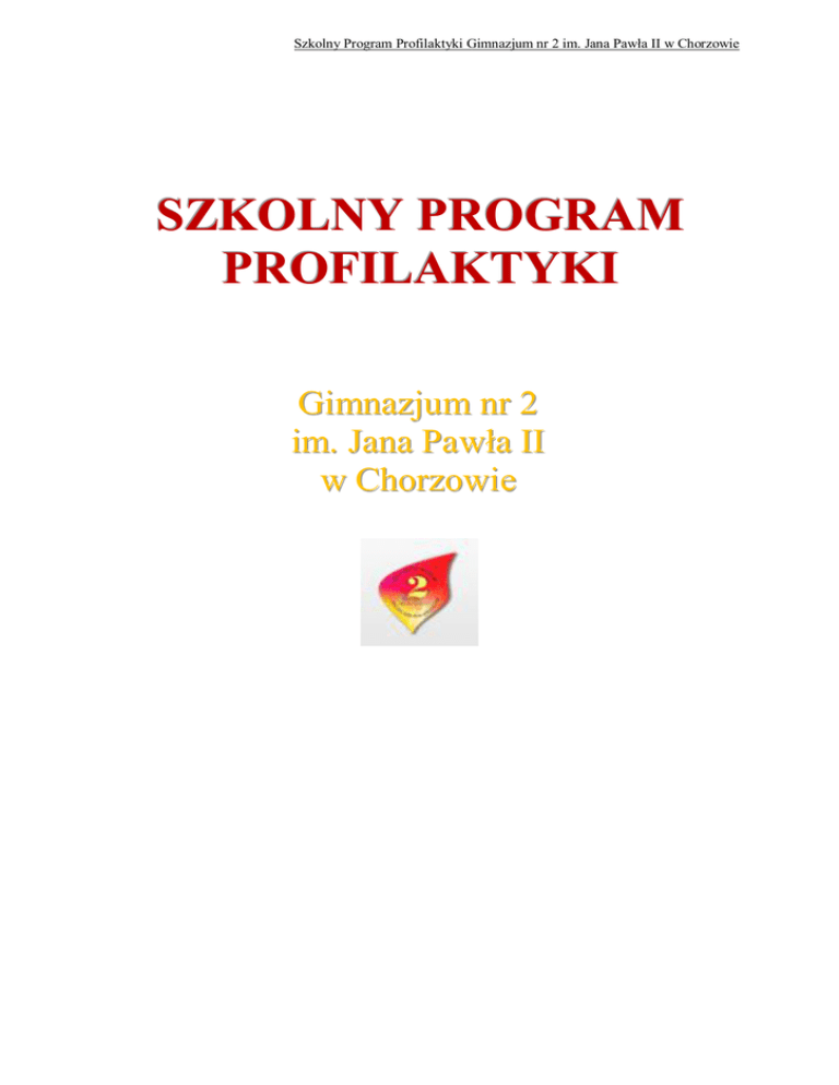 Szkolny Program Profilaktyki Gimnazjum nr 2 im. Jana Pawła II w Chorzowie SZKOLNY PROGRAM PROFILAKTYKI Gimnazjum nr 2 im. Jana Pawła II w Chorzowie Szkolny Program Profilaktyki Gimnazjum nr 2 im. Jana Pawła II w Chorzowie 2012-2015 PODSTAWA PRAWNA DO WPROWADZENIA PROGRAMU Szkolny Program Profilaktyki został opracowany w oparciu o aktualne przepisy prawa oświatowego, w tym: - Konstytucja Rzeczpospolitej Polskiej z dnia 2 kwietnia 1997 r. (Dz. U. 1997 nr 78, poz. 483 ze zm.); - Rozporządzenie Ministra Edukacji Narodowej z dnia 30 kwietnia 2013 r. w sprawie zasad udzielania i organizacji pomocy psychologiczno-pedagogicznej w publicznych przedszkolach, szkołach i placówkach; - Rozporządzenie Ministra Edukacji Narodowej z dnia 27 sierpnia 2012 r. w sprawie podstawy programowej wychowania przedszkolnego oraz kształcenia ogólnego w poszczególnych typach szkół (Dz. U. z dnia 30 sierpnia 2012 r.); - Rozporządzenie MENiS z dnia 21 maja 2001 r. w sprawie ramowych statutów publicznego przedszkola oraz publicznych szkół (Dz. U. z 2001 r. Nr 61, poz. 626 z późniejszymi zmianami); - Ustawa o ochronie zdrowia psychicznego z dnia 19 sierpnia 1994r. (Dz. U. Nr 111, poz. 535, z późniejszymi zmianami); - Rozporządzenie Rady Ministrów z dnia 20 sierpnia 1996 r. w sprawie sposobu organizowania i prowadzenia działalności w dziedzinie promocji zdrowia psychicznego i zapobiegania zaburzeniom psychicznym (Dz. U. Nr 112, poz. 537); - Ustawa z dnia 26 października 1982 r. o wychowaniu w trzeźwości i przeciwdziałaniu alkoholizmowi (Dz. U. Nr 35, poz. 230 tekst: ost. zm. 2002.06.25 Dz. U. 02.84.763; tekst jednolity: Dz. U. 2007 r. Nr 70 poz.473 z późn. zm.); - Ustawa o przeciwdziałaniu narkomanii z dnia 29 lipca 2005 (Dz. U. z 2012 poz.124; tekst jedn. z późn. zm.); - Ustawa z dnia 26 października 1982 r. o postępowaniu w sprawach nieletnich (Dz. U. Dz. U. z 2010 nr 33 poz. 178; tekst jednolity z późn. zm.); - Rozporządzenie Ministra Edukacji Narodowej i Sportu z dnia 31 stycznia 2003 r. w sprawie szczegółowych form działalności wychowawczej i zapobiegawczej wśród dzieci i młodzieży zagrożonych uzależnieniem (Dz. U. z 2003r. Nr 26, poz. 226); - Konwencja o Ochronie Praw Człowieka i Podstawowych Wolności (Dz. U. z 1993 r. Nr 61, poz. 284 z późniejszymi zmianami); - Konwencja o Prawach Dziecka (Dz. U. z 1991 r. Nr 120, poz. 526); - Rządowy program Ministerstwa Edukacji Narodowej „Bezpieczna i przyjazna szkoła”; - Statut Szkoły; - Program Profilaktyki 2009-2012. Szkolny Program Profilaktyki Gimnazjum nr 2 im. Jana Pawła II w Chorzowie WSTĘP Szkolny Program Profilaktyki powstał w oparciu o założenia podstawy programowej kształcenia ogólnego dla gimnazjum. Zgodnie z założeniami nauczyciele w pracy wychowawczej, wspierają w tym zakresie obowiązki rodziców, zmierzają do tego, aby uczniowie w szczególności: 1. Znajdywali w szkole środowisko wszechstronnego rozwoju osobowego (w wymiarze intelektualnym, psychicznym, społecznym, zdrowotnym, estetycznym, moralnym, duchowym); 2. Rozwijali w sobie dociekliwość poznawczą, ukierunkowaną na poszukiwanie prawdy, dobra i piękna w świecie; 3. Mieli świadomość życiowej użyteczności, zarówno poszczególnych przedmiotów nauczania, jak całej edukacji na danym etapie; 4. Stawali się coraz bardziej samodzielni w dążeniu do dobra w jego wymiarze indywidualnym i społecznym, godząc dążenie do dobra własnego z dobrem innych, odpowiedzialność za siebie z odpowiedzialnością za innych, wolność własną z wolnością innych; 5. Poszukiwali, odkrywali i dążyli na drodze rzetelnej pracy do osiągnięcia celów życiowych i wartości ważnych dla odnalezienia własnego miejsca w świecie; 6. Uczyli się szacunku dla dobra wspólnego jako podstawy życia społecznego oraz przygotowywali się do życia w rodzinie, w społeczności lokalnej i w państwie; 7. Przygotowywali się do rozpoznawania wartości moralnych, dokonywania wyborów i hierarchizacji wartości oraz mieli możliwość doskonalenia się; 8. Kształtowali w sobie postawę dialogu, umiejętność słuchania innych i rozumienia ich poglądów, umieli współdziałać i współtworzyć w szkole wspólnotę nauczycieli i uczniów. Wyżej wymienione działania realizowane są poprzez treści podstawy programowej, właściwą postawę i zachowanie nauczyciela wobec konkretnych uczniów (dostosowywanie wymagań edukacyjnych, indywidualizacja procesu dydaktycznego, komunikacja z uczniem) ZAŁOŻENIA OGÓLNE Profilaktyka to proces wspomagania człowieka w radzeniu sobie z trudnościami zagrażającymi prawidłowemu rozwojowi i zdrowemu życiu, a także ograniczanie i likwidowanie czynników niekorzystnych dla życia i zdrowia człowieka. Działania profilaktyczne stanowią wyspecjalizowaną część działań wychowawczych. Wychowanie to świadomie organizowana działalność społeczna, której celem jest wywołanie zamierzonych zmian w osobowości wychowanka. Wychowanie jest rodzajem sztuki, w której bardzo ważną rolę odgrywają stosunki wychowawcze między wychowankiem a wychowawcą. Określając wychowanka podmiotowo wychowawcy mogą stać się Szkolny Program Profilaktyki Gimnazjum nr 2 im. Jana Pawła II w Chorzowie rzeczywistymi autorytetami, doradcami, mistrzami i przewodnikami swoich uczniów. Staramy się nawiązywać silne i autentyczne więzi z naszymi uczniami. Uczeń jako człowiek stanowi wartość bezwarunkową. Nauczyciele i wychowawcy szczerze wyrażają uczucia, których doznają, jednocześnie empatycznie odnosząc się do doznań i przeżyć wychowanków. Wychowanie rozumiemy więc jako proces wspomagania dziecka w rozwoju ukierunkowanym na osiągnięcie pełnej dojrzałości fizycznej, psychicznej, społecznej i duchowej. Szkolny Program Profilaktyki jest dostosowany do potrzeb rozwojowych uczniów oraz środowiska lokalnego Gimnazjum nr 2. Metody jego realizacji respektują prawa człowieka i prawa dziecka zawarte w