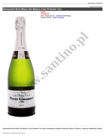 Informacje o produkcie Utworzono 07-03-2017 Gimonnet Brut Blanc De Blancs Cuis Premier Cru Cena : 173,00 zł w w w .s an t in o. pl Stan magazynowy : poniżej średniego Średnia ocena : brak recenzji Gimonnet Brut Blanc De Blancs Cuis Premier Cru jest szampanem dobrze znanym także w Polsce, srebrny medalista Grand Wygenerowano w programie www.oscGold.com Prix Magazynu Wini 2011. Jak na dzisiejsze standardy jest ekstremalnie młody, bowiem dojrzewa na osadzie jedynie 18 miesięcy, ale wbrew pozorom nie jest banalny ani pozbawiony głębi. Tak właśnie uważają bracia, twierdząc że ''dobre wino nie powstaje dlatego, że leży trzy lata w piwnicy, ale wtedy, gdy osiąga odpowiedni dla siebie balans i harmonie''. Około 25 procent z bieżącego rocznika plus rezerwa z trzech poprzednich. Ciekawostką jest że Gimonnet przechowuje swoje wino z rezerwy w butelkach, a nie w kadziach. Metoda jest unikalna i pozwala na zachowanie świeżości wina. Czuć to wyraźnie w tym wyjątkowym blanc de blancs. Aromat młodych jabłek, limonki i gruszki azjatyckiej, wszystko zadziwia dojrzałą formą z pięknie zrównoważoną kwasowością. pl Historia winnicy sięga XVIII wieku, jednak dopiero w okresie międzywojennym rozpoczęto tu winifikacje. Pierwszy cennik został opublikowany przez Pierra Gimonnet w 1935 roku, ale dopiero jego syn Michel z wielką pasją i oddaniem opracował szczegółowe założenia pełnej gamy szampanów. Obecnie Dom Szampański prowadzą bracia Olivier i Didier. Powierzchnia winnicy to aż 28 hektarów, na których rosną tylko szczepy Chardonnay. in o. Ciekawostką jest fakt, że winorośle należące do rodziny Gimonnet, są z reguły bardzo wiekowe, najstarsze z nich zostały zasadzone w 1911 roku, a połowa wszystkich winorośli ma czterdzieści lub więcej lat. Rocznie powstaje 250.000 butelek, z czego 40% trafia na rynek francuski, 40% na rynek europejki, a 20% sprzedaży stanowią dalekie destynacje. Szampany tworzone przez braci to niesamowita magia asemblaży dla prawdziwych koneserów niuansów. w w w .s an t Ich celem jest stworzenie wina które będzie im smakować przede wszystkim, w równym stopniu smakuje też innym. Ten niewielki producent cieszy się już bardzo dużą renomą, a jego produkty są regularnie nagradzane, również w Polsce.