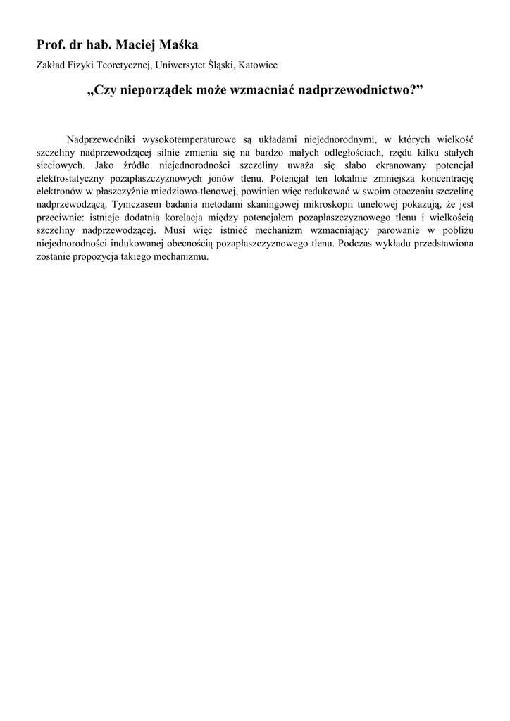 Prof. dr hab. Maciej Maśka Zakład Fizyki Teoretycznej, Uniwersytet Śląski, Katowice „Czy nieporządek moŜe wzmacniać nadprzewodnictwo?” Nadprzewodniki wysokotemperaturowe są układami niejednorodnymi, w których wielkość szczeliny nadprzewodzącej silnie zmienia się na bardzo małych odległościach, rzędu kilku stałych sieciowych. Jako źródło niejednorodności szczeliny uwaŜa się słabo ekranowany potencjał elektrostatyczny pozapłaszczyznowych jonów tlenu. Potencjał ten lokalnie zmniejsza koncentrację elektronów w płaszczyźnie miedziowo-tlenowej, powinien więc redukować w swoim otoczeniu szczelinę nadprzewodzącą. Tymczasem badania metodami skaningowej mikroskopii tunelowej pokazują, Ŝe jest przeciwnie: istnieje dodatnia korelacja między potencjałem pozapłaszczyznowego tlenu i wielkością szczeliny nadprzewodzącej. Musi więc istnieć mechanizm wzmacniający parowanie w pobliŜu niejednorodności indukowanej obecnością pozapłaszczyznowego tlenu. Podczas wykładu przedstawiona zostanie propozycja takiego mechanizmu.