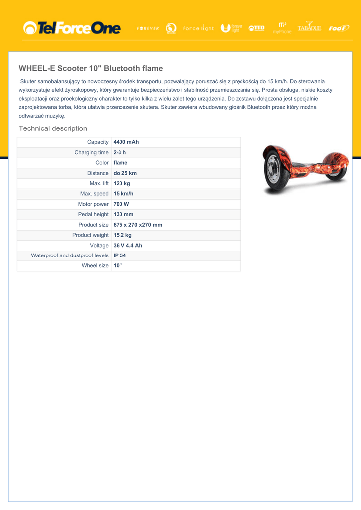 WHEEL-E Scooter 10" Bluetooth flame Skuter samobalansujący to nowoczesny środek transportu, pozwalający poruszać się z prędkością do 15 km/h. Do sterowania wykorzystuje efekt żyroskopowy, który gwarantuje bezpieczeństwo i stabilność przemieszczania się. Prosta obsługa, niskie koszty eksploatacji oraz proekologiczny charakter to tylko kilka z wielu zalet tego urządzenia. Do zestawu dołączona jest specjalnie zaprojektowana torba, która ułatwia przenoszenie skutera. Skuter zawiera wbudowany głośnik Bluetooth przez który można odtwarzać muzykę. Technical description Capacity 4400 mAh Charging time 2-3 h Color flame Distance do 25 km Max. lift 120 kg Max. speed 15 km/h Motor power 700 W Pedal height 130 mm Product size 675 x 270 x270 mm Product weight 15.2 kg Voltage 36 V 4.4 Ah Waterproof and dustproof levels IP 54 Wheel size 10"