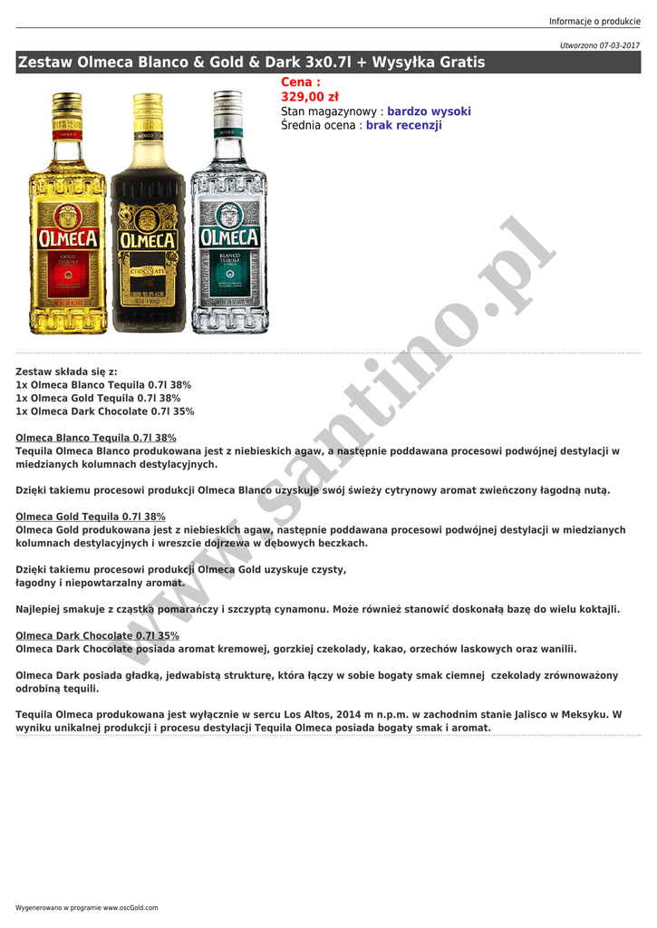 Informacje o produkcie Utworzono 07-03-2017 Zestaw Olmeca Blanco & Gold & Dark 3x0.7l + Wysyłka Gratis Cena : 329,00 zł an t Zestaw składa się z: 1x Olmeca Blanco Tequila 0.7l 38% 1x Olmeca Gold Tequila 0.7l 38% 1x Olmeca Dark Chocolate 0.7l 35% in o. pl Stan magazynowy : bardzo wysoki Średnia ocena : brak recenzji Olmeca Blanco Tequila 0.7l 38% Tequila Olmeca Blanco produkowana jest z niebieskich agaw, a następnie poddawana procesowi podwójnej destylacji w miedzianych kolumnach destylacyjnych. .s Dzięki takiemu procesowi produkcji Olmeca Blanco uzyskuje swój świeży cytrynowy aromat zwieńczony łagodną nutą. w Olmeca Gold Tequila 0.7l 38% Olmeca Gold produkowana jest z niebieskich agaw, następnie poddawana procesowi podwójnej destylacji w miedzianych kolumnach destylacyjnych i wreszcie dojrzewa w dębowych beczkach. w w Dzięki takiemu procesowi produkcji Olmeca Gold uzyskuje czysty, łagodny i niepowtarzalny aromat. Najlepiej smakuje z cząstką pomarańczy i szczyptą cynamonu. Może również stanowić doskonałą bazę do wielu koktajli. Olmeca Dark Chocolate 0.7l 35% Olmeca Dark Chocolate posiada aromat kremowej, gorzkiej czekolady, kakao, orzechów laskowych oraz wanilii. Olmeca Dark posiada gładką, jedwabistą strukturę, która łączy w sobie bogaty smak ciemnej czekolady zrównoważony odrobiną tequili. Tequila Olmeca produkowana jest wyłącznie w sercu Los Altos, 2014 m n.p.m. w zachodnim stanie Jalisco w Meksyku. W wyniku unikalnej produkcji i procesu destylacji Tequila Olmeca posiada bogaty smak i aromat. Wygenerowano w programie www.oscGold.com