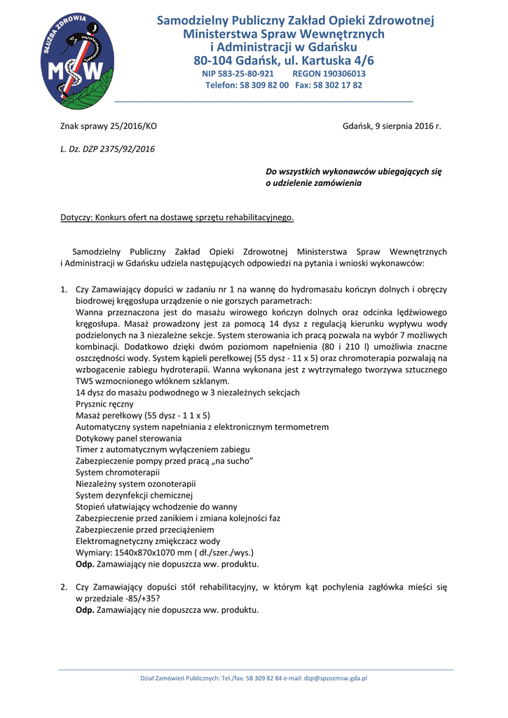 Samodzielny Publiczny Zakład Opieki Zdrowotnej Ministerstwa Spraw Wewnętrznych i Administracji w Gdańsku 80-104 Gdańsk, ul. Kartuska 4/6 NIP 583-25-80-921 REGON 190306013 Telefon: 58 309 82 00 Fax: 58 302 17 82 _______________________________________________________________ Znak sprawy 25/2016/KO Gdańsk, 9 sierpnia 2016 r. L. Dz. DZP 2375/92/2016 Do wszystkich wykonawców ubiegających się o udzielenie zamówienia Dotyczy: Konkurs ofert na dostawę sprzętu rehabilitacyjnego. Samodzielny Publiczny Zakład Opieki Zdrowotnej Ministerstwa Spraw Wewnętrznych i Administracji w Gdańsku udziela następujących odpowiedzi na pytania i wnioski wykonawców: 1. Czy Zamawiający dopuści w zadaniu nr 1 na wannę do hydromasażu kończyn dolnych i obręczy biodrowej kręgosłupa urządzenie o nie gorszych parametrach: Wanna przeznaczona jest do masażu wirowego kończyn dolnych oraz odcinka lędźwiowego kręgosłupa. Masaż prowadzony jest za pomocą 14 dysz z regulacją kierunku wypływu wody podzielonych na 3 niezależne sekcje. System sterowania ich pracą pozwala na wybór 7 możliwych kombinacji. Dodatkowo dzięki dwóm poziomom napełnienia (80 i 210 l) umożliwia znaczne oszczędności wody. System kąpieli perełkowej (55 dysz - 11 x 5) oraz chromoterapia pozwalają na wzbogacenie zabiegu hydroterapii. Wanna wykonana jest z wytrzymałego tworzywa sztucznego TWS wzmocnionego włóknem szklanym. 14 dysz do masażu podwodnego w 3 niezależnych sekcjach Prysznic ręczny Masaż perełkowy (55 dysz - 1 1 x 5) Automatyczny system napełniania z elektronicznym termometrem Dotykowy panel sterowania Timer z automatycznym wyłączeniem zabiegu Zabezpieczenie pompy przed pracą „na sucho” System chromoterapii Niezależny system ozonoterapii System dezynfekcji chemicznej Stopień ułatwiający wchodzenie do wanny Zabezpieczenie przed zanikiem i zmiana kolejności faz Zabezpieczenie przed przeciążeniem Elektromagnetyczny zmiękczacz wody Wymiary: 1540x870x1070 mm ( dł./szer./wys.) Odp. Zamawiający nie dopuszcza ww. produktu. 2. Czy Zamawiający dopuści stół rehabilitacyjny, w którym kąt pochylenia zagłówka mieści się w przedziale -85/+35? Odp. Zamawiający nie dopuszcza ww. produktu. Dział Zamówień Publicznych: Tel./fax: 58 309 82 84 e-mail: [email protected] 2|S t r o n a 3. Czy Zamawiający dopuści stół rehabilitacyjny, gdzie regulacja sekcji nożnej odbywa się za pomocą jednej sprężyny gazowej? Odp. Zamawiający nie dopuszcza ww. produktu. 4. Czy Zamawiający dopuści stół rehabilitacyjny z regulacją wysokości w przedziale 490-1050 mm? Odp. Zamawiający nie dopuszcza ww. produktu. 5. Czy Zamawiający dopuści stół rehabilitacyjny o wymiarach 1900x660 mm? Odp. Zamawiający nie dopuszcza ww. produktu. Z poważaniem Zca Dyrektora ds. administracyjno-ekonomicznych Samodzielnego Publicznego Zakładu Opieki Zdrowotnej Ministerstwa Spraw Wewnętrznych i Administracji w Gdańsku Mariusz Pikuła Dział Zamówień Publicznych: Tel./fax: 58 309 82 84 e-mail: [email protected]