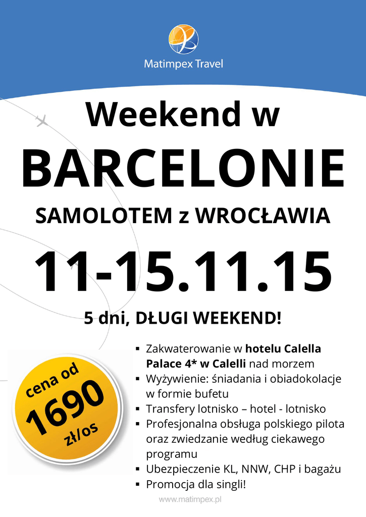 Weekend w BARCELONIE SAMOLOTEM z WROCŁAWIA 11-15.11.15 5 dni, DŁUGI WEEKEND! Zakwaterowanie w hotelu Calella Palace 4* w Calelli nad morzem Wyżywienie: śniadania i obiadokolacje w formie bufetu Transfery lotnisko – hotel - lotnisko Profesjonalna obsługa polskiego pilota oraz zwiedzanie według ciekawego programu Ubezpieczenie KL, NNW, CHP i bagażu Promocja dla singli!