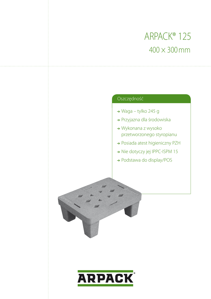 ARPACK® 125 400 × 300 mm Oszczędność ➔ Waga – tylko 245 g ➔ Przyjazna dla środowiska ➔ ykonana z wysoko W przetworzonego styropianu ➔ Posiada atest higieniczny PZH ➔ Nie dotyczy jej IPPC-ISPM 15 ➔ Podstawa do display/POS Styropaleta ARPACK 125 o wadze tylko 245 g jest doskonałą podstawką do budowy stosowanego w wielu branżach display/POS. Dzięki czystej i zmywalnej powierzchni oraz atestowi higienicznemu Państwowego Zakładu Higieny Styropaleta ARPACK 125 nadaje się do transportu i prezentacji wszelkich artykułów spożywczych i higienicznych. Styropaleta ARPACK 125 jest elastycznym i efektywnym rozwiązaniem w transporcie lekkich ładunków. Przy odpowiednim użytkowaniu paleta może zostać użyta przez co najmniej kolejne 30 cykli transportowych. ARPACK® 125 Opis Podstawa 4 stopy Podjazd wózkiem widłowym 2 strony Wysokie składowanie - Sztaplowanie tak Dane techniczne* Wymiary 398 × 298 mm Wysokość 140 mm Waga 245 g Materiał EPS standard: szara (inne kolory na życzenie klienta – niebieski, żółty, czerwony, zielony, biały, fioletowy, brązowy) -40 bis +50˚ C Kolor Warunki termiczne Nośność (Maksymalna)** Obciążenie statyczne 300 kg Obciążenie dynamiczne 125 kg Wyposażenie dodatkowe Oznakowanie palety, np. logo klienta, Dodatkowy display kartonowy, RFID *Wszystkie dane techniczne odnoszą się do charakterystycznych właściwości, które zostały stwierdzone podczas określonych warunków pracy. Inne zastosowanie, rodzaj obciążenia, temperatura otoczenia i wielokrotność użytkowania mogą wpłynąć na odchylenia od podanych powyżej parametrów technicznych. Zapewniamy możliwość testu produktu. ** Obciążenie statyczne: nacisk na paletę na równomiernie rozłożonym obciążeniu w temperaturze ok. 20˚ C Obciążenie dynamiczne: podczas pracy wózkiem widłowym z równomiernym obciążeniem przy szerokim rozstawie wideł i temperaturze ok. 20˚ C Arpack Polska Sp. z o.o. Osiedle Przemysłowe 2 PL 69-100 Słubice T. +48 95 750 13 10 | F. +48 95 750 13 13 www.arpack.pl | [email protected]