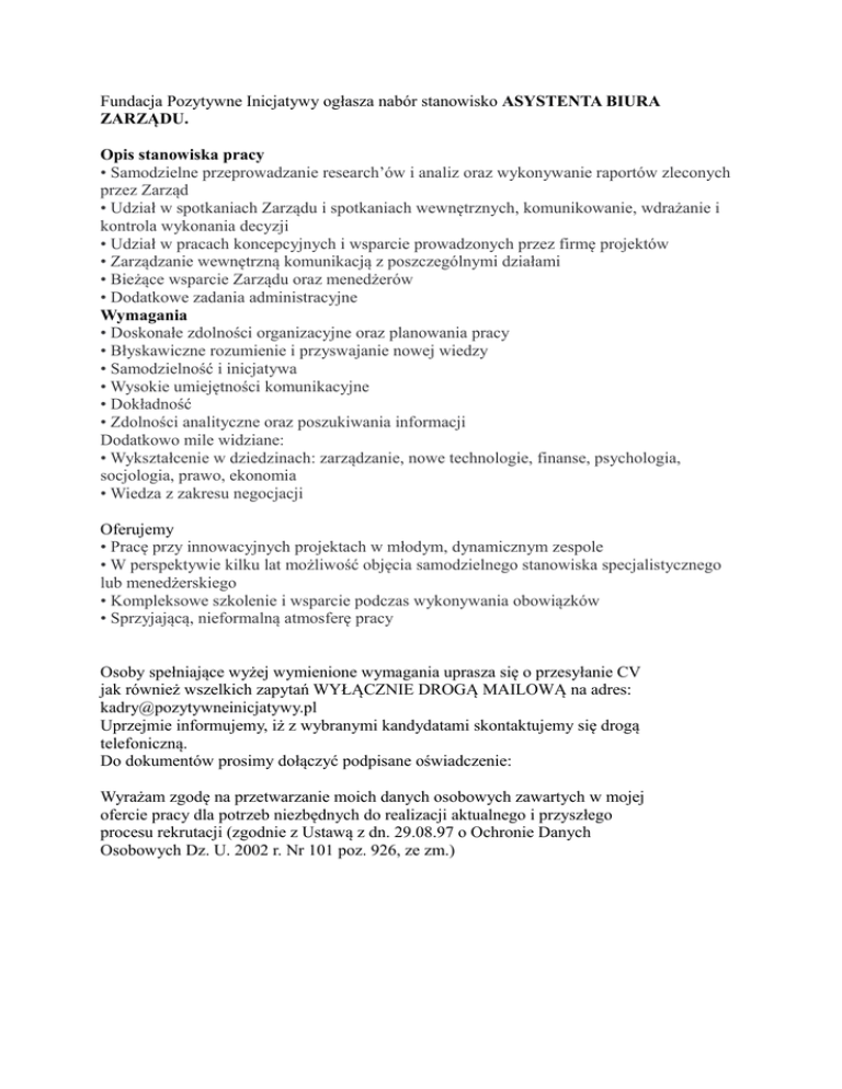 Fundacja Pozytywne Inicjatywy ogłasza nabór stanowisko ASYSTENTA BIURA ZARZĄDU. Opis stanowiska pracy • Samodzielne przeprowadzanie research’ów i analiz oraz wykonywanie raportów zleconych przez Zarząd • Udział w spotkaniach Zarządu i spotkaniach wewnętrznych, komunikowanie, wdrażanie i kontrola wykonania decyzji • Udział w pracach koncepcyjnych i wsparcie prowadzonych przez firmę projektów • Zarządzanie wewnętrzną komunikacją z poszczególnymi działami • Bieżące wsparcie Zarządu oraz menedżerów • Dodatkowe zadania administracyjne Wymagania • Doskonałe zdolności organizacyjne oraz planowania pracy • Błyskawiczne rozumienie i przyswajanie nowej wiedzy • Samodzielność i inicjatywa • Wysokie umiejętności komunikacyjne • Dokładność • Zdolności analityczne oraz poszukiwania informacji Dodatkowo mile widziane: • Wykształcenie w dziedzinach: zarządzanie, nowe technologie, finanse, psychologia, socjologia, prawo, ekonomia • Wiedza z zakresu negocjacji Oferujemy • Pracę przy innowacyjnych projektach w młodym, dynamicznym zespole • W perspektywie kilku lat możliwość objęcia samodzielnego stanowiska specjalistycznego lub menedżerskiego • Kompleksowe szkolenie i wsparcie podczas wykonywania obowiązków • Sprzyjającą, nieformalną atmosferę pracy Osoby spełniające wyżej wymienione wymagania uprasza się o przesyłanie CV jak również wszelkich zapytań WYŁĄCZNIE DROGĄ MAILOWĄ na adres: [email protected] Uprzejmie informujemy, iż z wybranymi kandydatami skontaktujemy się drogą telefoniczną. Do dokumentów prosimy dołączyć podpisane oświadczenie: Wyrażam zgodę na przetwarzanie moich danych osobowych zawartych w mojej ofercie pracy dla potrzeb niezbędnych do realizacji aktualnego i przyszłego procesu rekrutacji (zgodnie z Ustawą z dn. 29.08.97 o Ochronie Danych Osobowych Dz. U. 2002 r. Nr 101 poz. 926, ze zm.)