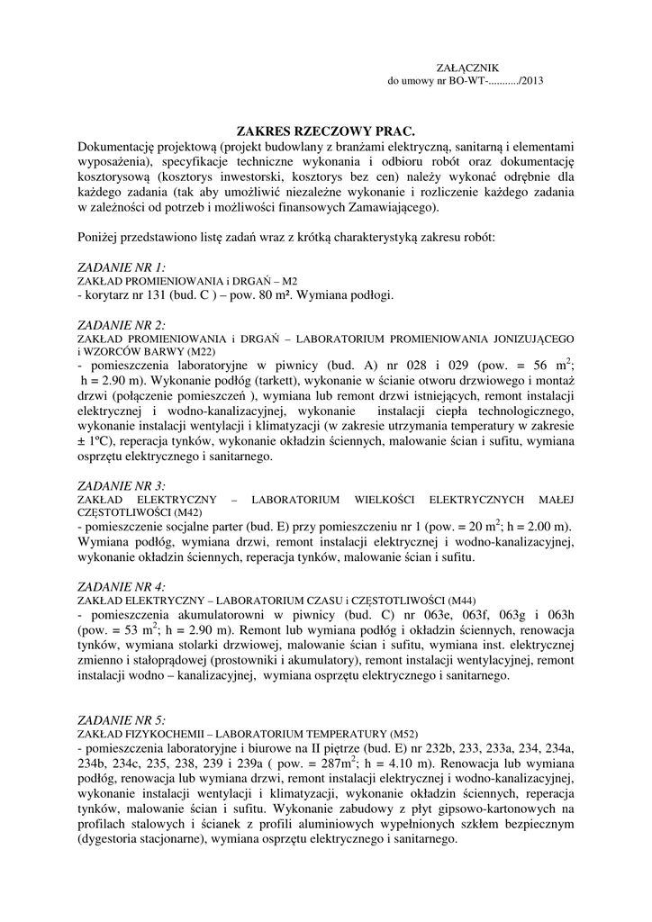 ZAŁĄCZNIK do umowy nr BO-WT-.........../2013 ZAKRES RZECZOWY PRAC. Dokumentację projektową (projekt budowlany z branżami elektryczną, sanitarną i elementami wyposażenia), specyfikacje techniczne wykonania i odbioru robót oraz dokumentację kosztorysową (kosztorys inwestorski, kosztorys bez cen) należy wykonać odrębnie dla każdego zadania (tak aby umożliwić niezależne wykonanie i rozliczenie każdego zadania w zależności od potrzeb i możliwości finansowych Zamawiającego). Poniżej przedstawiono listę zadań wraz z krótką charakterystyką zakresu robót: ZADANIE NR 1: ZAKŁAD PROMIENIOWANIA i DRGAŃ – M2 - korytarz nr 131 (bud. C ) – pow. 80 m². Wymiana podłogi. ZADANIE NR 2: ZAKŁAD PROMIENIOWANIA i DRGAŃ – LABORATORIUM PROMIENIOWANIA JONIZUJĄCEGO i WZORCÓW BARWY (M22) - pomieszczenia laboratoryjne w piwnicy (bud. A) nr 028 i 029 (pow. = 56 m2; h = 2.90 m). Wykonanie podłóg (tarkett), wykonanie w ścianie otworu drzwiowego i montaż drzwi (połączenie pomieszczeń ), wymiana lub remont drzwi istniejących, remont instalacji elektrycznej i wodno-kanalizacyjnej, wykonanie instalacji ciepła technologicznego, wykonanie instalacji wentylacji i klimatyzacji (w zakresie utrzymania temperatury w zakresie ± 1ºC), reperacja tynków, wykonanie okładzin ściennych, malowanie ścian i sufitu, wymiana osprzętu elektrycznego i sanitarnego. ZADANIE NR 3: ZAKŁAD ELEKTRYCZNY CZĘSTOTLIWOŚCI (M42) – LABORATORIUM WIELKOŚCI ELEKTRYCZNYCH MAŁEJ - pomieszczenie socjalne parter (bud. E) przy pomieszczeniu nr 1 (pow. = 20 m2; h = 2.00 m). Wymiana podłóg, wymiana drzwi, remont instalacji elektrycznej i wodno-kanalizacyjnej, wykonanie okładzin ściennych, reperacja tynków, malowanie ścian i sufitu. ZADANIE NR 4: ZAKŁAD ELEKTRYCZNY – LABORATORIUM CZASU i CZĘSTOTLIWOŚCI (M44) - pomieszczenia akumulatorowni w piwnicy (bud. C) nr 063e, 063f, 063g i 063h (pow. = 53 m2; h = 2.90 m). Remont lub wymiana podłóg i okładzin ściennych, renowacja tynków, wymiana stolarki drzwiowej, malowanie ścian i sufitu, wymiana inst. elektrycznej zmienno i stałoprądowej (prostowniki i akumulatory), remont instalacji wentylacyjnej, remont instalacji wodno – kanalizacyjnej, wymiana osprzętu elektrycznego i sanitarnego. ZADANIE NR 5: ZAKŁAD FIZYKOCHEMII – LABORATORIUM TEMPERATURY (M52) - pomieszczenia laboratoryjne i biurowe na II piętrze (bud. E) nr 232b, 233, 233a, 234, 234a, 234b, 234c, 235, 238, 239 i 239a ( pow. = 287m2; h = 4.10 m). Renowacja lub wymiana podłóg, renowacja lub wymiana drzwi, remont instalacji elektrycznej i wodno-kanalizacyjnej, wykonanie instalacji wentylacji i klimatyzacji, wykonanie okładzin ściennych, reperacja tynków, malowanie ścian i sufitu. Wykonanie zabudowy z płyt gipsowo-kartonowych na profilach stalowych i ścianek z profili aluminiowych wypełnionych szkłem bezpiecznym (dygestoria stacjonarne), wymiana osprzętu elektrycznego i sanitarnego. ZADANIE NR 6: ZAKŁAD FIZYKOCHEMII – LABORATORIUM ELEKTROCHEMII (M53) - pomieszczenia biurowe na III piętrze (bud. C) nr 319, 320, 320a i 320b (pow. = 47 m2; h = 4.05 m). Renowacja lub wymiana podłóg, renowacja lub wymiana drzwi, remont instalacji elektrycznej i wodno-kanalizacyjnej, wykonanie okładzin ściennych, reperacja tynków, malowanie ścian i sufitu, wymiana osprzętu elektrycznego i sanitarnego. ZADANIE NR 7: ZAKŁAD FIZYKOCHEMII – LABORATORIUM ELEKTROCHEMII (M53) - pomieszczenie laboratoryjne na III piętrze (bud. C) nr 328, 329 (pow. = 43 m2; h = 4.05 m). Renowacja podłogi, remont instalacji wodno-kanalizacyjnej, renowacja tynków, malowanie ścian i sufitu, wymiana osprzętu elektrycznego. ZADANIE NR 8: ZAKŁAD FIZYKOCHEMII – LABORATORIUM GĘSTOŚCI, LEPKOŚCI i ANALIZY SPEKTRALNEJ (M55) - pomieszczenia laboratoryjne na III piętrze (bud. E) nr 345 i 346 (pow. = 54 m2; h = 4.35 m). Wymiana podłóg, wymiana drzwi, remont instalacji elektrycznej i wodno-kanalizacyjnej, wykonanie okładzin ściennych, reperacja tynków, malowanie ścian i sufitu, wymiana osprzętu elektrycznego i sanitarnego. ZADANIE NR 9: BIURO OBSŁUGI URZĘDU - korytarz I piętro (bud. A) nr K-1 (pow. = 53m2 h = 4.50 m).Wymiana lub renowacja drzwi, remont lub wymiana naświetli nad drzwiami, remont instalacji elektrycznej, reperacje tynków, renowacja podłogi, malowanie ścian i sufitu, wymiana osprzętu elektrycznego. ZADANIE NR 10: BIURO OBSŁUGI URZĘDU - korytarz i klatka schodowa II piętro (bud. A) nr K-1; K – 2 i KL - I (pow. = 197m2 h = 4.15 m). Wymiana lub renowacja drzwi, remont lub wymiana naświetli nad drzwiami, remont instalacji elektrycznej, reperacje tynków, renowacja podłogi, malowanie ścian i sufitu, wymiana osprzętu elektrycznego. ZADANIE NR 11: BIURO OBSŁUGI URZĘDU - lokal IV piętro (bud. B) lok. nr 8(pow. = 42 m2; h = 2.70 m). Remont lub wymiana podłóg i okładzin ściennych, renowacja tynków, wymiana stolarki drzwiowej, malowanie ścian i sufitu, wymiana inst. elektrycznej, remont instalacji wodno – kanalizacyjnej, wymiana osprzętu elektrycznego i sanitarnego. . UWAGA! Zamawiający posiada projekt architektoniczny obiektu w formie elektronicznej (w programie AutoCad LT 2005)
