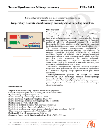 TermoHigroBarometr Mikroprocesorowy _______________ THB - 201 L _____________________________________________________________ TermoHigroBarometr jest nowoczesnym miernikiem służącym do pomiaru: temperatury, ciśnienia atmosferycznego oraz wilgotności względnej powietrza. _______________ Opis przyrządu Miernik jest umieszczony w obudowie plastikowej i może być zasilany zarówno napięciem 12 V dc jak i z sieci 230V, co w znaczący sposób rozszerza zakres stosowania przyrządu. Jego łatwa obsługa oraz małe rozmiary zapewniają duży komfort pomiarów oraz szerokie zastosowanie zarówno w badaniach naukowych jak i w laboratoriach pomiarowych i punktach legalizacyjnych, gdzie zgodnie z obowiązującymi przepisami istnieje konieczność monitorowania warunków środowiskowych. Tor pomiaru ciśnienia barometrycznego współpracuje z półprzewodnikowym czujnikiem ciśnienia bezwzględnego. Tor pomiaru temperatury urządzenia współpracuje z oporowym czujnikiem Pt-100, zaś unikalna funkcja preprogramowalnego dopasowania charakterystyki temperaturowej czujnika umożliwia precyzyjny pomiar temperatury. Tor pomiaru wilgotności względnej współpracuje z czujnikiem pojemnościowym a zastosowanie preprogramowalnego dopasowania charakterystyki czujnika zapewnia minimalny błąd pomiaru. Zastosowanie mikroprocesora zapewnia właściwą współpracę wszystkich torów pomiarowych, zaś wykorzystanie wyświetlacza LED umożliwia dogodny odczyt wyników nawet przy słabym oświetleniu. TermoHigroBarometr pozwala na odczyt na swoim wyświetlaczu LED aktualnego ciśnienia atmosferycznego, temperatury i wilgotności względnej powietrza. Jaskrawość świecenia wyświetlaczy LED może być regulowana przez użytkownika w zależności od oświetlenia w miejscu stosowania miernika. Dane techniczne Wejście: Półprzewodnikowy Czujnik Ciśnienia Bezwzględnego Czujnik temperatury: Pt-100 kl.B według PN-EN 60752+A2:1999 Pojemnościowy Czujnik Wilgotności Zakres mierzonej temperatury: -25°C do + 60°C Zakres mierzonej wilgotności względnej: 5% do 98% Zakres mierzonego ciśnienia bezwzględnego: 850 do 1050 hPa Rozdzielczość: 0,1°C/0,5%RH/ 1 hPa Dokładność pomiaru ciśnienia: 0,2% zakresu pomiarowego Dokładność pomiaru wilgotności względnej: + 3% w.w Dokładność pomiaru temperatury (bez uwzględnienia błędu czujnika): + 0,08°C Odczyt mierzonych parametrów: Wyświetlacze LED Zasilanie: 12 V dc lub poprzez adapter 230 V ac Obudowa: Czarny plastik; Wymiary obudowy: D200 x W95 x G37 mm ___________________________________________________________________________________ APG-INNOWACJE Jolanta Góralczyk, 41-400 Mysłowice, ul. Mikołowska 29, NIP 222-016-29-35 tel./ fax: 32 317 31 13, kom. 502 430 657, e-mail: [email protected], www.apg-innowacje.pl ___________________