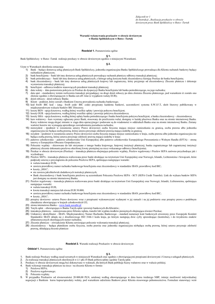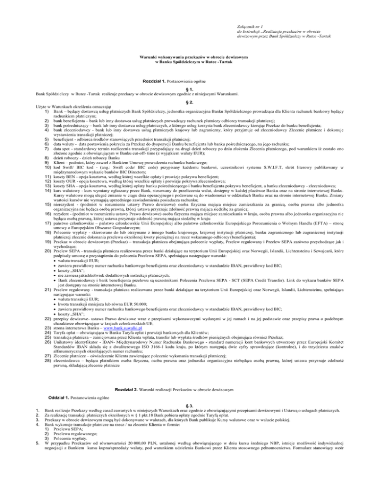 Załącznik nr 1 do Instrukcji „Realizacja przekazów w obrocie dewizowym przez Bank Spółdzielczy w Rutce -Tartak Warunki wykonywania przekazów w obrocie dewizowym w Banku Spółdzielczym w Rutce -Tartak Rozdział 1. Postanowienia ogólne § 1. Bank Spółdzielczy w Rutce -Tartak realizuje przekazy w obrocie dewizowym zgodnie z niniejszymi Warunkami. § 2. Użyte w Warunkach określenia oznaczają: 1) Bank – będący dostawcą usług płatniczych Bank Spółdzielczy, jednostka organizacyjna Banku Spółdzielczego prowadząca dla Klienta rachunek bankowy będący rachunkiem płatniczym; 2) bank beneficjenta – bank lub inny dostawca usług płatniczych prowadzący rachunek płatniczy odbiorcy transakcji płatniczej; 3) bank pośredniczący – bank lub inny dostawca usług płatniczych, z którego usług korzysta bank zleceniodawcy kierując Przekaz do banku beneficjenta; 4) bank zleceniodawcy - bank lub inny dostawca usług płatniczych krajowy lub zagraniczny, który przyjmuje od zleceniodawcy Zlecenie płatnicze i dokonuje wystawienia transakcji płatniczej; 5) beneficjent - odbiorca środków stanowiących przedmiot transakcji płatniczej; 6) data waluty - data postawienia pokrycia za Przekaz do dyspozycji Banku beneficjenta lub banku pośredniczącego, na jego rachunku; 7) data spot - standardowy termin rozliczenia transakcji przypadający na drugi dzień roboczy po dniu złożenia Zlecenia płatniczego, pod warunkiem iż zostało ono złożone zgodnie z obowiązującym w Banku cut-off- time (z wyjątkiem waluty EUR); 8) dzień roboczy - dzień roboczy Banku 9) Klient – podmiot, który zawarł z Bankiem Umowę prowadzenia rachunku bankowego; 10) kod Swift/ BIC kod - (ang.: Swift code/ BIC code) przypisany każdemu bankowi, uczestnikowi systemu S.W.I.F.T, skrót literowy publikowany w międzynarodowym wykazie banków BIC Directory; 11) koszty BEN - opcja kosztowa, według której wszelkie opłaty i prowizje pokrywa beneficjent; 12) koszty OUR - opcja kosztowa, według której wszelkie opłaty i prowizje pokrywa zleceniodawca; 13) koszty SHA - opcja kosztowa, według której opłaty banku pośredniczącego i banku beneficjenta pokrywa beneficjent, a banku zleceniodawcy - zleceniodawca; 14) kurs walutowy - kurs wymiany ogłaszany przez Bank, stosowany do przeliczenia walut, dostępny w każdej placówce Banku oraz na stronie internetowej Banku. Kursy walutowe mogą ulegać zmianie w ciągu dnia operacyjnego i podawane są do wiadomości w oddziałach Banku oraz na stronie internetowej Banku. Zmiany wartości kursów nie wymagają uprzedniego zawiadomienia posiadacza rachunku; 15) nierezydent - (podmiot w rozumieniu ustawy Prawo dewizowe) osoba fizyczna mająca miejsce zamieszkania za granicą, osoba prawna albo jednostka organizacyjna nie będąca osobą prawną, której ustawa przyznaje zdolność prawną mająca siedzibę za granicą; 16) rezydent - (podmiot w rozumieniu ustawy Prawo dewizowe) osoba fizyczna mająca miejsce zamieszkania w kraju, osoba prawna albo jednostka organizacyjna nie będąca osobą prawną, której ustawa przyznaje zdolność prawną mająca siedzibę w kraju 17) państwo członkowskie – państwo członkowskie Unii Europejskiej albo państwo członkowskie Europejskiego Porozumienia o Wolnym Handlu (EFTA) – stronę umowy o Europejskim Obszarze Gospodarczym; 18) Polecenie wypłaty - skierowane do lub otrzymane z innego banku krajowego, krajowej instytucji płatniczej, banku zagranicznego lub zagranicznej instytucji płatniczej zlecenie dokonania przelewu określonej kwoty pieniężnej na rzecz wskazanego odbiorcy (beneficjenta); 19) Przekaz w obrocie dewizowym (Przekaz) – transakcja płatnicza obejmująca polecenie wypłaty, Przelew regulowany i Przelew SEPA zarówno przychodzące jak i wychodzące; 20) Przelew SEPA - transakcja płatnicza realizowana przez banki działające na terytorium Unii Europejskiej oraz Norwegii, Islandii, Lichtensteinu i Szwajcarii, które podpisały umowę o przystąpieniu do polecenia Przelewu SEPA, spełniająca następujące warunki: waluta transakcji EUR; zawiera prawidłowy numer rachunku bankowego beneficjenta oraz zleceniodawcy w standardzie IBAN, prawidłowy kod BIC; koszty „SHA”; nie zawiera jakichkolwiek dodatkowych instrukcji płatniczych; Bank zleceniodawcy i bank beneficjenta przelewu są uczestnikami Polecenia Przelewu SEPA - SCT (SEPA Credit Transfer). Link do wykazu banków SEPA jest dostępny na stronie internetowej Banku. 21) Przelew regulowany - transakcja płatnicza realizowana przez banki działające na terytorium Unii Europejskiej oraz Norwegii, Islandii, Lichtensteinu, spełniająca następujące warunki: waluta transakcji EUR; kwota transakcji mniejsza lub równa EUR 50.000; zawiera prawidłowy numer rachunku bankowego beneficjenta oraz zleceniodawcy w standardzie IBAN, prawidłowy kod BIC; koszty „SHA”; 22) przepisy dewizowe- ustawa Prawo dewizowe wraz z przepisami wykonawczymi wydanymi w jej ramach i na jej podstawie oraz przepisy prawa o podobnym charakterze obowiązujące w krajach członkowskich UE; 23) strona internetowa Banku – www.bank.suwalki.pl 24) Taryfa opłat – obowiązująca w Banku Taryfa opłat i prowizji bankowych dla Klientów; 25) transakcja płatnicza – zainicjowana przez Klienta wpłata, transfer lub wypłata środków pieniężnych obejmująca również Przekaz; 26) Unikatowy identyfikator - IBAN- Międzynarodowy Numer Rachunku Bankowego - standard numeracji kont bankowych utworzony przez Europejski Komitet Standardów IBAN składa się z dwuliterowego ISO 3166-1 kodu kraju, po którym następują dwie cyfry sprawdzające (kontrolne), i do trzydziestu znaków alfanumerycznych określających numer rachunku; 27) Zlecenie płatnicze – oświadczenie Klienta zawierające polecenie wykonania transakcji płatniczej; 28) zleceniodawca – będąca płatnikiem osoba fizyczna, osoba prawna oraz jednostka organizacyjna niebędąca osobą prawną, której ustawa przyz