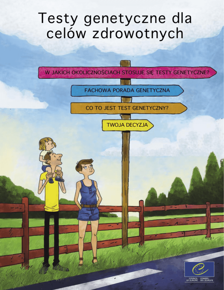 Testy genetyczne dla celów zdrowotnych W JAKICH OKOLICZNOŚCIACH STOSUJE SIĘ TESTY GENETYCZNE? FACHOWA PORADA GENETYCZNA CO TO JEST TEST GENETYCZNY? TWOJA DECYZJA Testy genetyczne dla celów zdrowotnych Wszyscy odziedziczyliśmy unikalną kombinację genów od naszych rodziców. Ten szczególny układ wraz z różnorodnymi czynnikami środowiskowymi oddziałującymi w ciągu naszego życia jest przyczyną różnic między ludźmi pod względem wyglądu, wrażliwości na różne leki, podatności na choroby itp. Postęp nauki daje możliwość badania ludzkiego genomu i poznawania zawartych w nim informacji. Wszelkie badania laboratoryjne wykonywane w celu uzyskania wglądu w informację genetyczną jednostki zwane są testami genetycznymi. Należy pamiętać, ż ew przypadku zdecydowanej większości chorób, Twoje geny tylko częściowowpływają na ryzyko zachorowania. Czynniki takie jak przebyte choroby, styl życia i środowisko również odgrywają tutaj istotną rolę. Celem tej broszury jest przekazanie podstaw wiedzy na temat genetyki i jej wpływu na nasze zdrowie, jak również wyjaśnienie czym są testy genetyczne. 2 Testy genetyczne dla celów zdrowotnych/Rada Europy W jakich okolicznościach stosuje się testy genetyczne ? Testy genetyczne wykonywane dla celówmedycznych mogą dostarczyć informacjiistotnych dla zdrowia człowieka. Istnieje wiele przyczyn, dla których wykonuje się medyczne testy genetyczne. Jeżeli Twój lekarz podejrzewa u Ciebie jakąś chorobę genetyczną, może skierować Cię do lekarza specjalisty, zajmującego się badaniem, diagnozowaniem i ewentualnym leczeniem osób, u których jest podejrzewana lub które mają chorobę genetyczną. Oceni on dokładnie tło Twojej choroby, jej wszelkie indywidualne i rodzinne uwarunkowania oraz występujące u Ciebie objawy. Jeżeli będzie podejrzewał u Ciebie jakąś chorobę genetyczną, w miarę możliwości zaproponuje Ci wykonanie odpowiedniego testu genetycznego, jeżeli takowy istnieje. Test ten może pomóc w postawieniu ostatecznej diagnozy. Potrzeba fachowej porady genetycznej Ze względu na możliwe konsekwencje testów genetycznych, osoby rozważające ich wykonanie powinny skorzystać z porady genetycznej. Udzielana jest ona przez lekarzy specjalistów; poprzez przekazanie obiektywnej informacji porada ma ułatwić Tobie, a w razie potrzeby również Twojej rodzinie, podjęcie stosownej decyzji. Specjalista udzielający porady genetycznej, uwzględniając Twoją sytuację i potrzeby, dostarczy informacji o dostępnych dla Ciebie możliwościach, bez wpływania na Twoją decyzję. W ramach porady genetycznej możesz uzyskać fachowe wsparcie, które pomoże Ci podjąć świadomą decyzję dotyczącą poddania się testowi, zaś już po wykonaniu testu genetycznego umożliwi właściwe zrozumienie jego wyników. Porada i wsparcie może również objąć członków Twojej rodziny. Zatem poradnictwo genetyczne stanowi wsparcie dla osób przed, w trakcie i po wykonaniu testu genetycznego. Najczęstsze przyczyny skierowania na testy genetyczne Ty lub Twoje dziecko macie objawy choroby, a test ma za zadanie ułatwienie postawienia diagnozy lub zidentyfikowanie biologicznej przyczyny tej choroby. W Twojej rodzinie występuje choroba genetyczna i chcesz się dowiedzieć o ryzyku wystąpienia jej u Ciebie W Twojej rodzinie występuje choroba genetyczna lub należysz do grupy lub populacji o zwiększonym ryzyku danej choroby i chcesz się dowiedzieć, czy Twoje dzieci mogą odziedziczyć po Tobie tę chorobę. Macie w swym związku historię poronień. Testy genetyczne dla celów zdrowotnych/Rada Europy 3 Mała powtórka z biologii… Każdy ludzki organizm składa się z bilionów komórek, podstawowych elementów budulcowych wszystkich istot żywych. Komórki zapewniają organizmom ich strukturę. Przetwarzają składniki odżywcze pożywienia w energię oraz wykonują różne wyspecjalizowane funkcje. Komórki tego samego rodzaju tworzą tkanki, które z kolei budują organy. Ponad 200 różnych typów komórek stanowi budulec mięśni, nerwów, płuc, serca, narządów rozrodczych, krwi, itd. Większość komórek posiada jądro, w którym przechowywana jest cała informacja dotycząca rozwoju i prawidłowego funkcjonowania organizmu. Cała ta informacja zapisana jest na biologicznym JĄDRO KOMÓRKA nośniku zwanym DNA (kwas deoksyrybonukleinowy). Jeżeli DNA porównać do długiego zdania opisującego cały organizm, geny są jak poszczególne słowa w tym zdaniu. Gen zaangażowany jest w jedną lub wiele funkcji organizmu. Jeżeli zostanie zniszczony lub uszkodzony nie może spełniać swojej roli. Zestaw wszystkich DNA genów obecnych w CHROMOSOM jądrze komórkowym to inaczej genom. GEN Jądro komórkowe zawiera więc genom, który stanowi „genetyczny szyfr” każdego człowieka. Każde dziecko otrzymuje po połowie swego genomu od każdego z rodziców, stąd genom często zwany jest „nośnikiem dziedziczności”. A co z chromosomami? Chromosomy to struktury widoczne wyłącznie w trakcie podziału komórki, zbudowane głównie z DNA. Ludzie mają 46 chromosomów, a dokładniej 23 pary, bo chromosomy w komórkach występują parami: jedna para chromosomów płci – X i X u kobiet, X i Y u mężczyzn- oraz 22 pary pozostałych chromosomów (zwanych autosomami), które ponumerowane zostały od 1 do 22. 4 Testy genetyczne dla celów zdrowotnych/Rada Europy Co to jest test genetyczny? Test genetyczny to analiza części Twojego DNA. Test może pomóc w ustaleniu, czy doszło do zmian w obrębie określonego genu lub chromosomu. Taka zmiana, nazywana mutacją, może być obecna we wszystkich komórkach organizmu i być przekazywana na kolejne pokolenia. Twoje geny i Twój lekarz Celem zbadania DNA pobierana jest próbka krwi lub śliny, która dalej przekazywana jest do laboratorium. Wyniki z reguły przesyłane są do lekarza kierującego, który powinien dokładnie Ci je wyjaśnić. Znamy trz