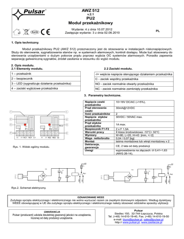 AWZ 512 v.2.1 PU2 Moduł przekaźnikowy Wydanie: 4 z dnia 10.07.2012 Zastępuje wydanie: 3 z dnia 02.06.2010 PL 1. Opis techniczny. Moduł przekaźnikowy PU2 (AWZ 512) przeznaczony jest do stosowania w instalacjach niskonapięciowych. Służy do sterowania, sygnalizowania stanów np. w systemach alarmowych, kontroli dostępu. Może być stosowany do sterowania urządzeniami o dużym poborze prądu poprzez wyjścia OC systemów alarmowych. Ponadto zapewnia separację galwaniczną sygnałów, źródeł zasilania w stosunku do wyjść modułu. 2. Opis modułu. 2.1 Elementy modułu. 2.2 Zaciski modułu. 1 – przekaźnik -I+ wejścia napięcia sterującego działaniem przekaźnika 2 – bezpiecznik C - zacisk wspólny przekaźnika 3 – LED (sygnalizuje działanie przekaźnika) NO - zacisk normalnie otwarty przekaźnika 4 – zaciski wyjściowe przekaźnika NC - zacisk normalnie zamknięty przekaźnika 3. Parametry techniczne. 1 1 2 2 3 L1 I1 L2 F1 PU-2 3 F2 I2 4 4 +/- -/+ NC1 NO1 C1 +/- -/+ NC2 NO2 C2 Rys. 1. Widok ogólny modułu. Napięcie cewki przekaźnika Prąd sterowania cewki Ilość przekaźników Napięcie styków przekaźnika Prąd styków przekaźnika Bezpiecznik F1-F2 Warunki pracy Wymiary Waga netto/brutto Montaż Deklaracje, gwarancja Uwagi 10÷16V DC/AC (-/+5%), 30mA@12VDC 2 30VDC / 50VAC max. 1A max. 2 x F 1,5A II klasa środowiskowa -10°C÷ 50°C W=80, L=20, H=43 [mm, +/-2] 0,04 / 0,07 [kg] taśma montażowa lub wkręt montażowy x 2 CE, 2 lata od daty produkcji wyprowadzenia na złączach: Ø 0,41÷1,63 (AWG 26-14), Rys.2. Schemat elektryczny. OZNAKOWANIE WEEE Zużytego sprzętu elektrycznego i elektronicznego nie wolno wyrzucać razem ze zwykłymi domowymi odpadami. Według dyrektywy WEEE obowiązującej w UE dla zużytego sprzętu elektrycznego i elektronicznego należy stosować oddzielne sposoby utylizacji. GWARANCJA Pulsar (producent) udziela dwuletniej gwarancji jakości na urządzenia, liczonej od daty produkcji urządzenia. Pulsar Siedlec 150, 32-744 Łapczyca, Polska Tel. (+48) 14-610-19-40, Fax. (+48) 14-610-19-50 e-mail: [email protected], [email protected] http:// www.pulsar.pl, www.zasilacze.pl