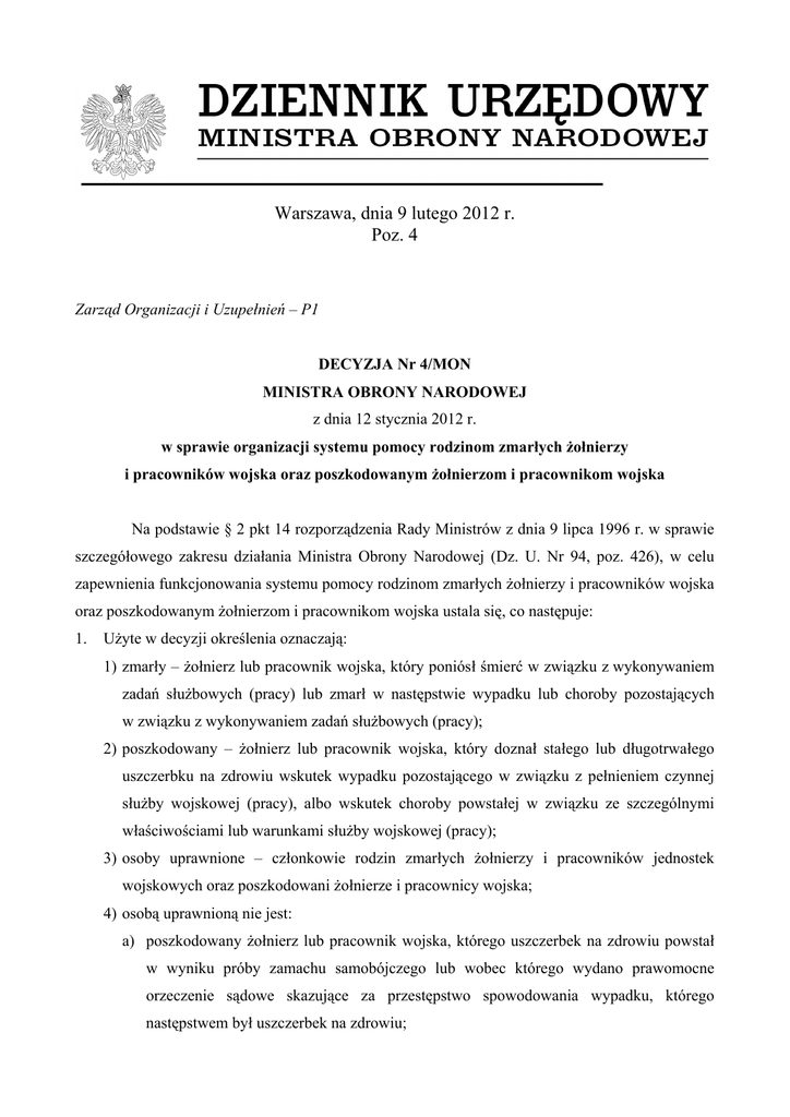 Warszawa, dnia 9 lutego 2012 r. Poz. 4 Zarząd Organizacji i Uzupełnień – P1 DECYZJA Nr 4/MON MINISTRA OBRONY NARODOWEJ z dnia 12 stycznia 2012 r. w sprawie organizacji systemu pomocy rodzinom zmarłych żołnierzy i pracowników wojska oraz poszkodowanym żołnierzom i pracownikom wojska Na podstawie § 2 pkt 14 rozporządzenia Rady Ministrów z dnia 9 lipca 1996 r. w sprawie szczegółowego zakresu działania Ministra Obrony Narodowej (Dz. U. Nr 94, poz. 426), w celu zapewnienia funkcjonowania systemu pomocy rodzinom zmarłych żołnierzy i pracowników wojska oraz poszkodowanym żołnierzom i pracownikom wojska ustala się, co następuje: 1. Użyte w decyzji określenia oznaczają: 1) zmarły – żołnierz lub pracownik wojska, który poniósł śmierć w związku z wykonywaniem zadań służbowych (pracy) lub zmarł w następstwie wypadku lub choroby pozostających w związku z wykonywaniem zadań służbowych (pracy); 2) poszkodowany – żołnierz lub pracownik wojska, który doznał stałego lub długotrwałego uszczerbku na zdrowiu wskutek wypadku pozostającego w związku z pełnieniem czynnej służby wojskowej (pracy), albo wskutek choroby powstałej w związku ze szczególnymi właściwościami lub warunkami służby wojskowej (pracy); 3) osoby uprawnione – członkowie rodzin zmarłych żołnierzy i pracowników jednostek wojskowych oraz poszkodowani żołnierze i pracownicy wojska; 4) osobą uprawnioną nie jest: a) poszkodowany żołnierz lub pracownik wojska, którego uszczerbek na zdrowiu powstał w wyniku próby zamachu samobójczego lub wobec którego wydano prawomocne orzeczenie sądowe skazujące za przestępstwo spowodowania wypadku, którego następstwem był uszczerbek na zdrowiu; b) członek rodziny zmarłego żołnierza lub pracownika wojska, którego śmierć była wynikiem zamachu samobójczego lub spowodowania przez zmarłego wypadku; 5) członkowie rodziny żołnierza (pracownika wojska) – małżonek, rodzice oraz dzieci pozostające na utrzymaniu, w tym dzieci własne, dzieci małżonka, dzieci przysposobione i dzieci przyjęte na wychowanie do czasu: a) ukończenia osiemnastu lat albo b) ukończenia nauki w szkole, jeżeli przekroczyły osiemnasty rok życia, nie dłużej jednak niż do osiągnięcia dwudziestu pięciu lat życia albo c) bez względu na wiek, jeżeli stały się całkowicie niezdolne do pracy oraz do samodzielnej egzystencji lub całkowicie niezdolne do pracy w okresie, o którym mowa w lit. a lub b, o ile nie zawarły związku małżeńskiego; 6) pomoc – informowanie o świadczeniach, wynikających z obowiązujących aktów prawnych przysługujących osobom uprawnionym oraz o zakresie i wysokości tych świadczeń, a także sposobie ich realizacji przez właściwe jednostki (komórki) organizacyjne resortu obrony narodowej; pielęgnowanie pamięci o zmarłym, zapraszanie na święta i uroczystości organizowane w jednostce (komórce) organizacyjnej resortu obrony narodowej oraz utrzymywanie kontaktów z osobami uprawnionymi, pomoc psychologiczna, wsparcie duszpasterskie, itp.; 7) koordynator w Ministerstwie Obrony Narodowej – żołnierz lub pracownik resortu obrony narodowej wyznaczony przez Sekretarza Stanu w Ministerstwie Obrony Narodowej, do koordynowania działań w ramach systemu pomocy rodzinom zmarłych żołnierzy i pracowników wojska oraz poszkodowanym żołnierzom i pracownikom wojska; 8) opiekun indywidualny – żołnierz lub pracownik wojska wyznaczony do udzielania pomocy osobom uprawnionym. 2. Sekretarz Stanu w Ministerstwie Obrony Narodowej: 1) nadzoruje realizację zadań w zakresie udzielania pomocy osobom uprawnionym; 2) współpracuje z Szefem Sztabu Generalnego Wojska Polskiego w zakresie organizacji i funkcjonowania systemu udzielania pomocy osobom uprawnionym; 3) wyznacza i określa zadania koordynatora w Ministerstwie Obrony Narodowej, opiekunów indywidualnych dla osób uprawnionych oraz zapewnia merytoryczne przygotowanie tych opiekunów; 4) prowadzi i na bieżąco aktualizuje centralną bazę danych osób uprawnionych do pomocy, stosownie do przepisów ustawy z dnia 29 sierpnia 1997 r. o ochronie danych osobowych 2 (Dz. U. z 2002 r. Nr 101, poz. 926, z późn. zm.1)), po uzyskaniu zgody tych osób do przetwarzania ich danych osobowych oraz udostępnia w razie potrzeby informacje w niej zawarte opiekunom indywidualnym; 5) zapewnia realizację opieki psychologicznej dla osób uprawnionych i przepływ informacji w ramach funkcjonowania Wojskowego Telefonu Zaufania oraz serwisu internetowego (www.wojsko-polskie.pl). 3. Szef Sztabu Generalnego Wojska Polskiego: 1) ustali szczegółowe zadania realizowane przez dowódców rodzajów Sił Zbrojnych Rzeczypospolitej Polskiej, Dowódcę Operacyjnego Sił Zbrojnych, Dowódcę Garnizonu Warszawa, Szefa Inspektoratu Wsparcia Sił Zbrojnych (w tym szefów wojewódzkich sztabów wojskowych), Szefa Inspektoratu Wojskowej Służby Zdrowia i Komendanta Głównego Żandarmerii podporządkowanych Wojskowej, Szefowi Sztabu a także Generalnego dla komórek Wojska organizacyjnych Polskiego, związane z organizacją i funkcjonowaniem systemu pomocy osobom uprawnionym, w tym określi jednostki wojskowe, w których wyznaczeni zostaną opiekunowie indywidualni osób uprawnionych; 2) dokona niezbędnych zmian organizacyjnych i etatowych umożliwiających wprowadzenie dodatkowych stanowisk dla pracowników jednostek organizacyjnych resortu obrony narodowej, w celu realizacji zadań z zakresu udzielania pomocy osobom uprawnionym; 3) w miarę potrzeb i możliwości stworzy warunki do dalszego pełnienia czynnej służby wojskowej przez żołnierzy poszkodowanych; 4) uruchomi i zapewni funkcjonowanie telefonu informacyjnego dla osób uprawnionych w wojewódzkich sztabach wojskowych oraz w wybranych jednostkach wojskowych; 5) współuczestniczy w tworzeniu bazy danych osób uprawnionych przez przekazanie Sekretarzowi Stanu w Ministerstwie Obrony Narodowej zgód tych osób do przet