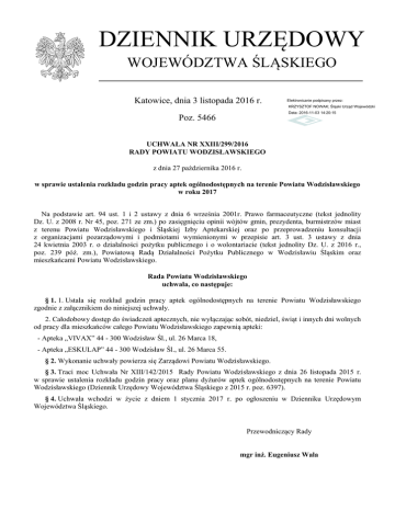 DZIENNIK URZĘDOWY WOJEWÓDZTWA ŚLĄSKIEGO Katowice, dnia 3 listopada 2016 r. Elektronicznie podpisany przez: KRZYSZTOF NOWAK; Śląski Urząd Wojewódzki Data: 2016-11-03 14:20:15 Poz. 5466 UCHWAŁA NR XXIII/299/2016 RADY POWIATU WODZISŁAWSKIEGO z dnia 27 października 2016 r. w sprawie ustalenia rozkładu godzin pracy aptek ogólnodostępnych na terenie Powiatu Wodzisławskiego w roku 2017 Na podstawie art. 94 ust. 1 i 2 ustawy z dnia 6 września 2001r. Prawo farmaceutyczne (tekst jednolity Dz. U. z 2008 r. Nr 45, poz. 271 ze zm.) po zasięgnięciu opinii wójtów gmin, prezydenta, burmistrzów miast z terenu Powiatu Wodzisławskiego i Śląskiej Izby Aptekarskiej oraz po przeprowadzeniu konsultacji z organizacjami pozarządowymi i podmiotami wymienionymi w przepisie art. 3 ust. 3 ustawy z dnia 24 kwietnia 2003 r. o działalności pożytku publicznego i o wolontariacie (tekst jednolity Dz. U. z 2016 r., poz. 239 póź. zm.), Powiatową Radą Działalności Pożytku Publicznego w Wodzisławiu Śląskim oraz mieszkańcami Powiatu Wodzisławskiego. Rada Powiatu Wodzisławskiego uchwala, co następuje: § 1. 1. Ustala się rozkład godzin pracy aptek ogólnodostępnych na terenie Powiatu Wodzisławskiego zgodnie z załącznikiem do niniejszej uchwały. 2. Całodobowy dostęp do świadczeń aptecznych, nie wyłączając sobót, niedziel, świąt i innych dni wolnych od pracy dla mieszkańców całego Powiatu Wodzisławskiego zapewnią apteki: - Apteka „VIVAX” 44 - 300 Wodzisław Śl., ul. 26 Marca 18, - Apteka „ESKULAP” 44 - 300 Wodzisław Śl., ul. 26 Marca 55. § 2. Wykonanie uchwały powierza się Zarządowi Powiatu Wodzisławskiego. § 3. Traci moc Uchwała Nr XIII/142/2015 Rady Powiatu Wodzisławskiego z dnia 26 listopada 2015 r. w sprawie ustalenia rozkładu godzin pracy oraz planu dyżurów aptek ogólnodostępnych na terenie Powiatu Wodzisławskiego (Dziennik Urzędowy Województwa Śląskiego z 2015 r. poz. 6397). § 4. Uchwała wchodzi w życie z dniem 1 stycznia 2017 r. po ogłoszeniu w Dzienniku Urzędowym Województwa Śląskiego. Przewodniczący Rady mgr inż. Eugeniusz Wala Dziennik Urzędowy Województwa Śląskiego –2– Poz. 5466 Załącznik do Uchwały Nr XXIII/299/2016 Rady Powiatu Wodzisławskiego z dnia 27 października 2016 r. ROZKŁAD PRACY APTEK OGÓLNODOSTĘPNYCH NA TERENIE POWIATU WODZISŁAWSKIEGO Nazwa apteki 1 2 3 4 5 6 7 8 9 10 11 12 13 Apteka „ESKULAP” 44-300 Wodzisław Śl. ul. Księżnej Konstancji 4 tel. 32 455-45-21 Apteka „ESKULAP” 44-300 Wodzisław Śl. Osiedle XXX Lecia PRL 62a tel. 32 456-34-33 Apteka „ESKULAP” 44-300 Wodzisław Śl. ul. 26 Marca 55 tel. 32 455-64-01 Apteka „ESKULAP” 44-300 Wodzisław Śl. ul. 26 Marca 164 tel. 32 455-55-99 Apteka „VIVAX” 44-300 Wodzisław Śl. ul. 26 Marca 18 tel. 32 455-25-52 Apteka „VIVAX II” 44-300 Wodzisław Śl. ul. ks. płk. Wilhelma Kubsza 2a tel. 32 455-11-60 Apteka „VIVAX III” 44-300 Wodzisław Śl. ul. ks. płk. Wilhelma Kubsza 24b tel. 32 455-66-96 Apteka VIVAX 44-300 Wodzisław Śl. ul. Jana Pawła II 8a tel. 32 453-20-64 Apteka „VIVAX VI” 44-304 Wodzisław Śl. ul. Armii Ludowej 3A tel. 32 494-42-01 Apteka „Pod Jaskółką” 44-313 Wodzisław Śl. ul. Bolesława Chrobrego 119 tel. 32 456-47-89 Apteka Ogólnodostępna „FARMACEUTÓW” 44-300 Wodzisław Śl. ul. ks. płk. Wilhelma Kubsza 32 tel. 32 455-03-05 Apteka Prywatna 44-304 Wodzisław Śl. ul. Armii Ludowej 1 tel. 32 456-94-13 Apteka „Dr Optima” 44-300 Wodzisław Śl. ul. Radlińska 61 tel. 32 440-91-00 Poniedziałek - piątek 800 -1800 800 -1900 Rozkład godzin pracy aptek sobota niedziela i święta 900 -1300 nieczynne 900 -1300 nieczynne całodobowo 700 -1800 nieczynne nieczynne całodobowo 800 -1800 800 -1300 nieczynne 800 -1800 800 -1300 nieczynne 800 -2000 800 -1300 nieczynne 800 -2000 800 -1400 nieczynne 800 -1600 nieczynne nieczynne 800 -2000 800 -2000 niedziela 900 -1500 800 -1600 nieczynne nieczynne 800 -2000 800 -1500 nieczynne Dziennik Urzędowy Województwa Śląskiego 14 15 16 17 18 19 20 21 22 23 24 25 26 27 28 29 30 Apteka „MEDHOUSE” ul. Radlińska 68 44-300 Wodzisław Śląski tel. 32 459-10-20 Apteka Prywatna „FARMEX” 44-300 Wodzisław Śl. ul. Targowa 12 tel. 32 453-06-22 Apteka z + 44-300 Wodzisław Śl. ul. Wincentego Witosa 28 tel. 32 453-22-22 „Apteka na Pszowskiej” 44-373 Wodzisław Śl. ul. Pszowska 289 tel. 32 723-23-42 EURO-APTEKA 44-300 Wodzisław Śl. ul. Targowa 19 tel. 517-446-650, 32 455-91-29 Apteka „Zdrowit” 44-300 Wodzisław Śl. ul. Targowa 12c tel. 32 440-24-14 Apteka „Zdrowit” 44-300 Wodzisław Śl. ul. 26 Marca 94 tel. 32 455-62-55 Apteka „Pod Lwem” ul. Kubsza 8 44-300 Wodzisław Śl. tel. 665220022 Apteka Prywatna „GEMINI” 44-280 Rydułtowy ul. Strzelców Bytomskich 11 tel. 32 457-55-68 Apteka „Orłowiec” 44-280 Rydułtowy Osiedle Orłowiec 20a tel. 32 457-70-84 Apteka „Szczęść Boże” 44-280 Rydułtowy ul. gen. Józefa Bema 8 tel. 32 457-83-40 Apteka 44-280 Rydułtowy ul. Plebiscytowa 47 tel. 32 457-69-98 Apteka „Pod Jaskółką” 44-280 Rydułtowy ul. Plebiscytowa 48 tel. 32 457-82-86 Apteka „VIVAX IV” 44-280 Rydułtowy ul. Kazimierza Przerwy-Tetmajera 150 tel. 32 457-75-99 Apteka „Na Bema” 44-280 Rydułtowy ul. gen. Józefa Bema 52 tel. 32 418-10-17 Apteka „Pod Lwem” 44-280 Rydułtowy ul. Raciborska 144 tel. 32 457-69-97 Apteka „Pod Jaskółką” 44-370 Pszów ul. Władysława Andersa 22 –3– Poz. 5466 800 -2000 800 -1400 nieczynne pon. 700 -1900 wt – śr. 800 -1900 czw. 700 -1900 pt. 800 -1900 900 -2100 800 -1400 nieczynne 900 -2100 niedziela 900 -1900 830 -1800 830 -1300 nieczynne 900 -2100 900 -2100 niedziela 1000 -2000 800 -2000 800 -1400 nieczynne 800 -2000 800 -1400 nieczynne 800 -2000 800 -1400 nieczynne 800 -1800 nieczynne nieczynne 800 -2000 800 -1300 nieczynne 800 -2000 800 -1400 nieczynne 800 -2400 800 -2400 niedziela 800 -2400 800 -2100 800 -1700 nieczynne 800 -1900 nieczynne nieczynn