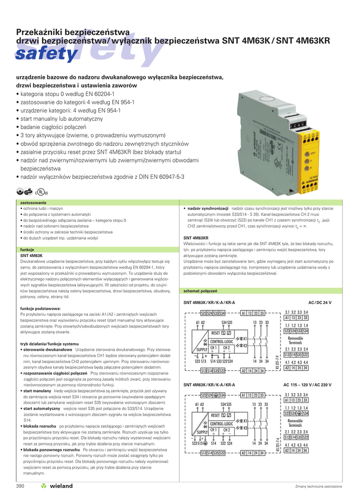 Przekaźniki bezpieczeństwa drzwi bezpieczeństwa/ wyłącznik bezpieczeństwa SNT 4M63K / SNT 4M63KR safety safety urządzenie bazowe do nadzoru dwukanałowego wyłącznika bezpieczeństwa, drzwi bezpieczeństwa i ustawienia zaworów • kategoria stopu 0 według EN 60204-1 • zastosowanie do kategorii 4 według EN 954-1 • urządzenie kategorii: 4 według EN 954-1 • start manualny lub automatyczny • badanie ciągłości połączeń • 3 tory aktywujące (zwierne, o prowadzeniu wymuszonym) • obwód sprzężenia zwrotnego do nadzoru zewnętrznych styczników • zasialnie przycisku reset przez SNT 4M63KR (bez blokady startu) • nadzór nad zwiernymi/rozwiernymi lub zwiernymi/zwiernymi obwodami bezpieczeństwa • nadzór wyłączników bezpieczeństwa zgodnie z DIN EN 60947-5-3 bE zastosowanie • ochrona ludzi i maszyn • do połączenia z systemami automatyki • do bezpośredniego odłączenia zasilania – kategoria stopu 0 • nadzór nad osłonami bezpieczeństwa • środki ochrony w zakresie techniki bezpieczeństwa • do dużych urządzeń (np. uzdatniania wody) funkcje SNT 4M63K Dwukanałowe urządzenie bezpieczeństwa, przy każdym cyklu włącz/wyłącz testuje się samo, do zastosowania z wyłącznikiem bezpieczeństwa według EN 60204-1, który jest wyposażony w przekaźniki o prowadzeniu wymuszonym. To urządzenie służy do elektrycznego nadzoru połączonych elementów wyłączających i generowania wyjściowych sygnałów bezpieczeństwa (aktywujących). W zależności od projektu, do czujników bezpieczeństwa należą osłony bezpieczeństwa, drzwi bezpieczeństwa, obudowy, pokrywy, osłony, ekrany itd. • nadzór synchronizacji nadzór czasu synchronizacji jest możliwy tylko przy starcie automatycznym (mostek S33/S14 - S 35). Kanał bezpieczeństwa CH 2 musi zamknąć (S24) lub otworzyć (S22) po kanale CH1 z czasem synchronizacji tS Jeśli CH2 zamknie/otworzy przed CH1, czas synchronizacji wynosi tS = ∞. SNT 4M63KR Właściwości i funkcje są takie same jak dla SNT 4M63K tyle, że bez blokady rozruchu, tzn. po przyłożeniu napięcia zasilającego i zamknięciu wejść bezpieczeństwa, tory aktywujące zostaną zamknięte. Urządzenie może być zainstalowane tam, gdzie wymagany jest start automatyczny po przyłożeniu napięcia zasilającego (np. kompresory lub urządzenia uzdatniania wody z podzielonymi obwodami wyłącznika bezpieczeństwa). schemat połączeń SNT 4M63K / KR / K-A / KR-A AC / DC 24 V SNT 4M63K / KR / K-A / KR-A AC 115 – 120 V / AC 230 V funkcje podstawowe: Po przyłożeniu napięcia zasilającego na zaciski A1 / A2 i zamkniętych wejściach bezpieczenstwa oraz wyzwoleniu przycisku reset (start manualny) tory aktywujące zostaną zamknięte. Przy otwartych/ odwzbudzonych wejściach bezpieczeństwach tory aktywujące zostaną otwarte. tryb działania/ funkcje systemu • sterowanie dwukanałowe Urządzenie sterowania dwukanałowego. Przy sterowaniu równoczesnym kanał bezpieczeństwa CH1 będzie sterowany potencjałem dodatnim, kanał bezpieczeństwa CH2 potencjałem ujemnym. Przy sterowaniu nierównoczesnym obydwa kanały bezpieczeństwa będą załączane potencjałem dodatnim. • rozpoznawanie ciągłości połączeń Przy sterowaniu równoczesnym rozpoznanie ciągłości połączeń jest osiągnięta za pomocą zasady krótkich zwarć, przy sterowaniu nierównoczesnym za pomocą różnorodności funkcji. • start manulany kiedy wejścia bezpieczeństwa są zamknięte, przycisk jest używany do zamknięcia wejścia reset S34 i otwarcia go ponownie (wyzwalanie opadającym zboczem) lub zamykane wejściem reset S35 (wyzwalanie wznoszącym zboczem). • start automatyczny wejście reset S35 jest połączone do S33/S14. Urządzenie zostanie wystartowane z wznoszącym zboczem sygnału na wejście bezpieczeństwa S14. • blokada rozruchu po przyłożeniu napięcia zasilającego i zamkniętych wejściach bezpieczeństwa tory aktywujące nie zostaną zamknięte. Rozruch uzyskuje się tylko po przyciśnięciu przycisku reset. Dla blokady rozruchu należy wysterować wejściami reset za pomocą przycisku, jak przy trybie działania przy starcie manualnym. • blokada ponownego rozruchu Po otwarciu i zamknięciu wejść bezpieczeństwa nie nastąpi ponowny rozruch. Ponowny rozruch może zostać osiągnięty tylko po przyciśnięciu przycisku reset. Dla blokady ponownego rozruchu należy wysterować wejściami reset za pomocą przycisku, jak przy trybie działania przy starcie manualnym. 390 Zmiany techniczne zastrzeżone Przekaźniki bezpieczeństwa drzwi bezpieczeństwa/ wyłącznik bezpieczeństwa SNT 4M63K / SNT 4M63KR safety wykres funkcji SNT 4M63K i SNT 4M63KR start automatyczny, nadzór czasu synchronizacji, sterowanie równoczesne (instalacja 3) A1/A2 S14 S22 S35 K1 K2 13/14, 23/24, 33/34 SNT 4M63K i SNT 4M63KR start automatyczny, nadzór czasu synchronizacji, sterowanie nierównoczesne (instalacja 1) A1/A2 S14 S22 S35 K1 K2 13/14, 23/24, 33/34 wytyczne odpowiednie użycie Urządzenie jest przekaźnikiem bezpieczeństwa. Jest częścią systemów bezpieczeństwa przeznaczonych do ochrony ludzi, materiałów i maszyn. • kategoria bezpieczeństwa według EN 954-1 zależy od zewnętrznego okablowania, wyboru czujników i ich rozmieszczenia w systemie. • wskazany czas musi być badany podczas pracy urządzenia, inaczej urządzenie nie mogłoby się zamknąć. Blokada może być wyzwolona poprzez odpowiednie otwarcie wejść bezpieczeństwa. • w celu powielenia dostępnych torów aktywujących można zastosować urządzenia rozszerzeń typu SNE lub zewnętrzne styczniki z przekaźnikami o prowadzeniu wymuszonym. • urządzenie i styki muszą być zabezpieczone do maksymalnie 6 A bezpiecznikiem klasy gG lub zabezpieczeniem o charakterystyce B lub C. • urządzenia są wyposażone w ochroną przeciążeniową (przy zwarciu). Po usunięciu przyczyny awarii urządzenie jest gotowe do pracy po około 3 s. • wyjście steruj