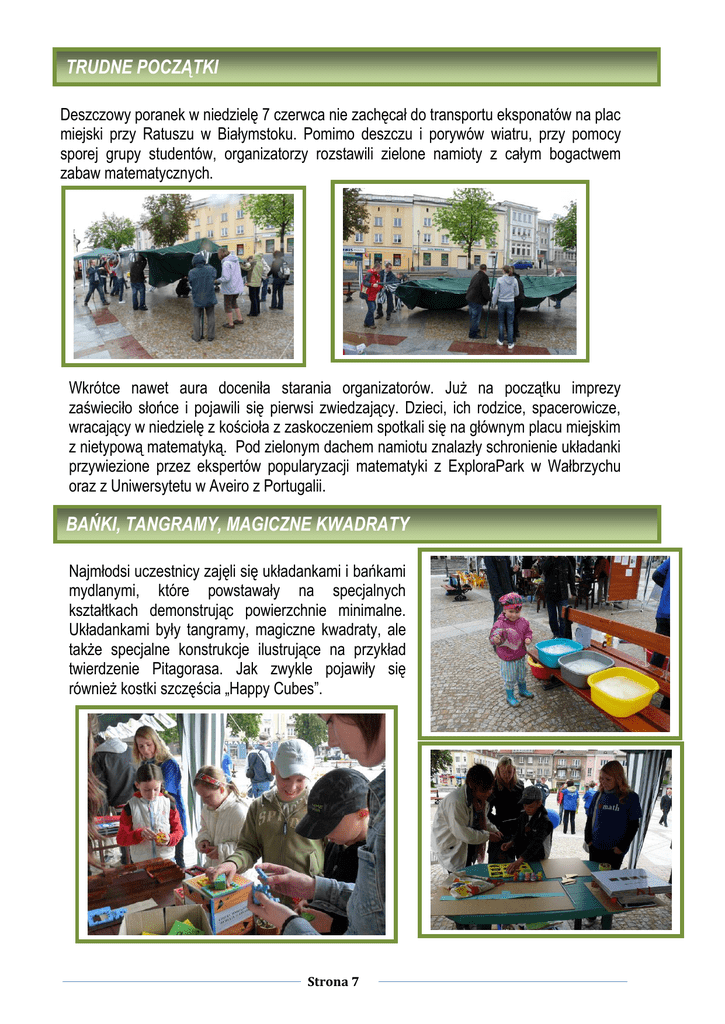 TRUDNE POCZĄTKI Deszczowy poranek w niedzielę 7 czerwca nie zachęcał do transportu eksponatów na plac miejski przy Ratuszu w Białymstoku. Pomimo deszczu i porywów wiatru, przy pomocy sporej grupy studentów, organizatorzy rozstawili zielone namioty z całym bogactwem zabaw matematycznych. Wkrótce nawet aura doceniła starania organizatorów. Już na początku imprezy zaświeciło słońce i pojawili się pierwsi zwiedzający. Dzieci, ich rodzice, spacerowicze, wracający w niedzielę z kościoła z zaskoczeniem spotkali się na głównym placu miejskim z nietypową matematyką. Pod zielonym dachem namiotu znalazły schronienie układanki przywiezione przez ekspertów popularyzacji matematyki z ExploraPark w Wałbrzychu oraz z Uniwersytetu w Aveiro z Portugalii. BAŃKI, TANGRAMY, MAGICZNE KWADRATY Najmłodsi uczestnicy zajęli się układankami i bańkami mydlanymi, które powstawały na specjalnych kształtkach demonstrując powierzchnie minimalne. Układankami były tangramy, magiczne kwadraty, ale także specjalne konstrukcje ilustrujące na przykład twierdzenie Pitagorasa. Jak zwykle pojawiły się również kostki szczęścia „Happy Cubes”. Strona 7