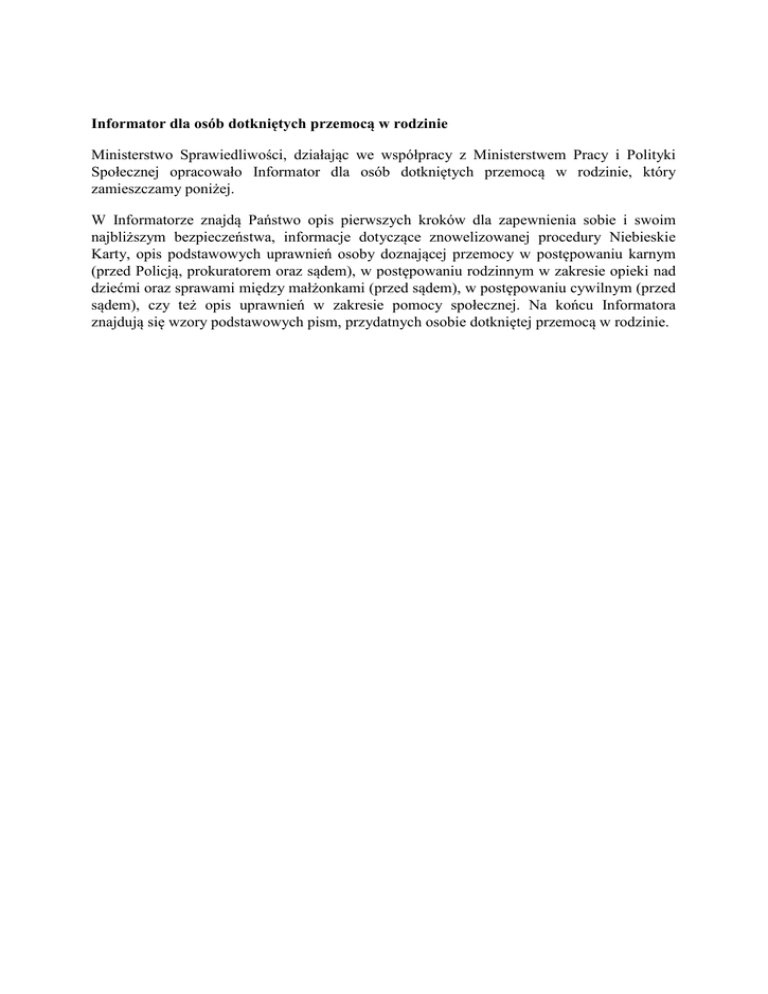 Informator dla osób dotkniętych przemocą w rodzinie Ministerstwo Sprawiedliwości, działając we współpracy z Ministerstwem Pracy i Polityki Społecznej opracowało Informator dla osób dotkniętych przemocą w rodzinie, który zamieszczamy poniżej. W Informatorze znajdą Państwo opis pierwszych kroków dla zapewnienia sobie i swoim najbliższym bezpieczeństwa, informacje dotyczące znowelizowanej procedury Niebieskie Karty, opis podstawowych uprawnień osoby doznającej przemocy w postępowaniu karnym (przed Policją, prokuratorem oraz sądem), w postępowaniu rodzinnym w zakresie opieki nad dziećmi oraz sprawami między małżonkami (przed sądem), w postępowaniu cywilnym (przed sądem), czy też opis uprawnień w zakresie pomocy społecznej. Na końcu Informatora znajdują się wzory podstawowych pism, przydatnych osobie dotkniętej przemocą w rodzinie.