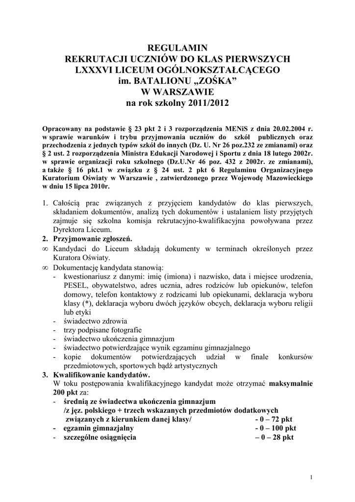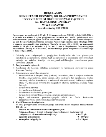 REGULAMIN REKRUTACJI UCZNIÓW DO KLAS PIERWSZYCH LXXXVI LICEUM OGÓLNOKSZTAŁCĄCEGO im. BATALIONU „ZOŚKA” W WARSZAWIE na rok szkolny 2011/2012 Opracowany na podstawie § 23 pkt 2 i 3 rozporządzenia MENiS z dnia 20.02.2004 r. w sprawie warunków i trybu przyjmowania uczniów do szkół publicznych oraz przechodzenia z jednych typów szkół do innych (Dz. U. Nr 26 poz.232 ze zmianami) oraz § 2 ust. 2 rozporządzenia Ministra Edukacji Narodowej i Sportu z dnia 18 lutego 2002r. w sprawie organizacji roku szkolnego (Dz.U.Nr 46 poz. 432 z 2002r. ze zmianami), a także § 16 pkt.1 w związku z § 24 ust. 2 pkt 6 Regulaminu Organizacyjnego Kuratorium Oświaty w Warszawie , zatwierdzonego przez Wojewodę Mazowieckiego w dniu 15 lipca 2010r. 1. Całością prac związanych z przyjęciem kandydatów do klas pierwszych, składaniem dokumentów, analizą tych dokumentów i ustalaniem listy przyjętych zajmuje się szkolna komisja rekrutacyjno-kwalifikacyjna powoływana przez Dyrektora Liceum. 2. Przyjmowanie zgłoszeń. • Kandydaci do Liceum składają dokumenty w terminach określonych przez Kuratora Oświaty. • Dokumentację kandydata stanowią: - kwestionariusz z danymi: imię (imiona) i nazwisko, data i miejsce urodzenia, PESEL, obywatelstwo, adres ucznia, adres rodziców lub opiekunów, telefon domowy, telefon kontaktowy z rodzicami lub opiekunami, deklaracja wyboru klasy (*), deklaracja wyboru dwóch języków obcych, deklaracja wyboru religii lub etyki - świadectwo zdrowia - trzy podpisane fotografie - świadectwo ukończenia gimnazjum - świadectwo potwierdzające wynik egzaminu gimnazjalnego - kopie dokumentów potwierdzających udział w finale konkursów przedmiotowych, sportowych bądź artystycznych 3. Kwalifikowanie kandydatów. W toku postępowania kwalifikacyjnego kandydat może otrzymać maksymalnie 200 pkt za: - średnią ze świadectwa ukończenia gimnazjum /z jęz. polskiego + trzech wskazanych przedmiotów dodatkowych związanych z kierunkiem danej klasy/ - 0 – 72 pkt - egzamin gimnazjalny - 0 – 100 pkt - szczególne osiągnięcia – 0 – 28 pkt 1 • Laureaci konkursów o zasięgu wojewódzkim i ponadwojewódzkim przyjmowani • • 4. • • będą niezależnie od w/w kryteriów W przypadku uzyskania równorzędnych wyników w postępowaniu kwalifikacyjnym pierwszeństwo w przyjęciu do szkoły mają osoby wymienione w rozporządzeniu MENiS § 13 p.8. Kandydaci kończący szkołę niższego szczebla za granicą przyjmowani będą zgodnie z zasadami określonymi w rozporządzeniu MENiS § 19 ust. 1 pkt 3. Szczegółowe zasady punktacji. Za oceny na świadectwie z przedmiotów przyznawane będą punkty według zasady: - celujący - 18 pkt - bardzo dobry - 14 pkt - dobry - 10 pkt - dostateczny - 6 pkt - dopuszczający - 2 pkt przedmioty punktowane przy rekrutacji do poszczególnych klas: - klasa z rozszerzeniem j. polskiego i historii j. polski , jęz. obcy obowiązkowy w gimnazjum, matematyka, historia obowiązkowo j.łaciński dwa języki obce do wyboru z listy (j. angielski, j. niemiecki, j. francuski, j. hiszpański, j. rosyjski, j. słowacki), - klasa z rozszerzeniem matematyki i fizyki j. polski, jęz. obcy obowiązkowy w gimnazjum , matematyka , fizyka dwa języki obce do wyboru z listy (j. angielski, j. niemiecki, j. francuski, j. hiszpański, j. rosyjski, j. słowacki), - klasa z rozszerzeniem języka polskiego i wiedzy o społeczeństwie j. polski, jęz. obcy obowiązkowy w gimnazjum, wiedza o społeczeństwie, matematyka dwa języki obce do wyboru z listy (j. angielski, j. niemiecki, j. francuski, j. hiszpański, j. rosyjski, j. słowacki), - klasa z rozszerzeniem biologii i chemii j. polski, jęz. obcy obowiązkowy w gimnazjum, matematyka, biologia obowiązkowo j. łaciński, dwa języki obce do wyboru z listy (j. angielski, j. niemiecki, j. francuski, j. hiszpański, j. rosyjski, j. słowacki), - klasa z rozszerzeniem j. polskiego, historii j. polski, jęz. obcy obowiązkowy w gimnazjum, matematyka, historia obowiązkowo j. łaciński, dwa języki obce do wyboru z listy (j. angielski, j. niemiecki, j. francuski, j. hiszpański, j. rosyjski, j. słowacki), 2 - klasa z rozszerzeniem j. angielskiego i geografii j. polski, jęz. angielski, matematyka, geografia obowiązkowy - j. angielski, drugi język obcy do wyboru z listy (j. niemiecki, j. francuski, j. hiszpański, j. rosyjski, j. słowacki), Komisja Rekrutacyjno – Kwalifikacyjna przyzna punkty za szczególne osiągnięcia: - - - - za świadectwo ukończenia gimnazjum z wyróżnieniem - 2 pkt za udział w co najmniej jednym konkursie organizowanym przez Kuratora Oświaty na szczeblu wojewódzkim lub za udział w II etapie olimpiady przedmiotowej - 14 pkt za osiągnięcia sportowe lub artystyczne co najmniej na szczeblu wojewódzkim - 4 pkt za osiągnięcia sportowe lub artystyczne co najmniej na szczeblu powiatowym - 2 pkt (maksymalna liczba punktów za osiągnięcia sportowe lub artystyczne na szczeblu powiatowym lub wojewódzkim wynosi 4 pkt) 2 pkt za inne osiągnięcia, odnotowane na świadectwie ukończenia gimnazjum w tym: a) uzyskanie wysokiego miejsca w zawodach wiedzy, artystycznych i sportowych organizowanych przez inne podmioty działające na terenie szkół b) osiągnięcia w aktywności na rzecz innych ludzi, zwłaszcza wolontariatu lub środowiska szkolnego do 6 pkt za średnią arytmetyczną zaokrągloną do trzech miejsc po przecinku uzyskaną z obowiązkowych zajęć edukacyjnych i dodatkowych zajęć edukacyjnych wymienionych na świadectwie oraz religii lub etyki. Przyjmuje się następujące wartości punktowe ocen: - celujący - 6 pkt - bardzo dobry - 5 pkt - dobry - 4 pkt - dostateczny - 3 pkt - dopuszczający - 2 pkt 5. Wyniki rekrutacji. • Suma punktów uzyskanych przez kandydata decyduje o jego miejscu na liście • Komisja Rekrutacyjno – Kwalifikacyjna decydując o umieszczeniu ucznia na liście zwraca uwagę na ocenę zachowania 3 • Ostateczną listę przyjętyc