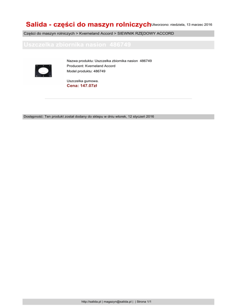 Salida - części do maszyn rolniczychUtworzono: niedziela, 13 marzec 2016 Części do maszyn rolniczych > Kverneland Accord > SIEWNIK RZĘDOWY ACCORD Uszczelka zbiornika nasion 486749 Nazwa produktu: Uszczelka zbiornika nasion 486749 Producent: Kverneland Accord Model produktu: 486749 Uszczelka gumowa. Cena: 147.07zł Dostępność: Ten produkt został dodany do sklepu w dniu wtorek, 12 styczeń 2016 http://salida.pl | [email protected] | | Strona 1/1