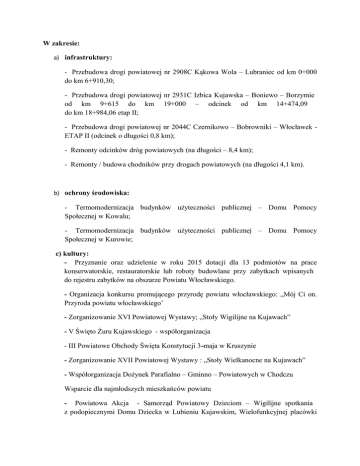 W zakresie: a) infrastruktury: - Przebudowa drogi powiatowej nr 2908C Kąkowa Wola – Lubraniec od km 0+000 do km 6+910,30; - Przebudowa drogi powiatowej nr 2931C Izbica Kujawska – Boniewo – Borzymie od km 9+615 do km 19+000 – odcinek od km 14+474,09 do km 18+984,06 etap II; - Przebudowa drogi powiatowej nr 2044C Czernikowo – Bobrowniki – Włocławek ETAP II (odcinek o długości 0,8 km); - Remonty odcinków dróg powiatowych (na długości – 8,4 km); - Remonty / budowa chodników przy drogach powiatowych (na długości 4,1 km). b) ochrony środowiska: - Termomodernizacja budynków użyteczności publicznej – Domu Pomocy Społecznej w Kowalu; - Termomodernizacja budynków użyteczności publicznej – Domu Pomocy Społecznej w Kurowie; c) kultury: - Przyznanie oraz udzielenie w roku 2015 dotacji dla 13 podmiotów na prace konserwatorskie, restauratorskie lub roboty budowlane przy zabytkach wpisanych do rejestru zabytków na obszarze Powiatu Włocławskiego. - Organizacja konkursu promującego przyrodę powiatu włocławskiego: „Mój Ci on. Przyroda powiatu włocławskiego’ - Zorganizowanie XVI Powiatowej Wystawy; „Stoły Wigilijne na Kujawach” - V Święto Żuru Kujawskiego - współorganizacja - III Powiatowe Obchody Święta Konstytucji 3-maja w Kruszynie - Zorganizowanie XVII Powiatowej Wystawy : „Stoły Wielkanocne na Kujawach” - Współorganizacja Dożynek Parafialno – Gminno – Powiatowych w Chodczu Wsparcie dla najmłodszych mieszkańców powiatu - Powiatowa Akcja - Samorząd Powiatowy Dzieciom – Wigilijne spotkania z podopiecznymi Domu Dziecka w Lubieniu Kujawskim, Wielofunkcyjnej placówki w Brzeziu, rodzinami zastępczymi, podopiecznymi Ośrodka Rehabilitacji Dzieci Niepełnosprawnych przy ul: Radosnej we Włocławku - współorganizacja III Powiatowego Festynu Rodzinnego: „ Mamy – Dzieciom, Dzieci – Mamom” - V Włocławski przegląd spektakli profilaktycznych pod hasłem: „Nałogi są zwykle adwokatem głupstw, które rozum jako prokurator oskarża”-Powiatowe Obchody Dnia Dziecka- współorganizacja - XIV Powiatowy Rajd Rowerowy – „Rowerem do Europy” - Powiatowe Obchody Dnia Dziecka – Samorząd Powiatowy Dzieciom – Lubień Kujawski - Współorganizacja Festynu Rodzinnego w ramach Obchodów Wojewódzkiego Święta Policji Wsparcie osób niepełnosprawnych i seniorów - Spotkania Świąteczno – Noworoczne z mieszkańcami DPS - XVI Prezentacja Twórczości Artystycznej Osób Niepełnosprawnych „Mój świat, Moje życie”- Spotkanie integracyjne Starosty z członkami Polskiego Związku Niewidomych Okręgu Kujawsko – Pomorskiego Koła Powiatowego we Włocławku - Obchody Międzynarodowego Dnia Niewidomych – Święto Białej Laski Stan finansów mienia komunalnego Listopad 2014 – 81.880.894,00 Zadłużenie - 0zł Październik 2015 – 82.908.597,00 Zadłużenie - 0 zł Opracował: Naczelnik Wydziału Edukacji i Spraw społecznych – Tomasz Olach