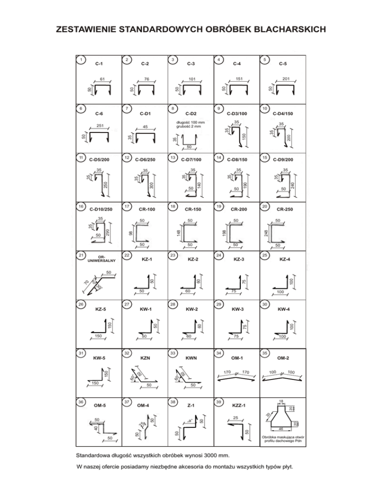 ZESTAWIENIE STANDARDOWYCH OBRÓBEK BLACHARSKICH C-3 76 101 50 C-5 151 201 8 9 10 C-D1 C-D2 C-D3/100 45 długość 100 mm grubość 2 mm 35 251 C-D4/150 35 35 200 150 35 35 50 C-6 35 50 7 6 C-4 50 61 5 4 3 C-2 50 2 C-1 50 1 50 35 C-D7/100 300 17 C-D8/150 CR-100 35 CR-150 35 50 19 CR-200 50 50 20 CR-250 50 50 50 21 ORUNIWERSALNY 50 22 248 198 148 50 98 290 35 50 C-D9/200 35 50 18 15 35 35 35 250 C-D10/250 14 35 35 35 16 13 240 C-D6/250 35 12 190 C-D5/200 140 11 50 23 50 24 KZ-1 25 KZ-2 KZ-3 KZ-4 100 75 60 27 28 KW-1 150 60 32 170 17 0 50 OM-2 100 100 50 50 18 30 20 KZZ-1 20 25 50 50 „a” 25 50 39 Z-1 50 38 OM-4 50 40 35 OM-1 60° 60° 50 50 100 34 KWN 50 150 150 37 KW-4 75 33 KZN OM-5 30 KW-3 60 50 KW-5 100 29 KW-2 50 150 KZ-5 31 75 100 50 75 ° 26 36 60 ° 30 50 60 70 50 46 Obróbka maskująca otwór profilu dachowego Pdn Standardowa długość wszystkich obróbek wynosi 3000 mm. W naszej ofercie posiadamy niezbędne akcesoria do montażu wszystkich typów płyt. ZESTAWIENIE STANDARDOWYCH OBRÓBEK BLACHARSKICH OM-7/PDN100 37 60 Jest to obróbka uniwersalna pasująca na prawą i lewą stronę płyty dachowej nowego typu. 125 130 10 2 30 Na płytę dachową zakończoną równo ze szczytem ściany. Przy innych grubościach płyty, wysokość boczna obróbki ulegnie zmianie. Zmiana ta polega na dodaniu 50 mm do każdej grubości płyty. Np. PDN100 = 150 mm PDN150 = 200 mm PDN200 = 250 mm 150 30 1250 0 20 10 1680 OM-3 100 20 Ta obróbka służy do zamaskowania łączeń dachów od wewnętrznej strony obiektu, powstałych na skutek łączenia dwóch długości dachów. 2 10 30 OM-6 25 30 50 1250 1250 10 2,5 10 Jest to obróbka do mocowania kalenicy w dachach nowego typu na stronie dachów. 50 OM-8/PND/100 37 60 30 1250 1250 30 130 2 10 10 80 Jest to obróbka na wystający dach poza ścianę szczytową. Przy innych grubościach płyty wysokość boczna obróbki ulegnie zmianie. Zmiana ta polega na dodaniu 30 mm do każdej grubości płyty. Np. PDN100 = 130 mm PDN150 = 180 mm PDN200 - 230 mm