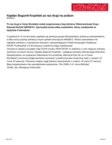 Kapitan Bogumił Krupiński po raz drugi na podium 2013-06-19 Po raz drugi w Camp Bondsteel został zorganizowany bieg żołnierzy Wielonarodowej Grupy Bojowej Wschód (MNGB-E). Zgromadził ponad setkę uczestników, którzy rywalizowali na dystansie 5 kilometrów. O godzinie 6.10 na linii startu pojawiła się pierwsza grupa kilkudziesięciu żołnierzy amerykańskich, a kilka minut później żołnierzy innych państw tworzących MNGB-E. Wśród zawodników nie zabrakło żołnierzy z narodowymi barwami, reprezentujących Polski Kontyngent Wojskowy KFOR. Punktualnie o 6.30 wszyscy uczestnicy biegu wystartowali. Chociaż to dopiero początek misji XXVIII zmiany PKW KFOR, to niektórzy z nich mają już sukcesy sportowe na swoim koncie. Kapitan Bogumił Krupiński - zastępca dowódcy Narodowego Elementu Zaopatrywania, po wygranym kilkanaście dni wcześniej „Memorial Day 5k run a Camp Bondsteel" ponownie podjął sportowe wyzwanie i przekroczył jako drugi linię mety z czasem 18 minut 32 sekundy. Pierwsze miejsce zajął żołnierz amerykański z czasem 18 minut 27 sekund. Bieg zorganizowano dla upamiętnienia wydarzenia „The 238th U.S. Army Birthday”. Źródło: kpt. Remigiusz Kwieciński Autor: PZ Strona: 1