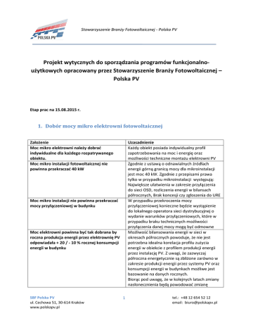 Stowarzyszenie Branży Fotowoltaicznej - Polska PV Projekt wytycznych do sporządzania programów funkcjonalnoużytkowych opracowany przez Stowarzyszenie Branży Fotowoltaicznej – Polska PV Etap prac na 15.08.2015 r. 1. Dobór mocy mikro elektrowni fotowoltaicznej Założenie Moc mikro elektrowni należy dobrać indywidualne dla każdego rozpatrywanego obiektu. Moc mikro instalacji fotowoltaicznej nie powinna przekraczać 40 kW Uzasadnienie Każdy obiekt posiada indywidualny profil zapotrzebowania na moc i energię oraz możliwości techniczne montażu elektrowni PV Zgodnie z ustawą o odnawialnych źródłach energii górną granicą mocy dla mikroinstalacji jest moc 40 kW. Zgodnie z przepisami prawa tylko w przypadku mikroinstalacji występują: Największe ułatwienia w zakresie przyłączenia do sieci OSD, rozliczenia energii w bilansach półrocznych, Brak koncesji czy zgłoszenia do URE W przypadku przekroczenia mocy przyłączeniowej konieczne będzie wystąpienie do lokalnego operatora sieci dystrybucyjnej o wydanie warunków przyłączeniowych, które w przypadku braku technicznych możliwości przyłączenia danej mocy mogą być odmowne Możliwość bilansowania energii w sieci w okresach półrocznych powoduje, że nie jest potrzebna idealna korelacja profilu zużycia energii w obiekcie z profilem produkcji energii przez instalację PV. Z uwagi, że zazwyczaj półroczna energetycznie są zbliżone zarówno w zakresie produkcji energii przez systemy PV oraz konsumpcji energii w budynkach możliwe jest bazowanie na danych rocznych. Biorąc pod uwagę, że w kolejnych latach zmiany nasłonecznienia będą powodować zmianę Moc mikro instalacji nie powinna przekraczać mocy przyłączeniowej w budynku Moc elektrowni powinna być tak dobrana by roczna produkcja energii przez elektrownię PV odpowiadała + 20 / - 10 % rocznej konsumpcji energii w budynku SBF Polska PV ul. Cechowa 51, 30-614 Kraków www.polskapv.pl 1 tel.: +48 12 654 52 12 email: [email protected] Stowarzyszenie Branży Fotowoltaicznej - Polska PV produkcji energii, jak również zmianie ulega konsumpcja energii w budynku. Dobór mocy w stosunku do wyliczonej wartości zaleca się dobrać w zakresie + 20 / - 10 %. Z tendencją lekkiego przewymiarowania mocy mając na uwadze że w kolejnych latach eksploatacji system fotowoltaiczny będzie tracił ok. 0,8% rocznie. Moc modułów fotowoltaicznych w kilowatach możliwa do zamontowania na dachu danego budynku lub przy budynku biorąc pod uwagę optymalne rozmieszczenie modułów. Aby określić możliwą do zamontowania moc modułów należy na tym etapie założyć minimalną sprawność modułów. W zależności od typu dachu, występujących elementów konstrukcyjnych można przyjąć, że stopień pokrycia dachu modułami na dachu skośnym mieści się w zakresie 75-95% Budynek musi mieć techniczne możliwości montażu danej mocy elektrowni PV Empiryczny wzór na wyliczenie technicznych możliwości montażu 𝑇𝑒𝑐ℎ𝑛𝑖𝑐𝑧𝑛𝑒 𝑚𝑜ż𝑙𝑖𝑤𝑜ś𝑐𝑖 𝑚𝑜𝑛𝑡𝑎ż𝑢 = 𝑃𝑜𝑤𝑖𝑒𝑟𝑧𝑐ℎ𝑛𝑖𝑎 ∗ 𝑆𝑃𝐷 1 𝑠𝑝𝑟 Gdzie: Techniczne możliwości montażu - Moc w kilowatach, jaką maksymalnie można zamontować na danym dachu Powierzchnia - powierzchnia dachu dostępna pod montaż instalacji fotowoltaicznej w [m2] spr - sprawność instalacji w ułamku dziesiętnym (wartość mniejsza od 1) SPD - Stopień Pokrycia Dachu modułami na dachu skośnym mieści się w zakresie 75-95% Wykorzystanie programów komputerowych do wyliczenia technicznych możliwości montażu Wykorzystanie programów komputerowych do wyliczenia mocy możliwej do uzyskania z danej powierzchni dachów daje dokładniejsze wyniki niż metoda empiryczna. Należy jednak pamiętać, że wyliczona do uzyskania moc będzie zależeć od sprawności modułu oraz od jego wymiarów. SBF Polska PV ul. Cechowa 51, 30-614 Kraków www.polskapv.pl 2 tel.: +48 12 654 52 12 email: [email protected] Stowarzyszenie Branży Fotowoltaicznej - Polska PV Wzór na wyliczenie mocy dla rozpatrywanego obiektu. 𝑊𝑎𝑟𝑦𝑛𝑘𝑖 𝑏𝑟𝑧𝑒𝑔𝑜𝑤𝑒 ≥ 𝑴𝒐𝒄 𝒊𝒏𝒔𝒕𝒂𝒍𝒂𝒄𝒋𝒊 ≤ 𝑇𝑒𝑐ℎ𝑛𝑖𝑐𝑧𝑛𝑒 𝑚𝑜ż𝑙𝑖𝑤𝑜ś𝑐𝑖 𝑚𝑜𝑛𝑡𝑎ż𝑢 𝑀𝑜𝑐 𝑖𝑛𝑠𝑡𝑎𝑙𝑎𝑐𝑗𝑖 = 𝑜𝑑 0,9 ∗ 𝐾𝑜𝑛𝑠𝑢𝑚𝑝𝑐𝑗𝑎 𝑒𝑛𝑒𝑟𝑔𝑖𝑖 1,2 ∗ 𝐾𝑜𝑛𝑠𝑢𝑚𝑝𝑐𝑗𝑎 𝑒𝑛𝑒𝑟𝑔𝑖𝑖 𝑑𝑜 𝑁𝑎𝑠 ∗ 𝑊𝑊 ∗ 𝑊𝐾𝑁 𝑁𝑎𝑠 ∗ 𝑊𝑊 ∗ 𝑊𝐾𝑁 Gdzie: Moc instalacji - wyliczona moc instalacji w [kW] Warunki brzegowe - moc instalacji nie większa niż 40 kW i nie większa od mocy przyłączeniowej Konsumpcja energii – roczna konsumpcja energii w budynku [kWh] Nas - nasłonecznienie na powierzchnię horyzontalną wyrażone w [kWh/m2/rok] WW - Współczynnik Wydajności = 100% – poziom wszystkich strat %, zazwyczaj od 80-85% WKN - Współczynniki Korekcji Nasłonecznienia - Zmiana nasłonecznienia w zależności od kąta pochylenia i azymutu. Techniczne możliwości montażu Tabela. 1. Współczynniki Korekcji Nasłonecznienia - Przykładowe średnie zmiany nasłonecznienia w zależności od konta pochylenia i azymutu. Odchylenie od południa Kąt -90 -85 -80 -75 -70 -65 -60 -55 -50 -45 -40 -35 -30 -25 -20 -15 -10 -5 0 0 1,00 1,00 1,00 1,00 1,00 1,00 1,00 1,00 1,00 1,00 1,00 1,00 1,00 1,00 1,00 1,00 1,00 1,00 1,00 5 1,00 1,00 1,00 1,01 1,01 1,01 1,02 1,02 1,02 1,03 1,03 1,03 1,03 1,03 1,03 1,03 1,04 1,04 1,04 10 0,99 1,00 1,01 1,01 1,02 1,02 1,03 1,04 1,04 1,05 1,05 1,05 1,06 1,06 1,06 1,06 1,07 1,07 1,07 15 0,98 0,99 1,00 1,01 1,02 1,03 1,04 1,05 1,05 1,06 1,07 1,07 1,08 1,08 1,09 1,09 1,09 1,09 1,10 20 0,97 0,98 1,00 1,01 1,02 1,03 1,04 1,05 1,06 1,07 1,08 1,09 1,09 1,10 1,10 1,11 1,11 1,11 1,01 25 0,96 0,97 0,99 1,00 1,02 1,03 1,05 1,06 1,0