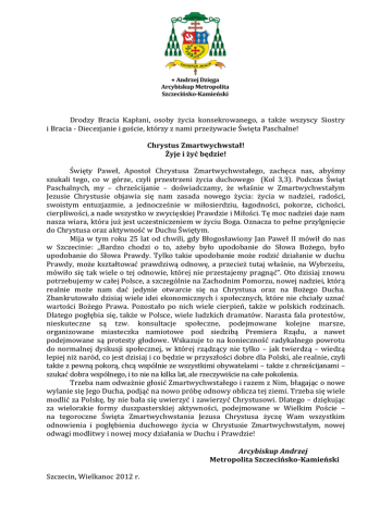 + Andrzej Dzięga Arcybiskup Metropolita Szczecińsko-Kamieński Drodzy Bracia Kapłani, osoby życia konsekrowanego, a także wszyscy Siostry i Bracia - Diecezjanie i goście, którzy z nami przeżywacie Święta Paschalne! Chrystus Zmartwychwstał! Żyje i żyć będzie! Święty Paweł, Apostoł Chrystusa Zmartwychwstałego, zachęca nas, abyśmy szukali tego, co w górze, czyli przestrzeni życia duchowego (Kol 3,3). Podczas Świąt Paschalnych, my – chrześcijanie – doświadczamy, że właśnie w Zmartwychwstałym Jezusie Chrystusie objawia się nam zasada nowego życia: życia w nadziei, radości, swoistym entuzjazmie, a jednocześnie w miłosierdziu, łagodności, pokorze, cichości, cierpliwości, a nade wszystko w zwycięskiej Prawdzie i Miłości. Tę moc nadziei daje nam nasza wiara, która już jest uczestniczeniem w życiu Boga. Oznacza to pełne przylgnięcie do Chrystusa oraz aktywność w Duchu Świętym. Mija w tym roku 25 lat od chwili, gdy Błogosławiony Jan Paweł II mówił do nas w Szczecinie: „Bardzo chodzi o to, ażeby było upodobanie do Słowa Bożego, było upodobanie do Słowa Prawdy. Tylko takie upodobanie może rodzić działanie w duchu Prawdy, może kształtować prawdziwą odnowę, a przecież tutaj właśnie, na Wybrzeżu, mówiło się tak wiele o tej odnowie, której nie przestajemy pragnąć”. Oto dzisiaj znowu potrzebujemy w całej Polsce, a szczególnie na Zachodnim Pomorzu, nowej nadziei, którą realnie może nam dać jedynie otwarcie się na Chrystusa oraz na Bożego Ducha. Zbankrutowało dzisiaj wiele idei ekonomicznych i społecznych, które nie chciały uznać wartości Bożego Prawa. Pozostało po nich wiele cierpień, także w polskich rodzinach. Dlatego pogłębia się, także w Polsce, wiele ludzkich dramatów. Narasta fala protestów, nieskuteczne są tzw. konsultacje społeczne, podejmowane kolejne marsze, organizowane miasteczka namiotowe pod siedzibą Premiera Rządu, a nawet podejmowane są protesty głodowe. Wskazuje to na konieczność radykalnego powrotu do normalnej dyskusji społecznej, w której rządzący nie tylko – jak twierdzą – wiedzą lepiej niż naród, co jest dzisiaj i co będzie w przyszłości dobre dla Polski, ale realnie, czyli także z pewną pokorą, chcą wspólnie ze wszystkimi obywatelami – także z chrześcijanami – szukać dobra wspólnego, i to nie na kilka lat, ale rzeczywiście na całe pokolenia. Trzeba nam odważnie głosić Zmartwychwstałego i razem z Nim, błagając o nowe wylanie się Jego Ducha, podjąć na nowo próbę odnowy oblicza tej ziemi. Trzeba się wiele modlić za Polskę, by nie bała się uwierzyć i zawierzyć Chrystusowi. Dlatego – dziękując za wielorakie formy duszpasterskiej aktywności, podejmowane w Wielkim Poście – na tegoroczne Święta Zmartwychwstania Jezusa Chrystusa życzę Wam wszystkim odnowienia i pogłębienia duchowego życia w Chrystusie Zmartwychwstałym, nowej odwagi modlitwy i nowej mocy działania w Duchu i Prawdzie! Arcybiskup Andrzej Metropolita Szczecińsko-Kamieński Szczecin, Wielkanoc 2012 r.