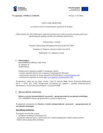 Nr zapytania: 1/POIR-3.2.1/2016/OL Olsztyn, 11.07.2016r. ZAPYTANIE OFERTOWE na dostawę wartości niematerialnych i prawnych do projektu „Wprowadzenie do oferty Masterpress opakowań kartonowych o właściwościach antyseptycznych oraz ograniczających migrację szkodliwych substancji chemicznych „ realizowanego w ramach Programu Operacyjnego Inteligentny Rozwój na lata 2014-2020 Działanie 3.2 Wsparcie wdrożeń wyników prac B+R Poddziałanie 3.2.1 Badania na rynek 1. Zamawiający MASTERPRESS SPÓŁKA AKCYJNA ul. Lubelska 46 10-406 Olsztyn Upublicznienie zapytania nastąpiło w następujący sposób: - wysłano zapytanie ofertowe do co najmniej 3 potencjalnych Oferentów - zamieszczono zapytanie na stronie internetowej Wnioskodawcy www.masterpress.com - zamieszczono zapytanie na stronie http://www.parp.gov.pl/zamowienia-1420 Przedmiotowy zakup nie jest objęty Ustawą z dnia 29 stycznia 2004r. Prawo Zamówień Publicznych (Dz.U. z 2015r. poz. 2164). Postępowanie prowadzone jest zgodnie z zasadami konkurencyjności określonymi w wytycznych horyzontalnych i wytycznych POIR 2. Opis przedmiotu zamówienia Dostawa wartości niematerialnych i prawnych – oprogramowanie do zarządzania technologią CPV: 48000000-8 Pakiety oprogramowania i systemy komputerowe Przedmiotem zamówienia jest Dostawa wartości niematerialnych i prawnych – oprogramowanie do zarządzania technologią Specyfikacja techniczna: Wymagania stawiane dla systemu 1. zarządzanie produkcją/ technologią m.in. - zarządzanie miejscami pracy i umieszczenie ich w planie produkcyjnym (tablica dyspozytorska); - budowa operacyjnego planu produkcji; - automatyczne pokazanie statusów zleceń; - generowanie analiz i raportów (np. wydajność maszyny) , w tym z uwzględnieniem standardów Lean Manufacturing lub równoważnych; - liczenie kosztów wytworzenia zlecenia - zgłaszanie usterek; - ustalenie planu konserwacyjnego dla wszystkich urządzeń; - generowanie raportów na temat stanu prac w toku dla księgowości (rozpoczęte produkty, wykonana praca na niezafakturowanych zleceniach ze zbierania danych, status na magazynie) 2. zarządzanie magazynem m.in.: - ewidencja materiału; - zintegrowany moduł gospodarki surowcami z panowaniem produkcji (podłoża, farby, lakiery, materiały pomocnicze) - definiowanie większej ilości; - uwzględniona specyfikacja poligraficznej działalności; - zarzadzanie magazynem metodą FIFO lub za pomoczą średniej ceny 3. zarządzanie zamówieniami m.in. - ewidencja klientów; - kalkulacje - oferty; - zarządzanie zleceniami; - harmonogramy; - reklamacje 4. zarządzanie rozliczeniami m.in. - faktury, - płatności 5. dostęp przez portal internetowy (w tym odpowiednie rozwiązania dla klientów dostępne on-line) 6. interfejs użytkownika systemu w całości w języku polskim Oferta powinna zawierać pełną funkcjonalność dla minimum 25 stanowisk Oferent zapewni instalację, konfigurację oraz przedmiotowego oprogramowania. szczegółową prezentację obsługi systemu z zakresie 3. Termin realizacji zamówienia Termin dostarczenia przedmiotu zamówienia z pełną funkcjonalnością max. do dnia 31.12.2016 r. 4. Sposób przygotowania oferty i warunku udziału w postępowaniu 4.1 Zawartość oferty 4.1.1 Oferta powinna zostać złożona na formularzu ofertowym stanowiącym załącznik do niniejszego zapytania (załącznik nr 1) 4.1.2 Oferta powinna zawierać podpisane oświadczenia stanowiące załącznik 2 oraz załącznik 3 do zapytania ofertowego 4.1.3 Oferta powinna zawierać wykaz wykonanych usług wraz z podaniem ich przedmiotu, dat wykonania i podmiotów, na rzecz których usługi zostały wykonane (10 sprzedanych i wdrożonych systemów w branży produkcji opakowań kartonowych w tym minimum 5 na terenie Polski). Wykaz należy sporządzić zgodnie z Załącznikiem nr 4 do Zapytania Ofertowego 4.1.4 Oferta powinna być opatrzona pieczątką firmową 4.1.5 Oferta powinna posiadać: adres siedziby Oferenta oraz dane kontaktowe, datę sporządzenia, termin ważności oferty, cenę netto za system , cenę netto za wdrożenie oraz kwotę opłat Maintenance (przez okres 10 lat z podziałem na lata), 4.1.6 Do oferty należy załączyć pełną specyfikację oprogramowania 4.2 Warunki udziału w postępowaniu ofertowym 4.2.1 Oferent powinien wykazać się spełnieniem następujących warunków: Posiada uprawnienia do wykonywania określonej działalności lub czynności jeśli przepisy prawa nakładają taki obowiązek; Posiada niezbędną wiedzę i doświadczenie; Dysponuje potencjałem technicznym i osobami zdolnymi do wykonania zamówienia; Znajduje się w sytuacji ekonomicznej i finansowej zapewniającej wykonanie zamówienia Nie podlega wykluczeniu z postępowania na podstawie art. 24 ust. 1 i 2 ustawy Prawo Zamówień Publicznych Z postępowania o udzielenie zamówienia wyklucza się Oferentów zgodnie z przesłankami wskazanymi w oświadczeniu stanowiącym załącznik nr 2 do zapytania. Zamawiający dokona weryfikacji spełnienia warunków na podstawie oświadczenia zawartego w formularzu ofertowym 4.2.2 Wiedza i doświadczenie Wymagane jest minimum 10 sprzedanych i wdrożonych systemów w branży produkcji opakowań kartonowych. Zamawiający uzna warunek za spełniony jeżeli Oferent wykaże, że wykonał 10 wdrożeń w tym na terenie Rzeczypospolitej Polskiej co najmniej 5 sprzedaży systemu informatycznego wspierającego zarządzanie produkcją w branży opakowań kartonowych (jest to specyfika produkcji Zamawiającego). W razie konieczności, szczególnie gdy wykaz będzie budził wątpliwości Zamawiąjącego, Zamawiąjący może zwrócić się bezpośrednio do właściwego podmiotu, na rzecz którego usługi były wykonane, o przedłożenie dodatkowych informacji lub dokumentów bezpośrednio Zamawiającemu. Ocena spełniania warunków wymaganych od Oferenta zostanie dokonana wg formuły “spełnia/nie spełnia” na podstawie dokumentów i oświadczeń załączonych do 