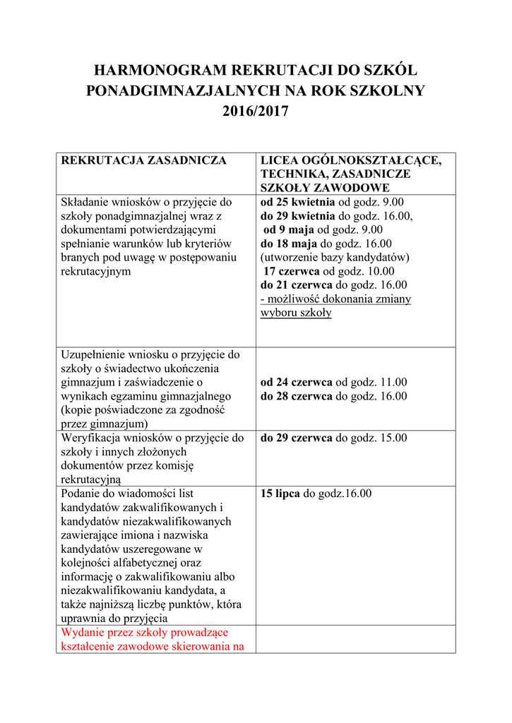 Harmonogram rekrutacji na rok szkolny 2016/2017