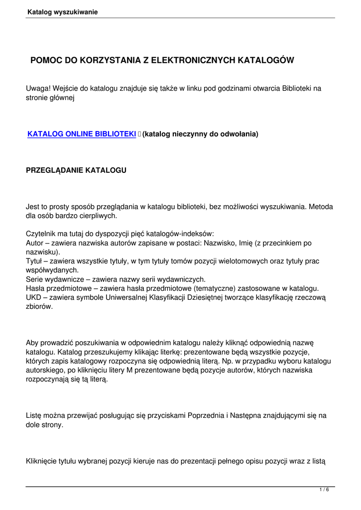 Katalog wyszukiwanie POMOC DO KORZYSTANIA Z ELEKTRONICZNYCH KATALOGÓW Uwaga! Wejście do katalogu znajduje się także w linku pod godzinami otwarcia Biblioteki na stronie głównej KATALOG ONLINE BIBLIOTEKI (katalog nieczynny do odwołania) PRZEGLĄDANIE KATALOGU Jest to prosty sposób przeglądania w katalogu biblioteki, bez możliwości wyszukiwania. Metoda dla osób bardzo cierpliwych. Czytelnik ma tutaj do dyspozycji pięć katalogów-indeksów: Autor – zawiera nazwiska autorów zapisane w postaci: Nazwisko, Imię (z przecinkiem po nazwisku). Tytuł – zawiera wszystkie tytuły, w tym tytuły tomów pozycji wielotomowych oraz tytuły prac współwydanych. Serie wydawnicze – zawiera nazwy serii wydawniczych. Hasła przedmiotowe – zawiera hasła przedmiotowe (tematyczne) zastosowane w katalogu. UKD – zawiera symbole Uniwersalnej Klasyfikacji Dziesiętnej tworzące klasyfikację rzeczową zbiorów. Aby prowadzić poszukiwania w odpowiednim katalogu należy kliknąć odpowiednią nazwę katalogu. Katalog przeszukujemy klikając literkę: prezentowane będą wszystkie pozycje, których zapis katalogowy rozpoczyna się odpowiednią literą. Np. w przypadku wyboru katalogu autorskiego, po kliknięciu litery M prezentowane będą pozycje autorów, których nazwiska rozpoczynają się tą literą. Listę można przewijać posługując się przyciskami Poprzednia i Następna znajdującymi się na dole strony. Kliknięcie tytułu wybranej pozycji kieruje nas do prezentacji pełnego opisu pozycji wraz z listą 1/6 Katalog wyszukiwanie egzemplarzy. WYSZUKIWANIE PROSTE Jest to funkcja podobna do przeglądania katalogu, lecz dająca większe możliwości w szybkim dotarciu do poszukiwanych pozycji. Czytelnik ma tutaj do dyspozycji pięć katalogów-indeksów: Autor – zawiera nazwiska autorów zapisane w postaci: Nazwisko, Imię (z przecinkiem po nazwisku). Tytuł – zawiera wszystkie tytuły, w tym tytuły tomów pozycji wielotomowych oraz tytuły prac współwydanych. Serie wydawnicze – zawiera nazwy serii wydawniczych. Hasła przedmiotowe – zawiera hasła przedmiotowe (tematyczne) zastosowane w katalogu. UKD – zawiera symbole Uniwersalnej Klasyfikacji Dziesiętnej tworzące klasyfikację rzeczową zbiorów. Aby przeglądać dany katalog wystarczy wybrać go z rozwijalnego menu, a następnie potwierdzić wybór kliknięciem przycisku Wyszukaj. Przed kliknięciem „Wyszukaj” można również dopisać szukaną frazę. Najczęściej prowadzimy poszukiwania wpisując początek szukanego wyrażenia, np. w indeksie autorskim – nazwisko, lub początkowe litery nazwiska, w indeksie tytułowym – pierwsze, lub kilka pierwszych słów tytułu. Można również szukać wyrażeń zawierających wprowadzaną frazę wyszukiwawczą, np. dowolne słowo zwarte w tytule książki, albo dowolne wyrażenie, które może być zawarte w haśle przedmiotowym. Aby skorzystać z tego sposobu wyszukiwania należy uprzednio zaznaczyć opcję Dowolny fragment pola. Po kliknięciu przycisku Wyszukaj zostanie wyświetlona lista znalezionych pozycji. Listę można przewijać posługując się przyciskami znajdującymi się na dole strony. Kliknięcie tytułu wybranej pozycji kieruje nas do prezentacji pełnego opisu pozycji wraz z listą egzemplarzy. 2/6 Katalog wyszukiwanie WYSZUKIWANIE ZŁOŻONE Wyszukiwanie złożone jest używane w tych przypadkach, kiedy wyszukiwanie proste zwraca zbyt dużo nieadekwatnych odpowiedzi. Takie sytuacje zdarzają się tym częściej, im większy jest katalog biblioteki. W wyszukiwaniu złożonym podajemy zwykle więcej niż jedną informację wyszukiwawczą. Natomiast pomiędzy informacjami wyszukiwawczymi wybieramy spójniki logiczne: „lub”, „oraz”, „bez”. lub – wyszukujemy pozycje zawierające co najmniej jedną z wpisanych fraz, oraz – wyszukujemy pozycje zawierające wszystkie wpisane frazy, bez – wyszukujemy pozycje, które nie zawierają wskazanej frazy. Formularz wyszukiwania złożonego pozwala wyszukiwać książki na podstawie indeksów wszystkich indeksów dostępnych również w przeglądaniu katalogu. Dodatkowo istnieje możliwość przeszukiwania całości opisu (opcja Wszystkie pola). Co pozwala na wyszukanie np. książek określonego wydawcy. Listę wyszukanych pozycji można dodatkowo zawęzić do określonych lat, w których książka się ukazała (pola Rok wydania). Można również ograniczyć wyszukiwanie do określonego typu dokumentu. Domyślnie poszukiwane są wszystkie rodzaje dokumentów, co oznacza pojawiający się w polu Typ dokumentu napis Wszystkie typy. Aby ograniczyć poszukiwanie do określonego typu dokumentu należy wybrać jeden z opisanych poniżej: Książki Dokumenty dźwiękowe, czyli głównie nagrania muzyczne znajdujące się na „tradycyjnych” nośnikach – płytach winylowych, kasetach, płytach CD. Dokumenty filmowe, czyli filmy nagrane na taśmach, kasetach lub płytach DVD. Dokumenty elektroniczne – tutaj znajdziemy wszelkie zbiory biblioteki zapisane na nośnikach „komputerowych”, a więc: wydawnictwa multimedialne, programy i gry komputerowe, informacyjne bazy danych; możemy tutaj również znaleźć opisy bibliograficzne stron WWW, z podanymi odsyłaczami do tych stron. Druki muzyczne – znajdziemy tutaj opisy bibliograficzne nut, o ile biblioteka gromadzi takie wydawnictwa. Kartoteka - ta część katalogu zawiera głównie opisy bibliograficzne artykułów z czasopism, możemy tam również znaleźć np. skierowanie do fragmentów książek. Celem tworzenia kartoteki jest dostarczenie aktualnych, szczegółowych informacji na tematy interesujące czytelników biblioteki, głównie w oparciu o materiały zamieszczane w czasopismach. Czasopisma – tutaj znajdziemy spis prenumerowanych przez bibliotekę czasopism, łącznie w wykazem posiadanych w zbiorach egzemplarzy tych czasopism. 3/6 Katalog wyszukiwanie Wyszukiwanie złożone posiada następujące właściwości: Możemy poszukiwa