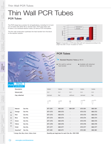 1 Cell/ Tissue Culture 2 HTSMicroplates 3 Immunology/ HLA Thin Wall PCR Tubes PCR Tubes The PCR range has a product for all applications, including 0.2 ml and 0.5 ml tubes with either flat or domed caps, PCR tube strips with 8 tubes or as individual reaction tubes, as well as PCR microplates. The thin wall construction optimises the heat transfer from the block to the reaction solution. 5 Tubes/MultiPurpose Beakers 4 Microbiology/ Bacteriology Thin Wall PCR Tubes Figure 1: Evaporation in PCR tubes filled with H2O measured according to the weight loss after 2 hours' incubation at 100°C. 672 274 6 Liquid Handling PCR Tubes 7 Molecular Biology Standard Reaction Tubes p. 13 I 4 ■ 682 274 Available with attached domed or flat caps 8 Protein Crystallisation 671 272 Description tubes tubes tubes tubes tubes Volume [ml] 0.2 0.2 0.2 0.5 0.5 Cap, attached domed flat without domed flat Natural Cat.-No. 671 201 683 201 684 201 672 201 682 201 R Orange Cat.-No. 671 272 683 272 - 672 272 682 272 U Red Cat.-No. 671 273 683 273 - 672 273 682 273 O DNase-free RNase-free human DNA-free non-Pyrogenic Blue Cat.-No. 671 274 683 274 - 672 274 682 274 L PCR Green Cat.-No. 671 275 683 275 - 672 275 682 275 Yellow Cat.-No. 671 276 683 276 - 672 276 682 276 Violet Cat.-No. 671 277 683 277 - 672 277 682 277 Assorted*) Cat.-No. 671 281 683 271 - 672 281 682 281 10 Biochips/ Microfluidics 9 Separation ■ 683 272 C O 11 CryoTechnics 12 Lids/Sealers/ CapMats 13 Reaction Tubes/ Analyser Cups 14 Accessories Thin wall for optimal heat transfer *) Orange, Red, Blue, Green, Yellow, Violet 7 2 www.gbo.com/bioscience Quantity per bag/case for each Cat.-No.: 500/1000