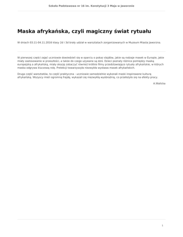 Szkoła Podstawowa nr 16 im. Konstytucji 3 Maja w Jaworznie Maska afrykańska, czyli magiczny świat rytuału W dniach 03.11-04.11.2016 klasy 2d i 3d brały udział w warsztatach zorganizowanych w Muzeum Miasta Jaworzna. W pierwszej części zajęć uczniowie dowiedzieli się w oparciu o pokaz slajdów, jakie są rodzaje masek w Europie, jakie miały zastosowanie w przeszłości, a także do czego używane są dziś. Dzieci poznały różnice pomiędzy maską europejską a afrykańską, miały okazję zobaczyć również krótkie filmy przedstawiające rytuały afrykańskie, w których maska odgrywa kluczową rolę. Prelekcji towarzyszyła niezwykła wystawa masek afrykańskich. Druga część warsztatów, to część praktyczna - uczniowie samodzielnie wykonali maski inspirowane kulturą afrykańską. Wszyscy mieli ogromną frajdę, wykazali się niezwykłą wyobraźnią, co przełożyło się na efekty pracy. A.Walicka 1