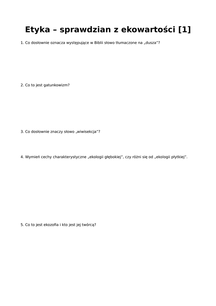 Etyka – sprawdzian z ekowartości [1] 1. Co dosłownie oznacza występujące w Biblii słowo tłumaczone na „dusza”? 2. Co to jest gatunkowizm? 3. Co dosłownie znaczy słowo „wiwisekcja”? 4. Wymień cechy charakterystyczne „ekologii głębokiej”, czy różni się od „ekologii płytkiej”. 5. Co to jest ekozofia i kto jest jej twórcą? Etyka - sprawdzian z ekowartości [2] 1. Co dosłownie znaczy słowo „człowiek” lub „homo”? 2. O czym mówi Hipoteza Gai i kto jest jej twórcą? 3. Opisz najbardziej charakterystyczną cechę praw zwierząt. 4. Co dosłownie znaczy słowo „ekologia”? 5. Czym jest tzw. „efekt motyla”?
