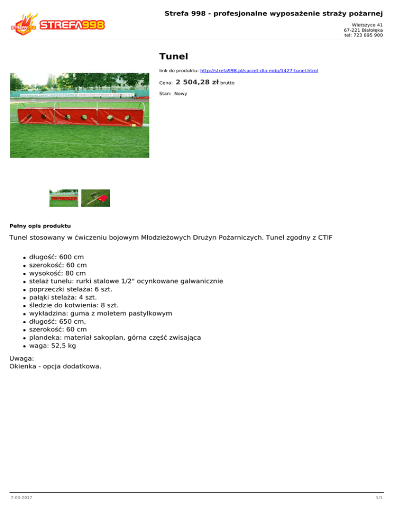 Strefa 998 - profesjonalne wyposażenie straży pożarnej Wietszyce 41 67-221 Białołęka tel: 723 895 900 Tunel link do produktu: http://strefa998.pl/sprzet-dla-mdp/1427-tunel.html Cena: 2 504,28 zł brutto Stan: Nowy Pełny opis produktu Tunel stosowany w ćwiczeniu bojowym Młodzieżowych Drużyn Pożarniczych. Tunel zgodny z CTIF długość: 600 cm szerokość: 60 cm wysokość: 80 cm stelaż tunelu: rurki stalowe 1/2" ocynkowane galwanicznie poprzeczki stelaża: 6 szt. pałąki stelaża: 4 szt. śledzie do kotwienia: 8 szt. wykładzina: guma z moletem pastylkowym długość: 650 cm, szerokość: 60 cm plandeka: materiał sakoplan, górna część zwisająca waga: 52,5 kg Uwaga: Okienka - opcja dodatkowa. 7-03-2017 1/1