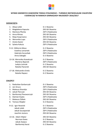 WYNIKI GMINNYCH ZAWODÓW TENISA STOŁOWEGO – TURNIEJE INDYWIDUALNE CHŁOPCÓW I DZIEWCZĄT W RAMACH GIMNAZJADY MŁODZIEŻY 2016/2017 DZIEWCZĘTA 1. 2. 3. 4. 5. 6. 7. 8. Alicja Lelek Magdalena Kapusta Martyna Płonka Anna Klimas Maja Kasprowicz Weronika Lupa Aneta Kazior Sylwia Kałuża G-1 Skawina ZKS GK Skawina ZSP G Radziszów ZKS GK Skawina ZKS GK Skawina ZSP G Radziszów ZKS GK Skawina ZSP G Radziszów 9-12. Wiktoria Meus Ewelina Leniartek Gabriela Szczyrbak Anna Zabagło G-2 Skawina ZSP G Radziszów ZSP G Radziszów G-2 Skawina 13-16. Weronika Kowalczyk Marlena Bajorek Judyta Leśniak Natalia Paciorek G-2 Skawina ZSP G Radziszów G-2 Skawina ZKS GK Skawina 17-18. Aleksandra Grela Natalia Rapacz G-2 Skawina G-2 Skawina CHŁOPCY 1. 2. 3. 4. 5. 6. 7. 8. Radosław Garbarczyk Jan Gruca Mateusz Brandys Jakub Florczyk Bartłomiej Piwowarczyk Damian Kopta Mateusz Żółtek Tomasz Majder G-1 Skawina ZSP G Radziszów ZSP G Radziszów ZKS GK Skawina ZKS GK Skawina ZSP G Radziszów ZKS GK Skawina G-2 Skawina 9-12. Igor Nowicki Jakub Lelek Jakub Szczepaniak Joachim Jezioro G-1 Skawina ZSP G Radziszów ZSP G Radziszów ZKS GK Skawina 13-16. Adam Wątor Norman Kawa Jakub Zwijacz Bartłomiej Karaś ZKS GK Skawina G-2 Skawina ZKS GK Skawina G-2 Skawina