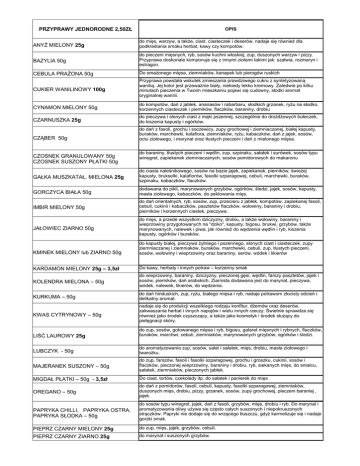 PRZYPRAWY JEDNORODNE 2,50ZŁ OPIS ANYŻ MIELONY 25g do mięs, warzyw, a także, ciast, ciasteczek i deserów. nadaje się również dla podkreślania smaku herbat, kawy czy kompotów. BAZYLIA 50g do pieczeni mięsnych, ryb, sosów kuchni włoskiej, zup, duszonych warzyw i pizzy. Przyprawa doskonale komponuje się z innymi ziołami takimi jak: szałwia, rozmaryn i estragon. CEBULA PRAŻONA 50g Do smażonego mięsa, ziemniaków, kanapek lub pierogów ruskich CUKIER WANILINOWY 100g Przyprawa powstała wskutek zmieszania prawdziwego cukru z syntetyzowaną wanilią. Jej kolor jest przeważnie biały, niekiedy lekko kremowy. Zaledwie po kilku minutach pieczenia w Twoim mieszkaniu pojawi się cudowny, słodki aromat oryginalnej wanilii. CYNAMON MIELONY 50g do kompotów, dań z jabłek, ananasów i rabarbaru, słodkich grzanek, ryżu na słodko, korzennych ciasteczek i pierników, flaczków, baraniny, drobiu CZARNUSZKA 25g do pieczywa i słonych ciast z mąki pszennej, szczególnie do drożdżowych bułeczek, do kiszenia kapusty i ogórków. CZĄBER 50g do dań z fasoli, grochu i soczewicy, zupy grochowej i ziemniaczanej, białej kapusty, buraków, marchewki, kalafiora, ziemniaków, ryżu, kabaczków, dań z jajek, sosów, octu ziołowego, i marynat oraz tłustych pieczeni i dań z mielonego mięsa. CZOSNEK GRANULOWANY 50g CZOSNEK SUSZONY PŁATKI 50g do baraniny, tłustych pieczeni i wędlin, zup, szpinaku, sałatek i surówek, sosów typu winegret, zapiekanek ziemniaczanych, sosów pomidorowych do makaronu GAŁKA MUSZKATAŁ. MIELONA 25g do ciasta naleśnikowego, sosów na bazie jajek, zapiekanek, pierników, świeżej kapusty, brukselki, kalafiorów, fasolki szparagowej, cebuli, marchewki, buraków, szpinaku, kabaczków, flaczków. GORCZYCA BIAŁA 50g dodawana do pikli, marynowanych grzybów, ogórków, śledzi, jajek, sosów, kapusty, masła ziołowego, kabaczków, do peklowania mięs. IMBIR MIELONY 50g do dań orientalnych, ryb, sosów, zup, przecieru z jabłek, kompotów, zapiekanej fasoli, cebuli, cukinii i kabaczków, pasztetów flaczków, wołowiny, baraniny i drobiu, pierników i korzennych ciastek, pieczywa. JAŁOWIEC ZIARNO 50g do mięs, a przede wszystkim dziczyzny, drobiu, a także wołowiny, baraniny i wieprzowiny przygotowanych na "dziko", kapusty, bigosu, brukwi, grzybów, także marynowanych, nalewek i piwa, jak również do wędzenia wędlin i ryb, kiszenia kapusty, ogórków i buraków. KMINEK MIELONY lub ZIARNO 50g do kapusty białej, pieczywa żytniego i pszennego, słonych ciast i ciasteczek, zupy ziemniaczanej i ziemniaków, buraków, marchewki, cebuli, zup, tłustych pieczeni, sosów, wołowiny i wieprzowiny oraz baraniny, serów, wódek i likierów KARDAMON MIELONY 25g – 3,5zł Do kawy, herbaty i innych potraw – korzenny smak KOLENDRA MIELONA – 50g do wieprzowiny, baraniny, dziczyzny, pieczonej gęsi, wędlin, farszy pasztetów, jajek i sosów, pierników, dań arabskich. Ziarnista dodawana jest do marynat, pieczywa, wódek, nalewek, likierów, do wędzenia. KURKUMA – 50g do dań hinduskich, zup, ryżu, białego mięsa i ryb, nadaje potrawom złocisty odcień i delikatny aromat. KWAS CYTRYNOWY – 50g nadaje się do produkcji wszelkiego rodzaju konfitur, dżemów oraz deserów, zakwaszania herbat i innych napojów i wielu innych rzeczy. Świetnie sprawdza się również jako środek czyszczący, a także jako kosmetyk i środek służący do pielęgnacji skóry. LIŚĆ LAUROWY 25g do zup, sosów, gotowanego mięsa i ryb, bigosu, galaret mięsnych i rybnych, flaczków, buraków, marchwi, cebuli, ziemniaków, marynowanych grzybów, ogórków i śledzi. LUBCZYK - 50g do aromatyzowania zup, sosów, sałat i sałatek, mięs, drobiu, masła ziołowego i twarożku. MAJERANEK SUSZONY – 50g do zup, farszów, fasoli i fasolki szparagowej, grochu i groszku, cukinii, sosów i flaczków, pieczonej wieprzowiny, baraniny i drobiu, ryb, siekanych mięs, do smalcu, sałatek, ziemniaków, pieczonych jabłek. MIGDAŁ PŁATKI – 50g - 3,5zł Do ciast, tortów, czekolady itp. do sałatek i panierek do mięs OREGANO – 50g do dań z pomidorów, fasoli, cebuli, kapusty, fasolki szparagowej, ziemniaków, duszonych mięs, drobiu, pizzy, grzanek, sosów, zupy grochowej, pieczeni baraniej , jajek. PAPRYKA CHILLI, PAPRYKA OSTRA, PAPRYKA SŁODKA – 50g do sosów typu winegret, jajek, dań z fasoli, grzybów, mięs, drobiu i ryb. Do marynat i aromatyzowania oliwy używa się często całych suszonych i niepokruszonych strączków. Papryki nie dodaje się do wrzącego tłuszczu, gdyż karmelizuje się i nadaje gorzki smak. PIEPRZ CZARNY MIELONY 25g do zup, mięs, jajek, grzybów, cebuli. PIEPRZ CZARNY ZIARNO 25g do marynat i suszonych grzybów. PIEPRZ ZIOŁOWY – 50g j. w. ROZMARYN – 50g do ryb, drobiu, duszonych, pieczonych i smażonych tłustych mięs, sosów, ziemniaków. TYMIANEK – 50g do zup, rosołów, tłustych mięs, pieczeni wołowej, wieprzowiny, dziczyzny, wątróbki, pieczonego drobiu i ryb, pomidorów, marchewki, roślin strączkowych, zielonego groszku, serów, farszów mięsnych i jarzynowych, pasztetów i wędlin, gulaszu i paprykarzy, zapiekanek i grzanek, dań z grilla, do kiszenia i marynowania ogórków, octu ziołowego, nalewek i likierów. ZIELE ANGIELSKIE MIELONE – 50g dodawane do zup, rosołu, dań mięsnych, sosów, galaret mięsnych i rybnych, pieczeni, bigosu, flaczków, wędlin, grzybów. ZIELE ANGIELSKIE ZIARNO 25g j. w. ZIOŁA PROWANSALSKIE – 50g do zup ziołowych, sosów, sałatek, twarogu, tłustych mięs pieczonych i mielonych, drobiu i ryb, farszów mięsnych, potraw z grilla, grzanek, pizzy oraz ciast przypominających pizzę. PRZYPRAWY MIESZANE – 2,5zł SKŁAD MIESZANKI 1000 WYSP – 50g papryka zielona, papryka czerwona, cebula, pietruszka. Zastosowanie: do marynat, mięs, warzyw, sosów. BULION WOŁOWY – 50g suszone warzywa (marchew, pietruszka, cebula, pasternak, seler), pieprz czarny, sól, cukry, aromat mięsa. Zastosowanie: może być 