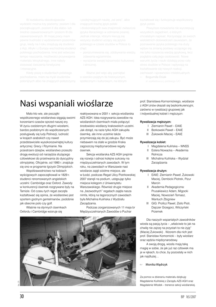 W kształceniu obcokrajowców wydzielić można trzy poziomy: poziom I dla początkujących, poziom II dla słabo- lub średnio zaawansowanych i poziom III dla zaawansowanych. W mojej pracy mam pewne trudności z wydzielaniem poziomów grup, kiedy na I roku znajdują się studenci z Azji, Afryki i z Europy wschodniej-studenci polskiego pochodzenia. Inne jest wówczas tempo nauczania, możliwości przyswajania materiału leksykalnego, inne należy stosować ćwiczenia fonetyczne i intonacyjne. Kiedy piszę o studentach polskiego pochodzenia, mam na myśli studentów polonijnych albo nie znających polszczyzny i podejmujących naukę „od zera”, albo znających trochę język polski i doskonalących swa znajomość zwłaszcza języka literackiego w odmianie pisanej. Jednak intencje, którymi kierują się wszyscy studenci uczący się języka polskiego w czasie studiów w Polsce to chęć: – porozumiewania się, zdobywania wiedzy, zdawania egzaminów, – wyrażania swojej tożsamości kulturowej i etnicznej. Ważne jest więc aby pamiętać o szeroko pojętym tle historycznym, społecznym i kulturowym, na którym Nasi wspaniali wioślarze Mało kto wie, ale początki współczesnego wioślarstwa sięgają swoimi korzeniami czasów sprzed naszej ery. W życiu codziennym długimi wiosłami, bardzo podobnymi do współczesnych posługiwały się ludy Polinezji, ludność w krajach arabskich czy nawet przedstawiciele wysokorozwiniętej kultury antycznej: Grecy i Rzymianie. Na przestrzeni dziejów, wioślarstwo przeszło drogę ewolucji od narzędzia służącego człowiekowi do przetrwania do dyscypliny olimpijskiej. Oficjalnie, od 1990 r. znajduje się ono w programie Igrzysk Olimpijskich. Współzawodnictwo na łodziach wyścigowych zapoczątkowali w 1829 r. studenci renomowanych angielskich uczelni: Cambridge oraz Oxford. Zawody w konkurencji ósemek rozgrywane były na Tamizie. Od czasu tych regat zaczęła kształtować się opinia, że wioślarstwo jest sportem godnym gentelmanów, podobnie jak obecnie polo czy golf. Właśnie na słynnych ósemkach Oxfordu i Cambridge wzoruje się reaktywowana w 2001 r. sekcja wioślarska AZS AGH. Idea rozgrywania zawodów na wioślarskich ósemkach miała połączyć środowisko wioślarzy krakowskich uczelni. Jak dotąd, na razie tylko AGH zakupiła ósemkę, ale inne uczelnie także przymierzają się do jej zakupu. Być może niebawem na stałe w grodzie Kraka zagoszczą międzynarodowe regaty ósemek. Sekcja wioślarska AZS AGH prężnie się rozwija i odnosi kolejne sukcesy na międzyuczelnianych zawodach. W tym roku, na zawodach w Warszawie nasi wioślarze zajęli siódme miejsce, ale w Łodzi, podczas Regat Ulicy Piotrkowskiej 2007 stanęli na podium, ustępując tylko miejsca kolegom z Uniwersytetu Warszawskiego. Również drugie miejsce na „bezwodnych” regatach zajęła nasza nimfa, którą na tegorocznych zawodach była Michalina Kulińska z Wydziału Zarządzania. Podczas zorganizowanych 11 maja br Międzyuczelnianych Zawodów o Puchar kształtował się i funkcjonuje współczesny język polski. Powyższe rozważania nie wyczerpują wszystkich zagadnień, o których chciałabym napisać. Korzystając ze swoich wieloletnich doświadczeń zauważam, że poznawanie języka polskiego ma duży wpływ na zmianę postawy uczącego się; nie tylko rozszerza wiedzę językową, lecz pogłębia całą jego osobowość. Nowe warunki życia i nauki działają przez cały okres studiów w Polsce i wpływają na kształtowanie się nowych reakcji, zachowań i sprawności intelektualnych. Bogumiła Osiak st. wykładowca j. polskiego SJO prof. Stanisława Komornickiego, wioślarze z AGH znów okazali się bezkonkurencyjni, zarówno w rywalizacji grupowej jak i indywidualnej kobiet i mężczyzn: Rywalizacja mężczyzn: III Ziemianin Paweł – EAIiE III Borkowski Paweł – EAIiE III Żukowski Maciej – EAIiE Rywalizacja kobiet: III Magdalena Kulińska – WNSS III Estera Nowacka – Akademia Rolnicza III Michalina Kulińska – Wydział Zarządzania Rywalizacja drużyn: III EAIiE: Ziemianin Paweł, Żukowski Maciej, Dembicki Piotrek, Pizur Marcin III Akademia Pedagogiczna: Prusakiewicz Adam, Migocki Maciej, Nowocień Tomasz, Wantuch Zbigniew III GiG: Proficz Paweł, Zioło Piotr, Dajczer Grzegorz, Wilczyński Przemek Dla naszych wspaniałych zawodników wiosła są pasją życia – „właściwie to jak na chwilę nie zajrzę na przystań to nie żyję” (Maciej Żukowski) . Wzorem dla nich jest prof. Stanisław Komornicki – były wioślarz oraz sędzia międzynarodowy. A swoją drogą, wiosła mają taką magię w sobie, że jak już raz człowiek ma je w rękach, to chce, by pozostały w nich jak najdłużej… Monika Wądrzyk Za pomoc w zbieraniu materiału dziękuję: fot. ZS Magdalenie Kulińskiej z Zarządu AZS AGH oraz Magdalenie Włodek – trenerce sekcji wioślarskiej. 30 BIP 165/2007